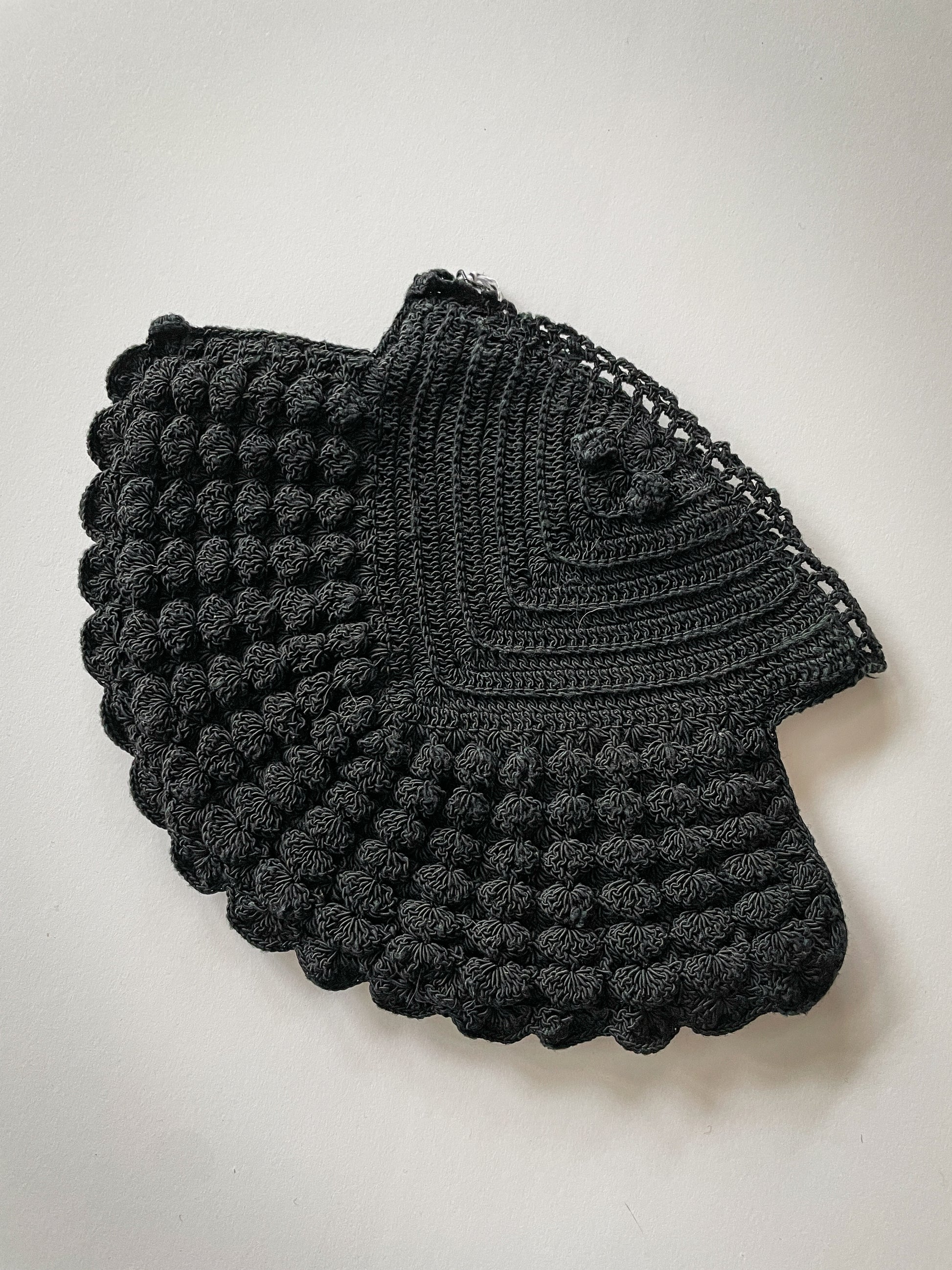 Lovely black crochet purse circa 1920s with Talon zipper closure, synthetic lining. Unique scalloped body design with seashell vibes! Perfect small purse for a night out.