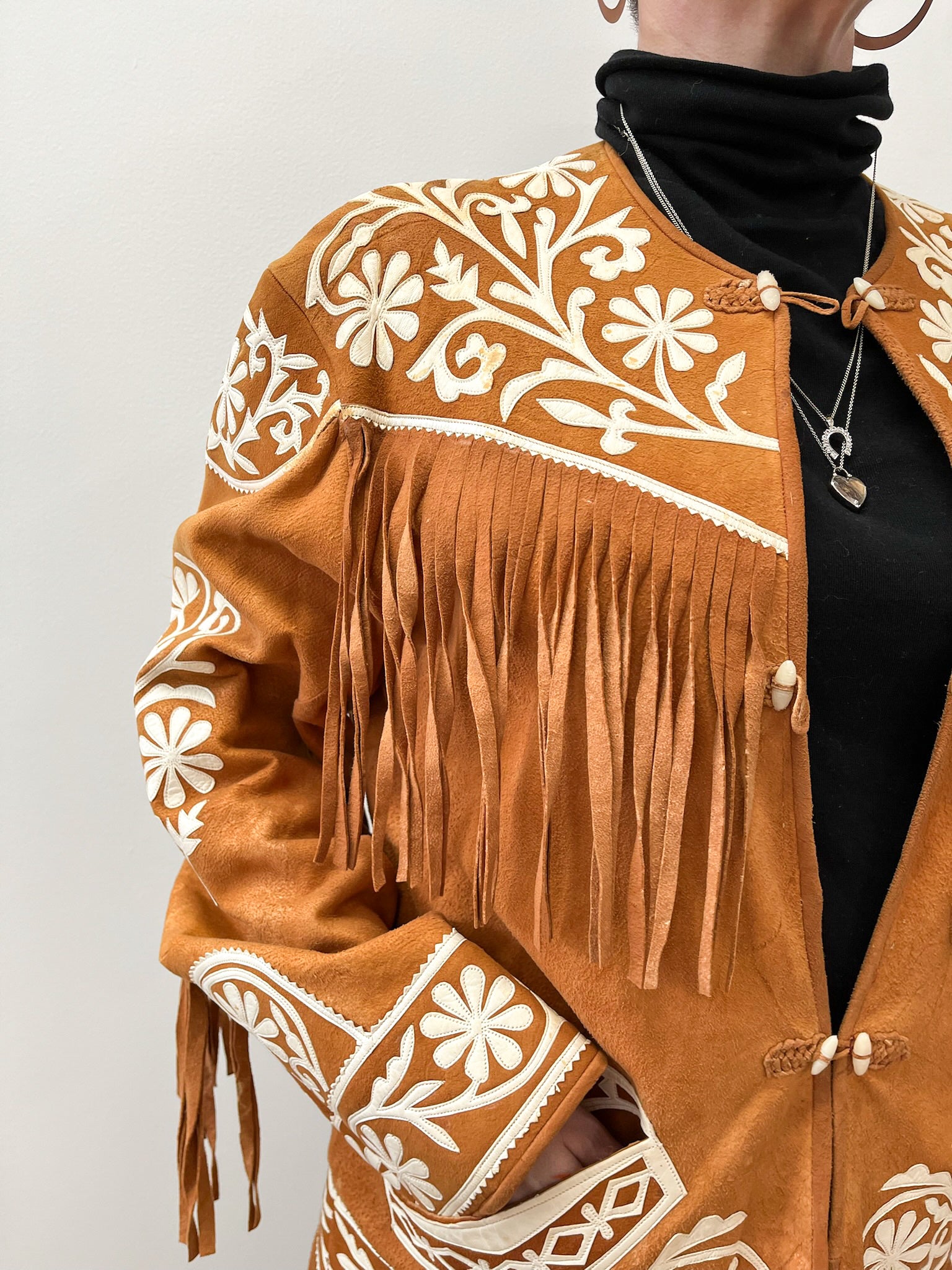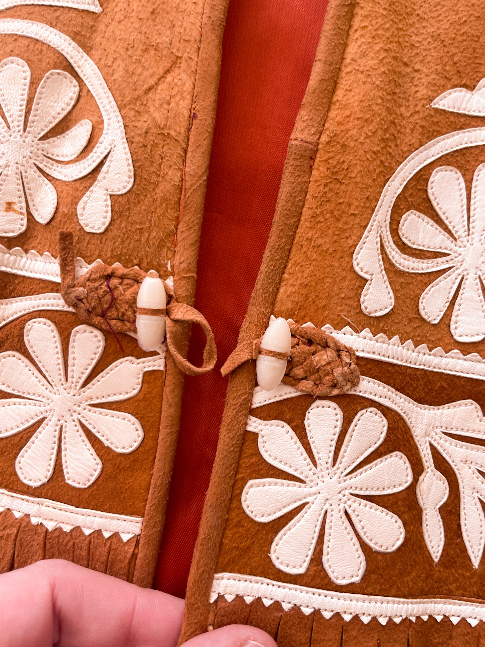 A traditional Mexican Tamaulipeca Cuera jacket in contrasting white and golden brown suede leather, circa 1940s - early 1950s. Floral designs all over, with a large crest at the bottom back of the jacket. And the FRINGE! Lining is orangey red satiny acetate with one interior pocket. Two diagonal slit pockets at the waist, and buttons down the front with four double plastic loop buttons. An incredible statement piece!