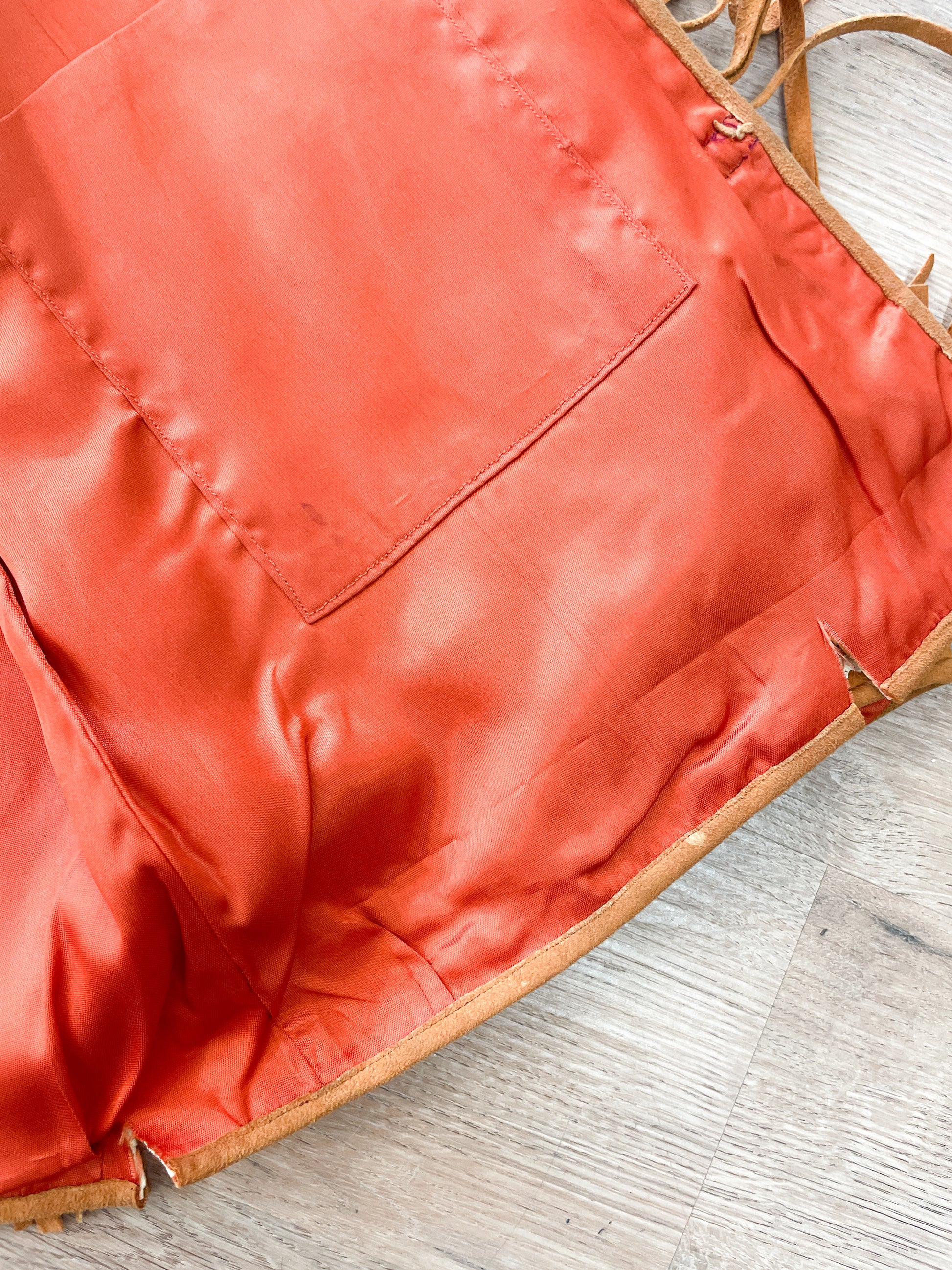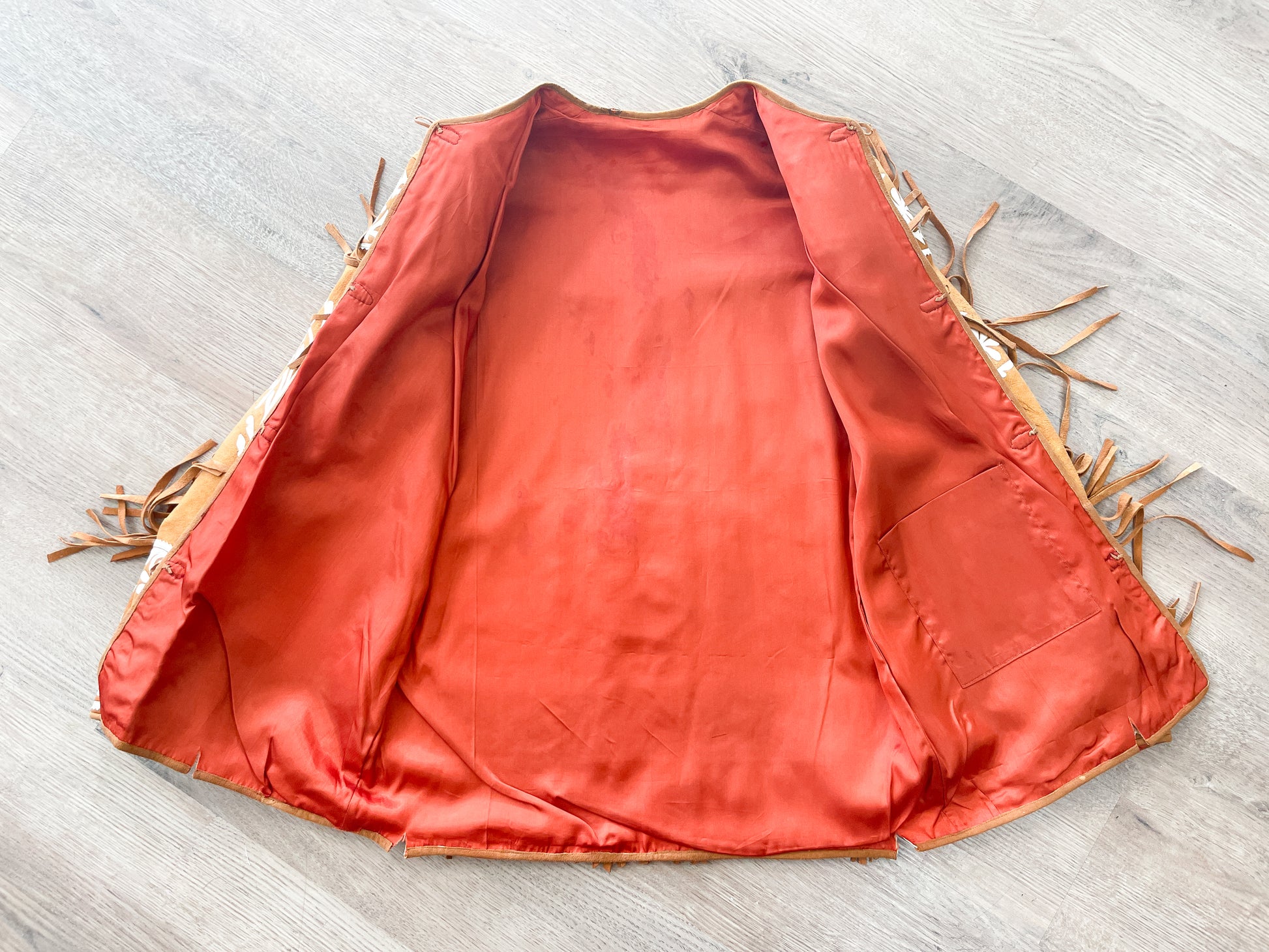 Condition: Good and very wearable with consideration to age of the garment. There is some wear to the suede, brown age spots on the white leather, one nick at the back shoulder collar, and the bottom two plastic closures are missing one loop each (they can still be closed with the remaining loop). Finally, there are four (intentionally?) cut slits at the bottom hem. She still presents beautifully & is just the coolest, rarest, most awesome jacket we've seen in a long while!