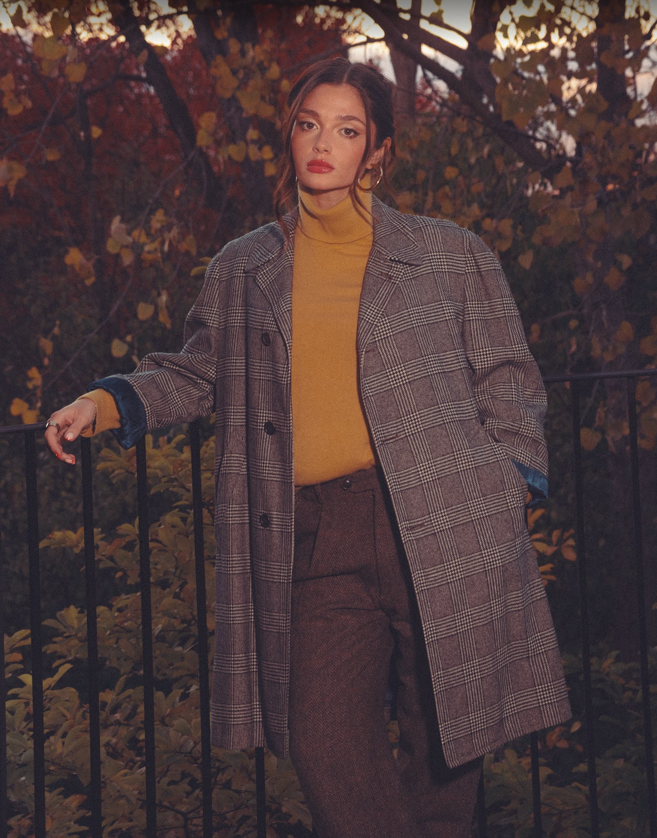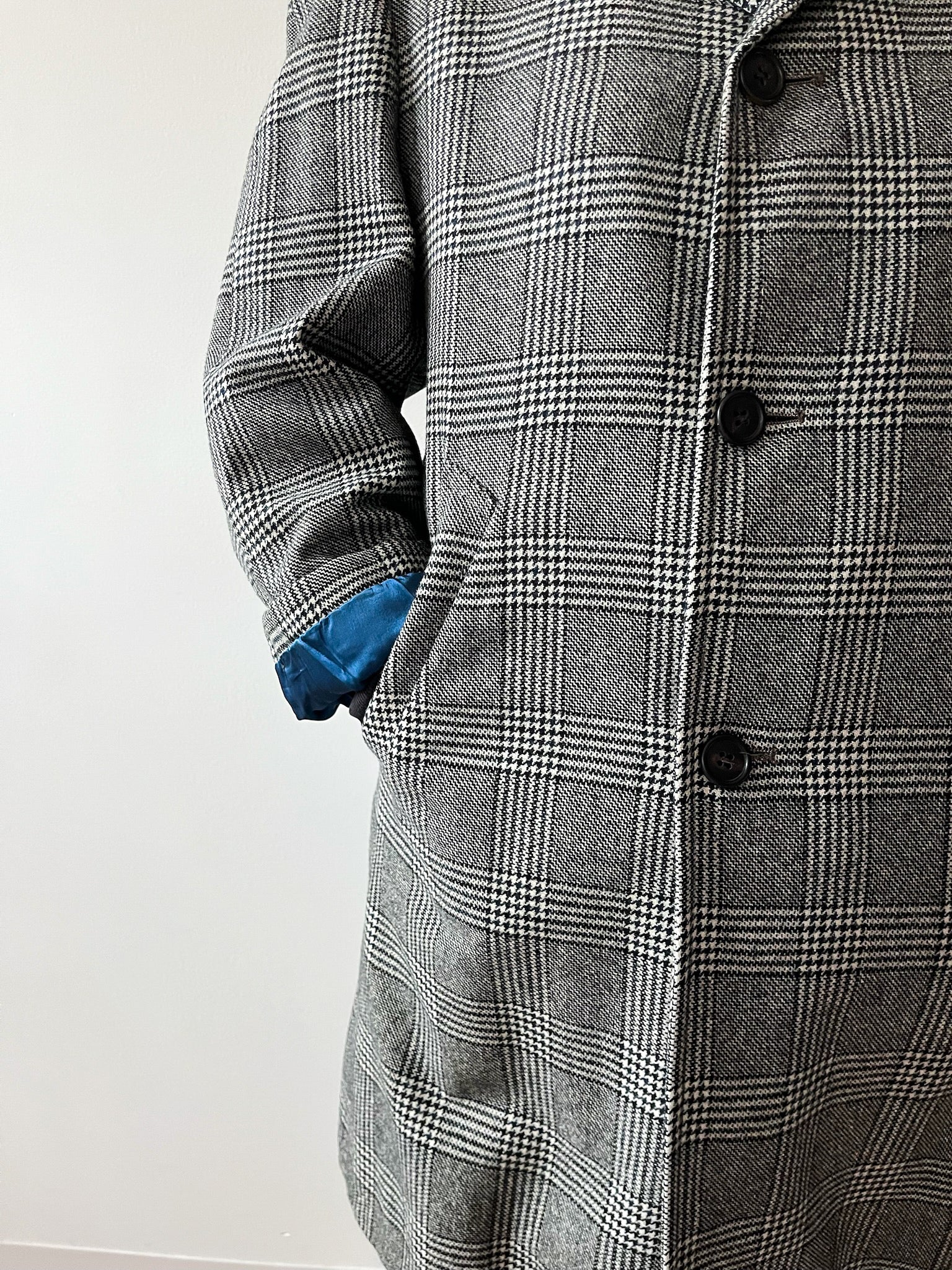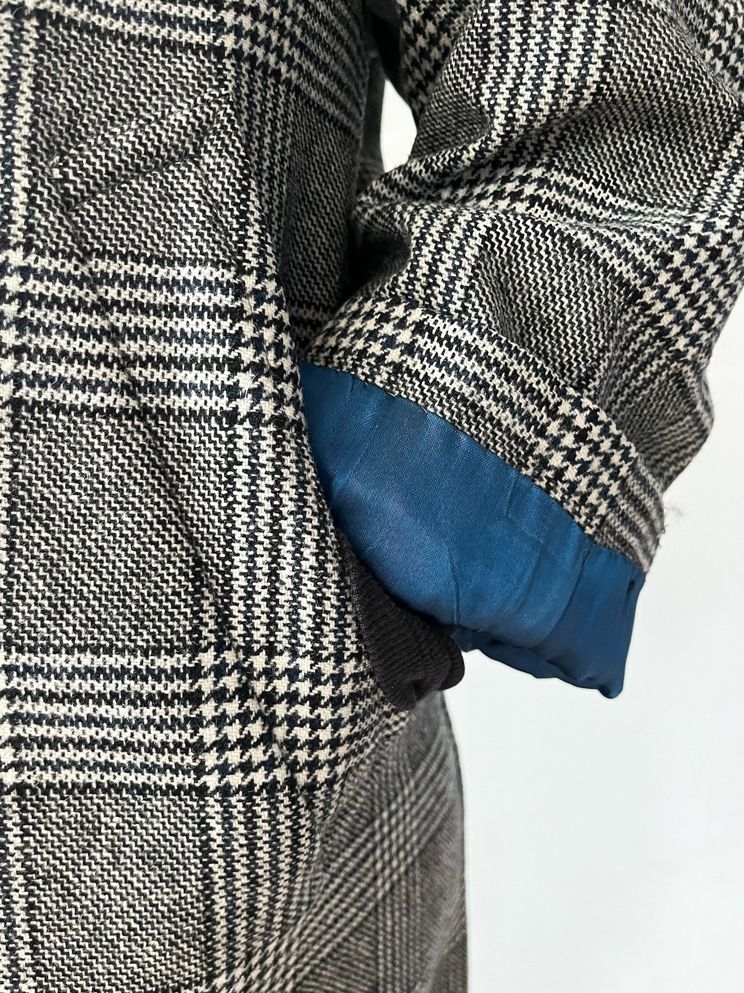 Fantastic plaid houndstooth formal dress coat circa 1950s, with an electric blue satin lining. Small collar, with three buttons down the front, and two pockets at the waist. Looks great fitted or oversized. Styled model photos are by Derek Juntunen; check out their instagram @djuntunen for more fashion shoots.