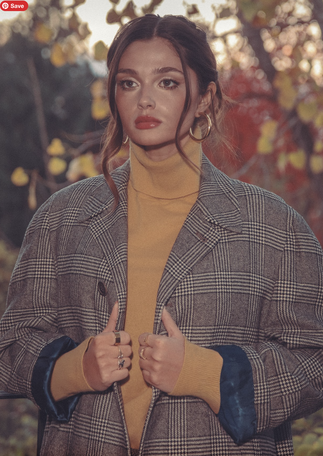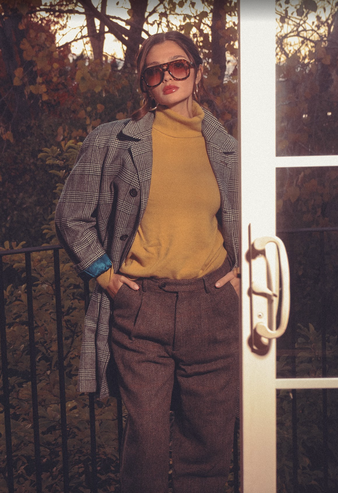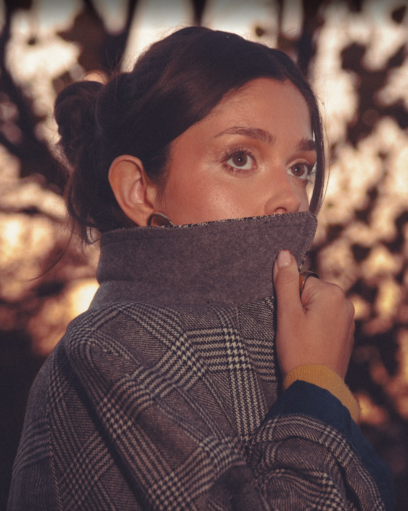 Fantastic plaid houndstooth formal dress coat circa 1950s, with an electric blue satin lining. Small collar, with three buttons down the front, and two pockets at the waist. Looks great fitted or oversized. Styled model photos are by Derek Juntunen; check out their instagram @djuntunen for more fashion shoots.