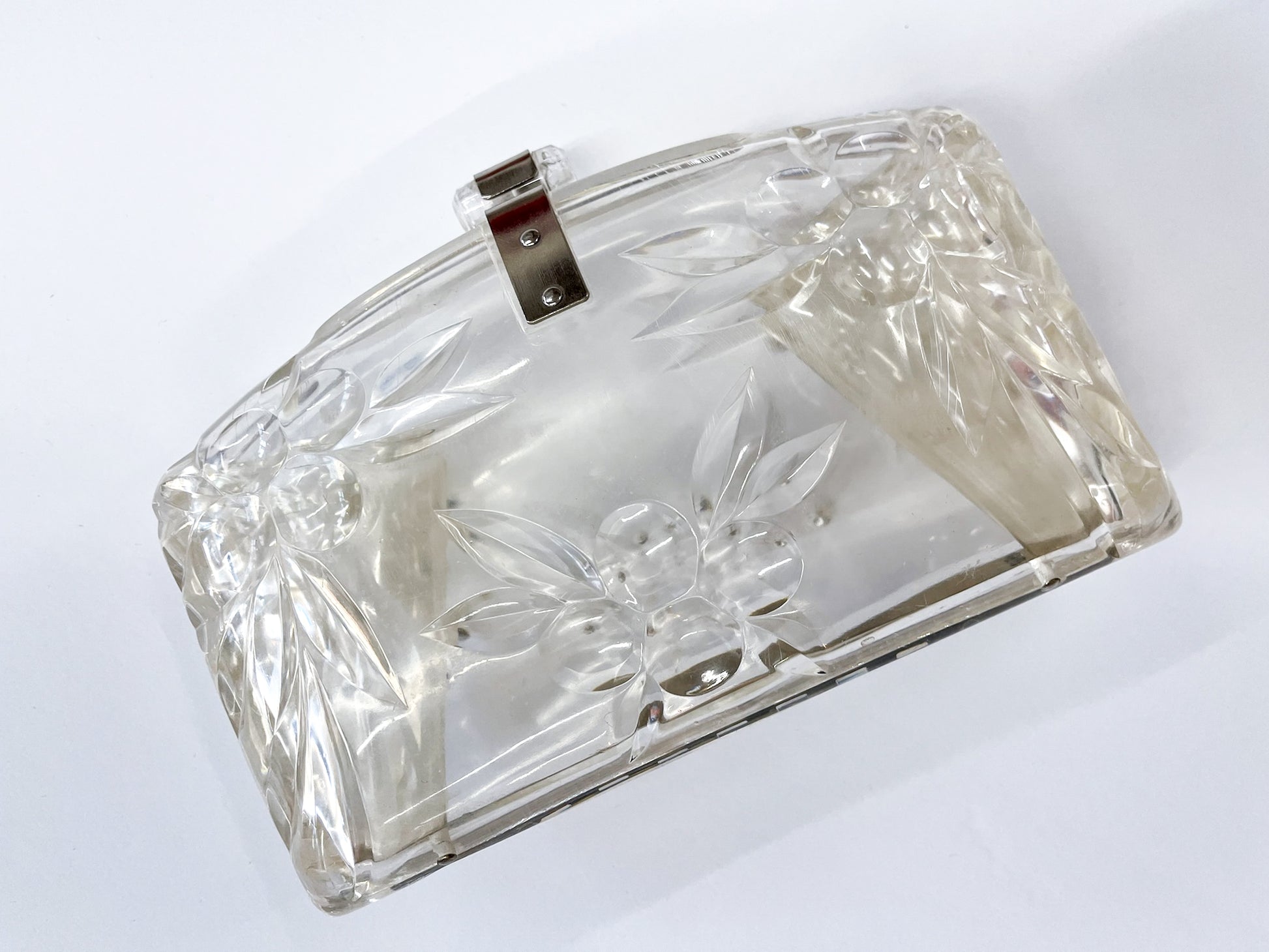 1950s Vintage Clear Lucite Carved Berries with Rhinestones Holiday Clamshell Clutch