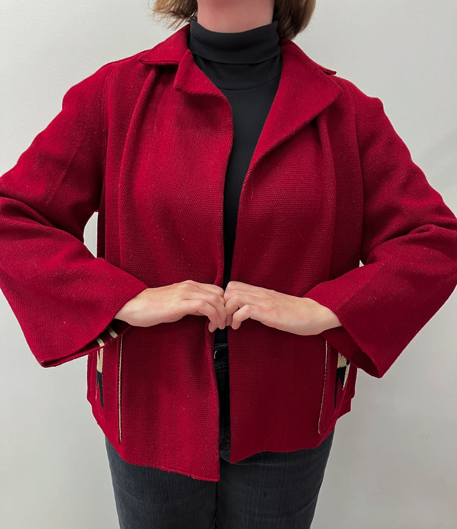 Absolutely gorgeous, burgundy wine red jacket made from a Chimayo blanket circa the 1950s. Large pattern on the back with bright red interior; with alternating beige and black patterns on the front. Open front, no snaps or closures, with large collar. Beautifully constructed with cream silk lining in the pockets as well as armpits and interior seams.