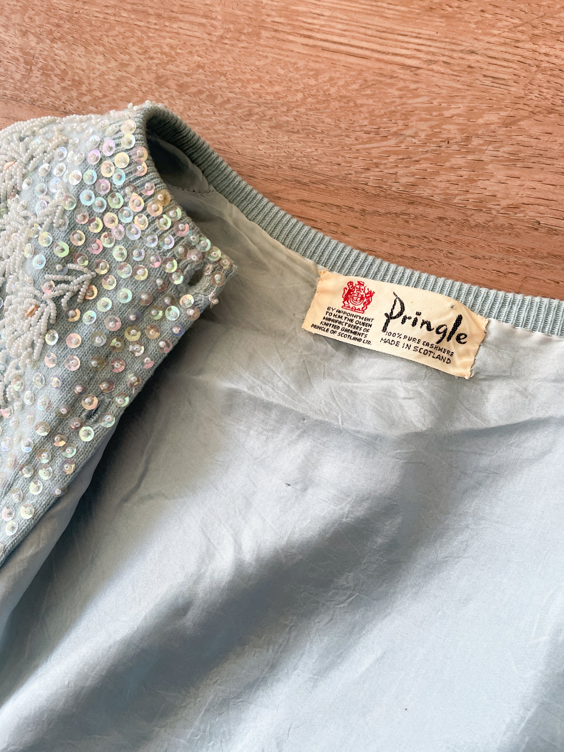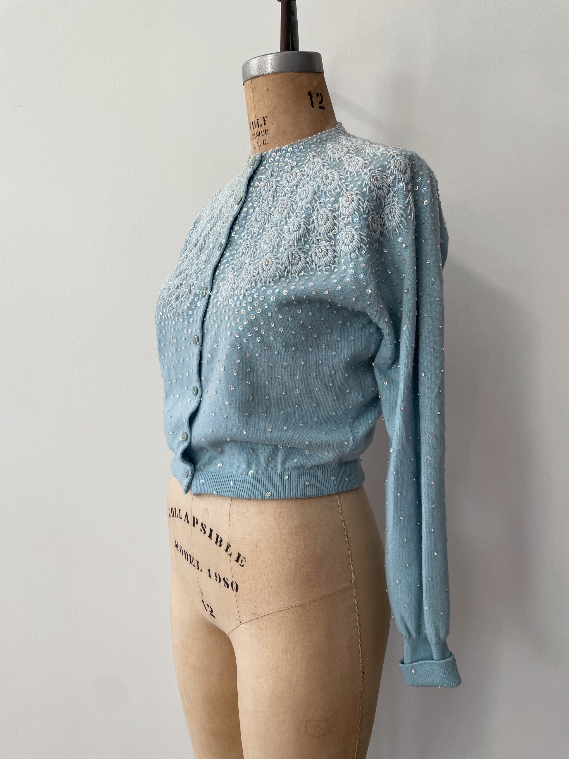 1950s Vintage Pringle of Scotland Pure 100% Cashmere Ice Blue Heavily Beaded Sweater