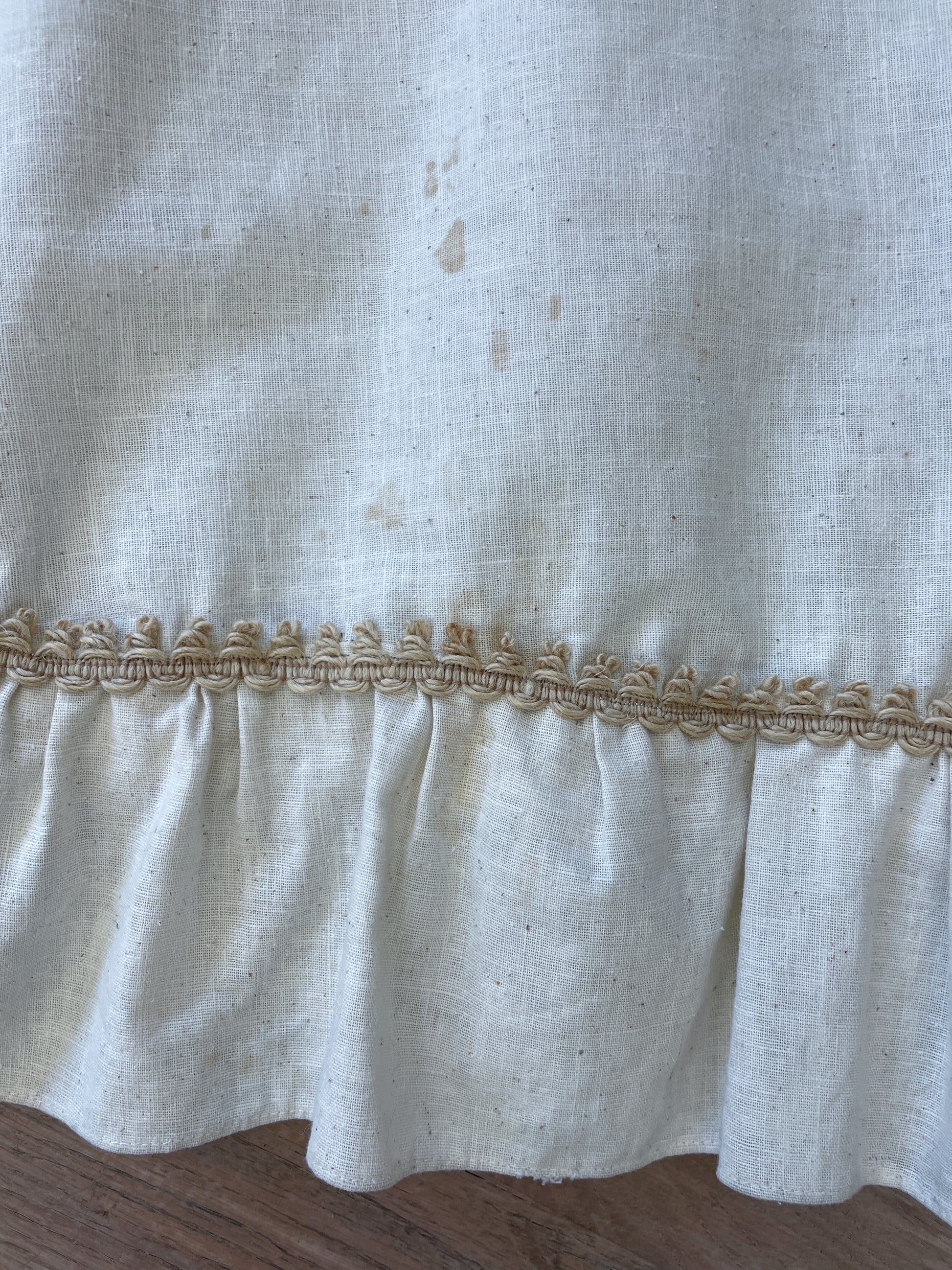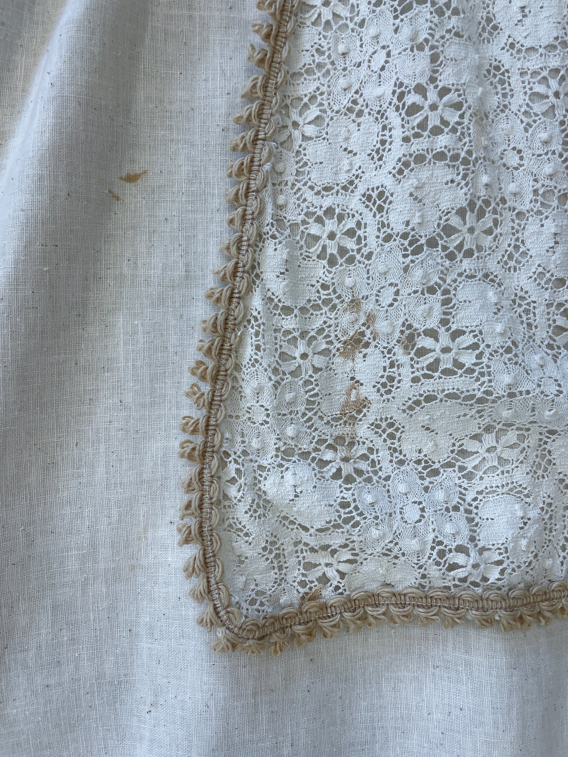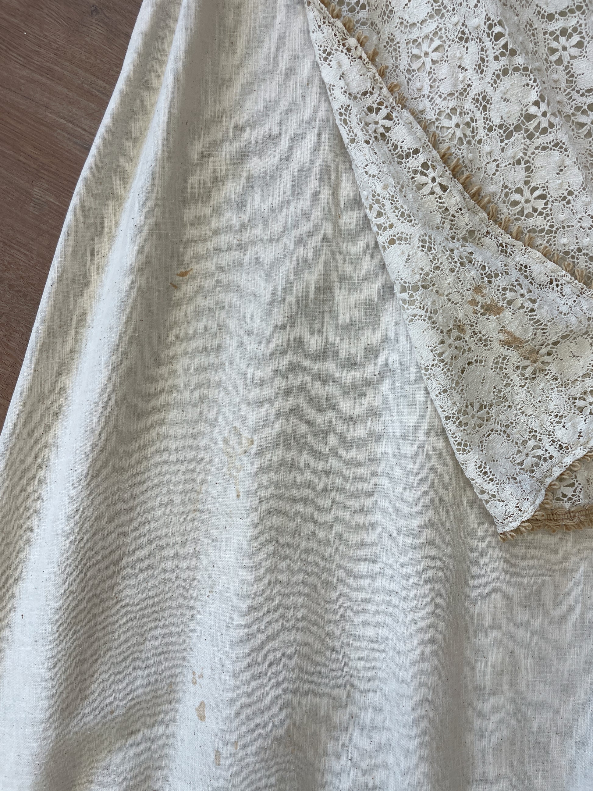 Condition: Good. We have done lots of restoration with this garment: installed new elastic in the bust area, stitched and reinforced seams, and soaked clean MANY times. There is remnants of either a nosebleed or food spillage, with a few dots near the empire waist (very light) and then more on the lace near bottom / skirt below the knee - it looks as if something was dropped down the skirt. After about 8 soaks, we did not want to damage the jute or integrity of the fabric; all have lightened. Please see flat lay photographs. She still presents beautifully and we're proud to give her a new life!