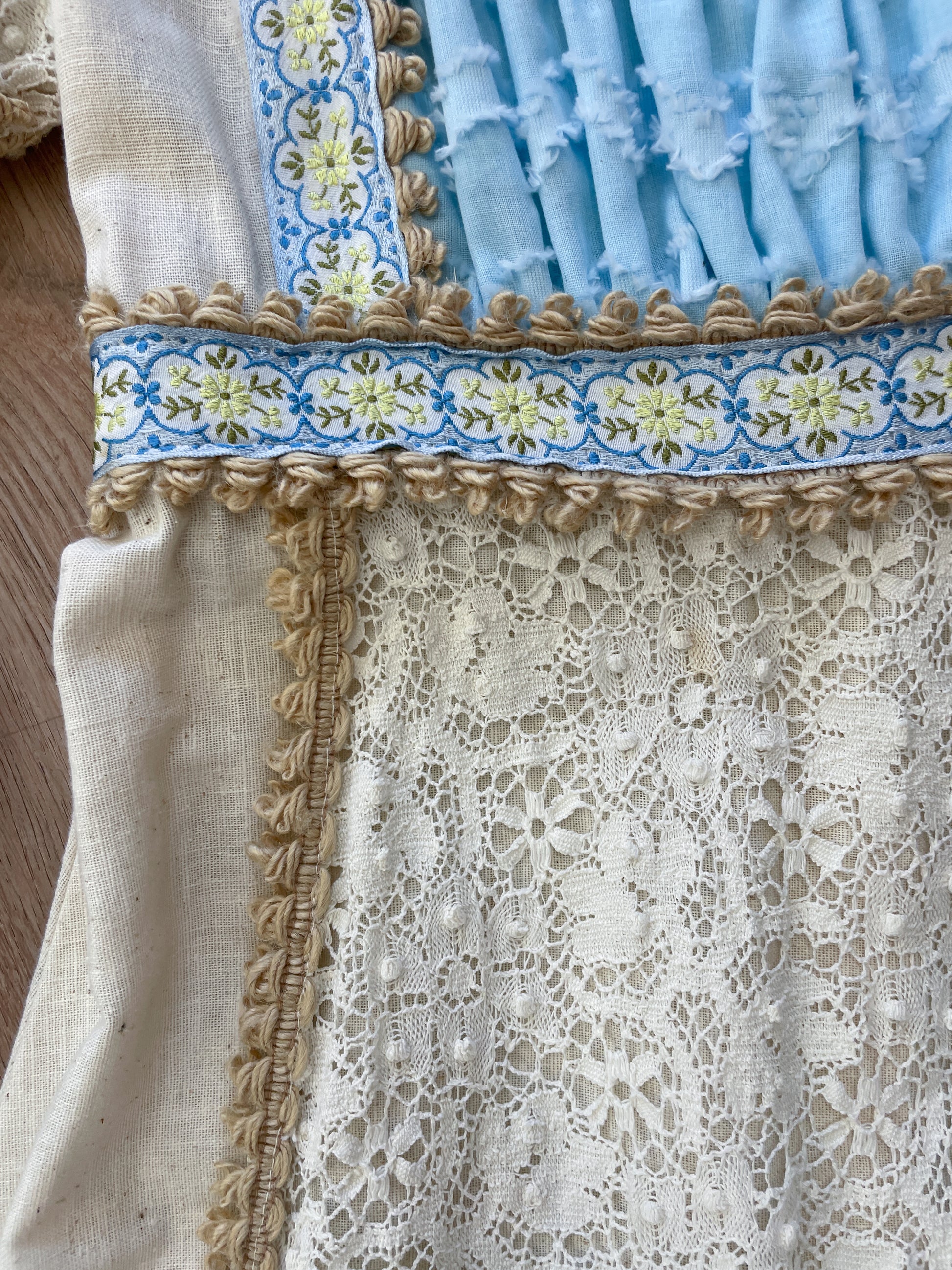 From the most wonderful period of Gunne Sax, this beauty is at home either at the renaissance faire or fit for the wedding of a princess! Elastic blue bust with ribbon trim, jute surrounding all trim, lace apron, lace puff sleeves, and just a gorgeous and classic silhouette on this Black Label Gunne Sax.