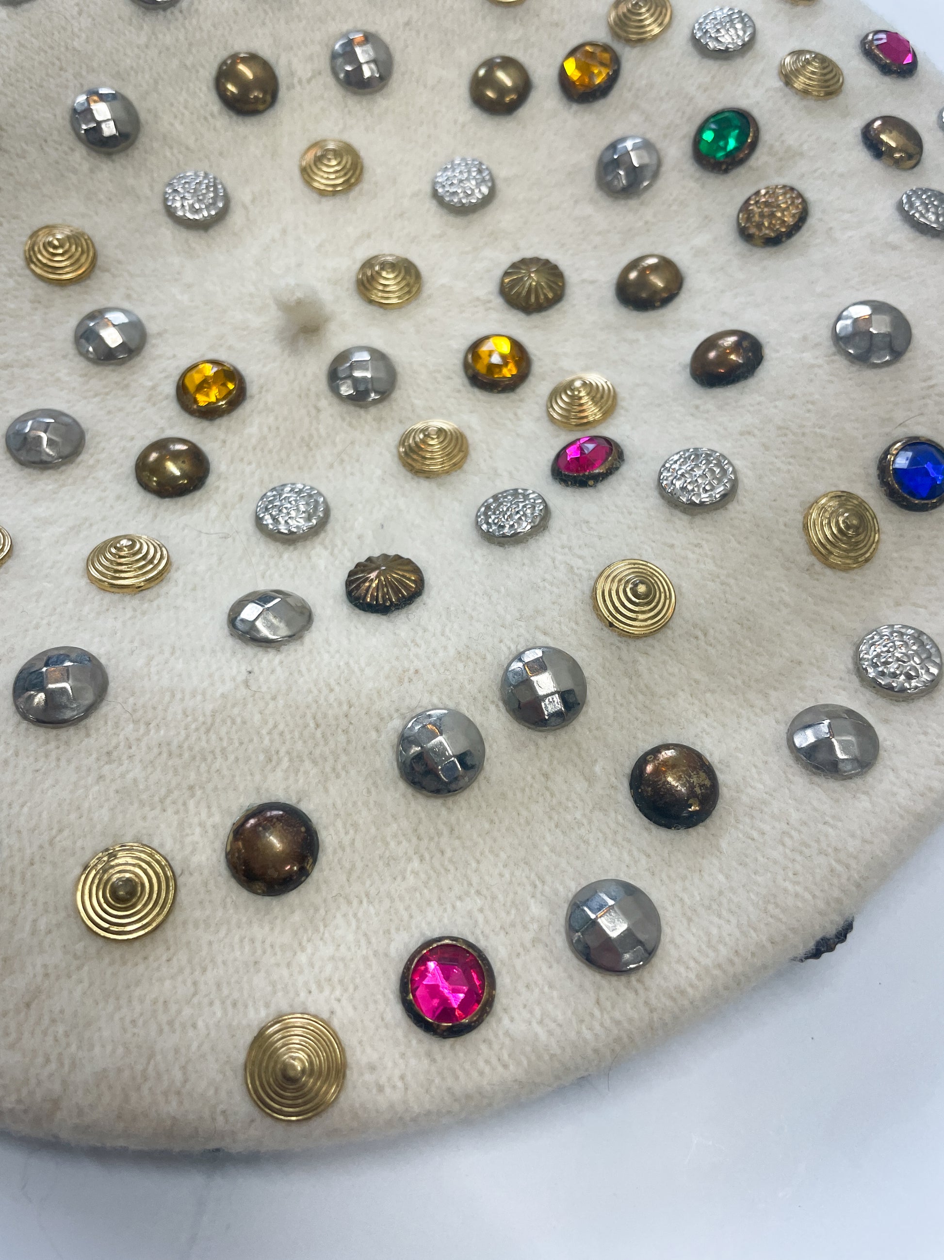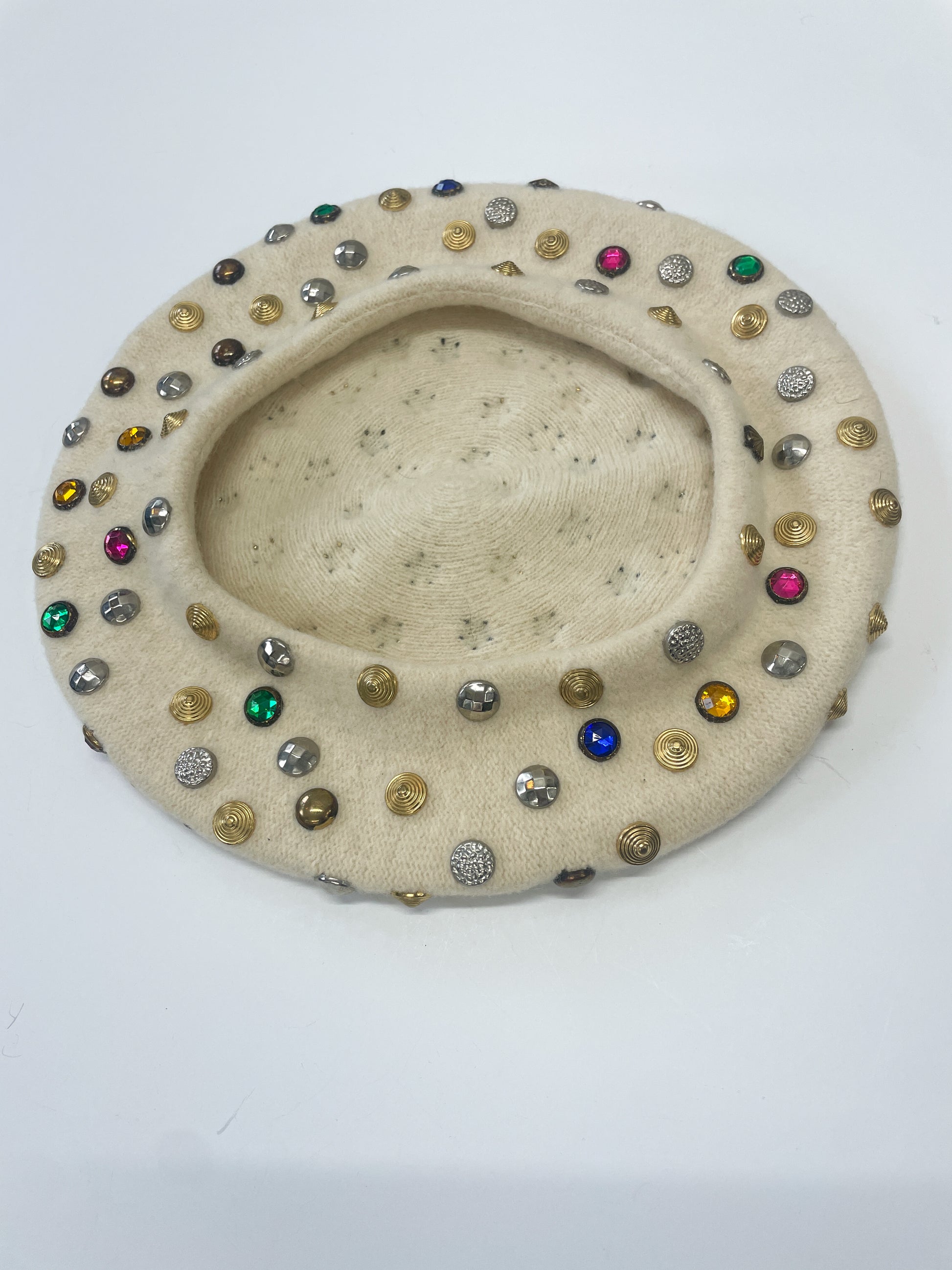 Multicolored gems galore on this 1960s-era cream wool beret!