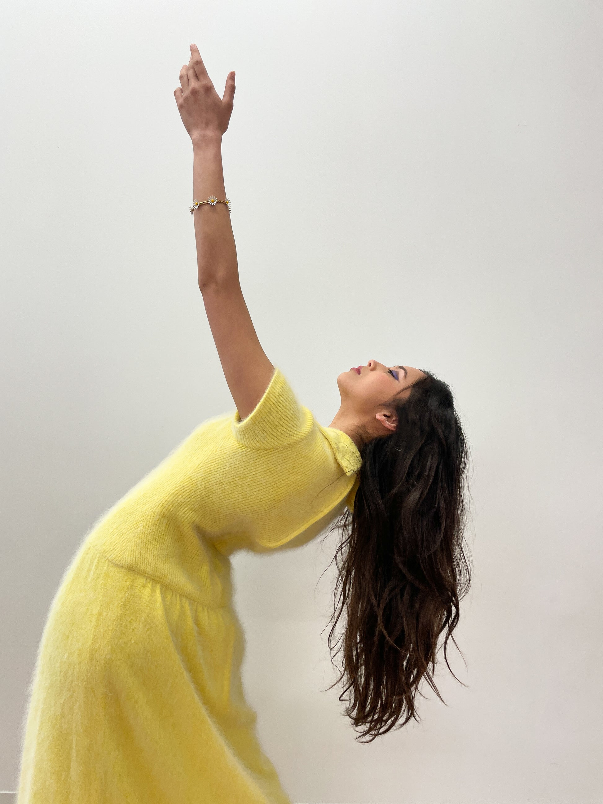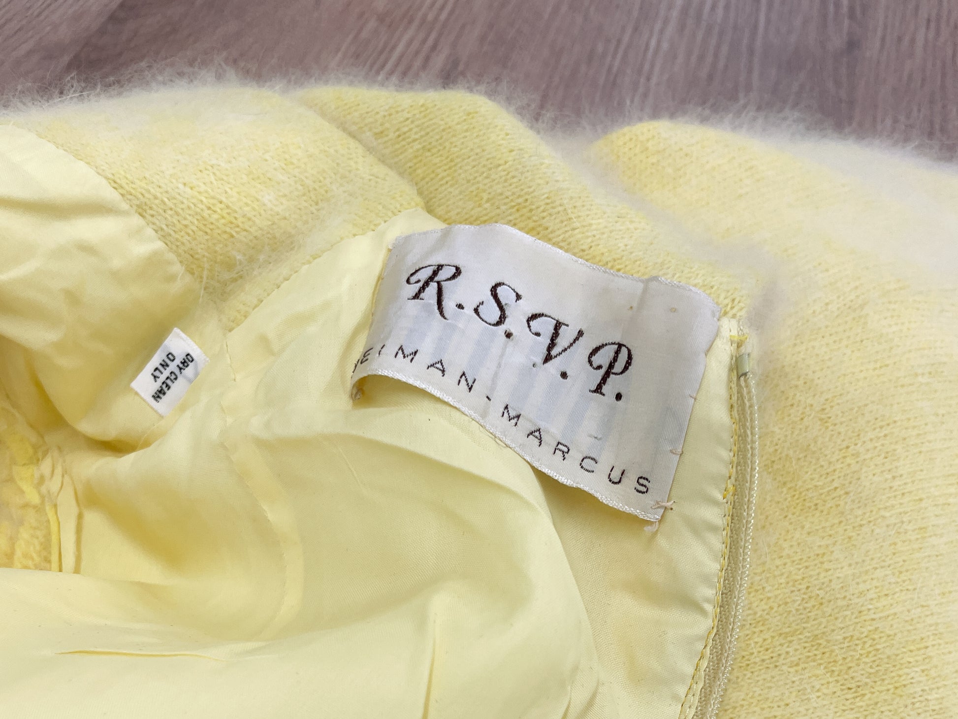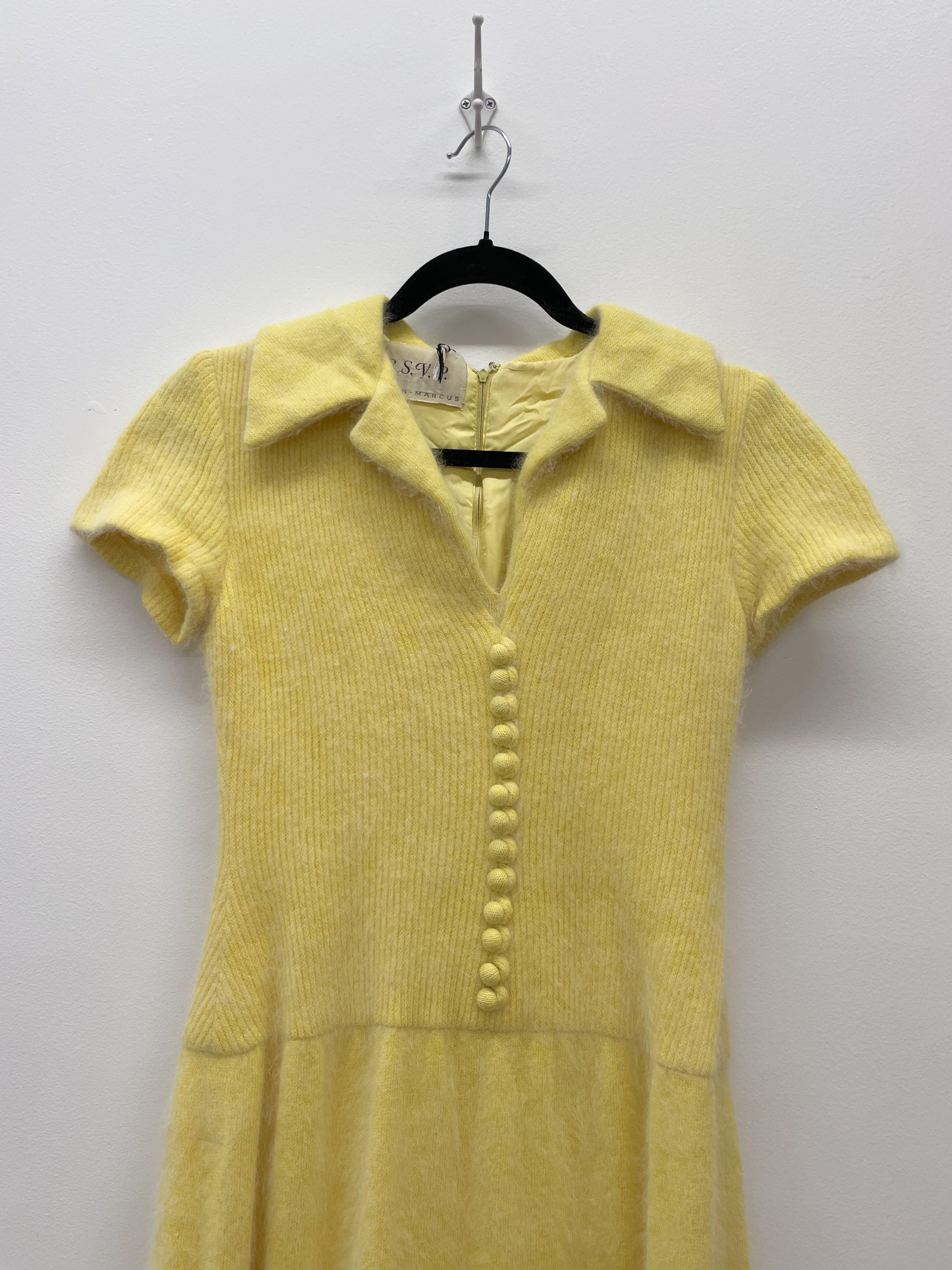 Absolutely glorious buttery yellow soft angora fur maxi dress, fully lined, with a long back zip entry. Collared, short sleeve, with faux buttons on the front. We have soaked this garment clean and darned many holes which appeared with said cleaning; about 4 hours of darning all in. She is restored and ready to wear!