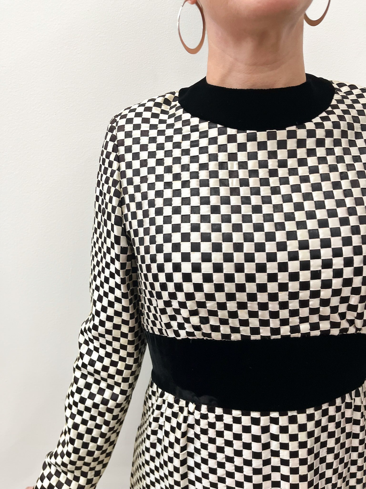 Absolutely gorgeous checkerboard mod dress by Elinor Simmons for Malcolm Starr in the late 1960s. What makes this number so absolutely unique and to die for is the checkerboard is actually interwoven black and white ribbons! With black velvet collar, waistline, and bottom hem, this dress is a mod girl's dream. It is SO well made, with great structure and fully silk lined, long zipper and hook closure on the back. It is heavy material and drapes / wears beautifully. And it has pockets!!
