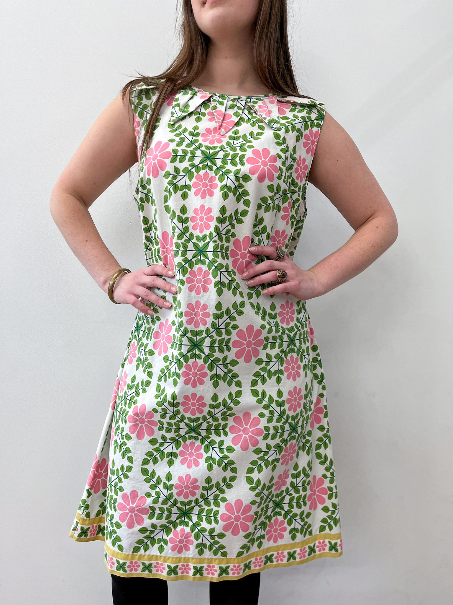 The craftsmanship on the petal collar on this mod shift is just incredible! Flowy cotton in a mod floral geometric / kaleidoscope pattern, perfect for springtime. Contrast trim around the bottom hem. Zips up the back. Circa 1960s.