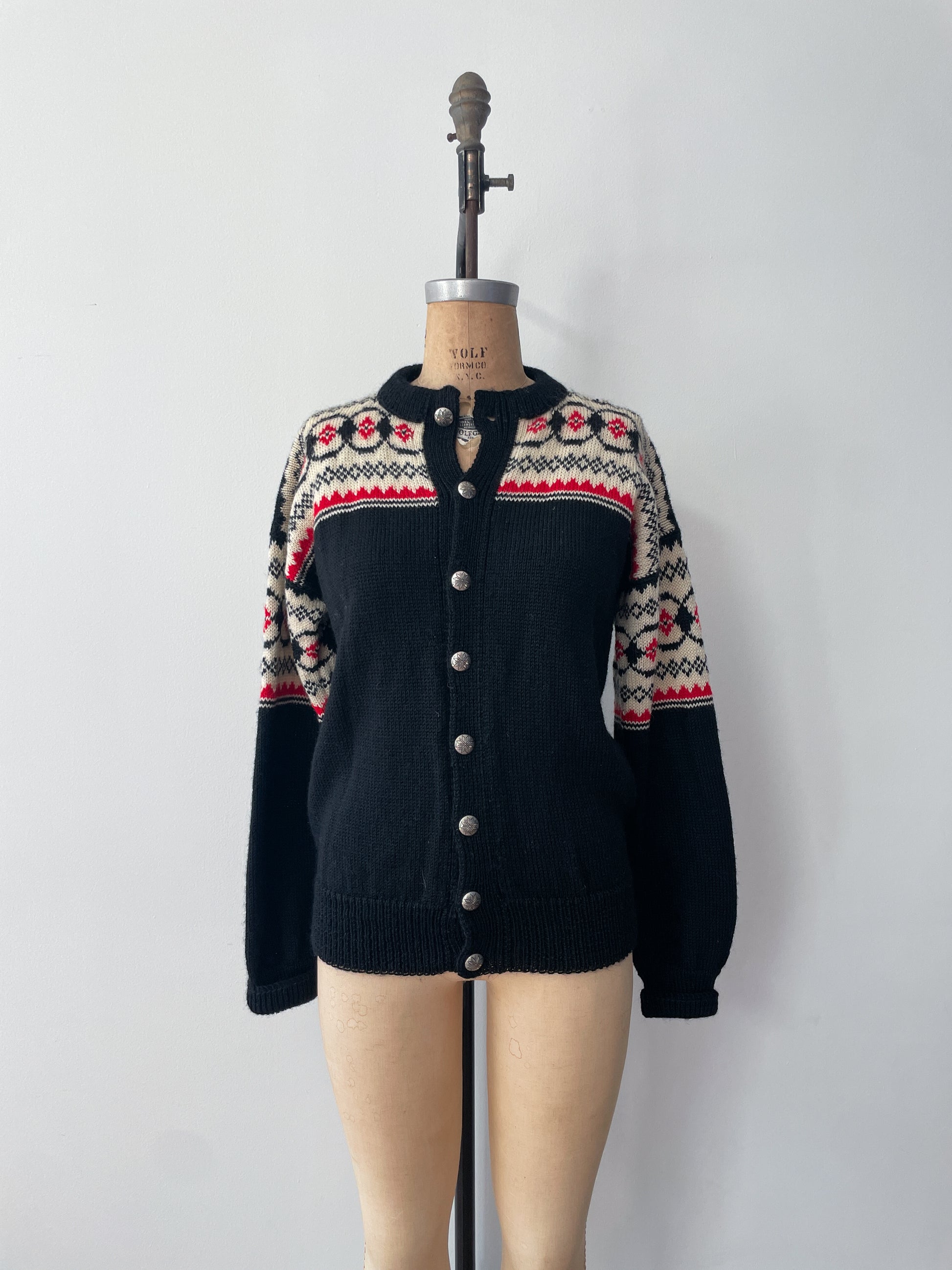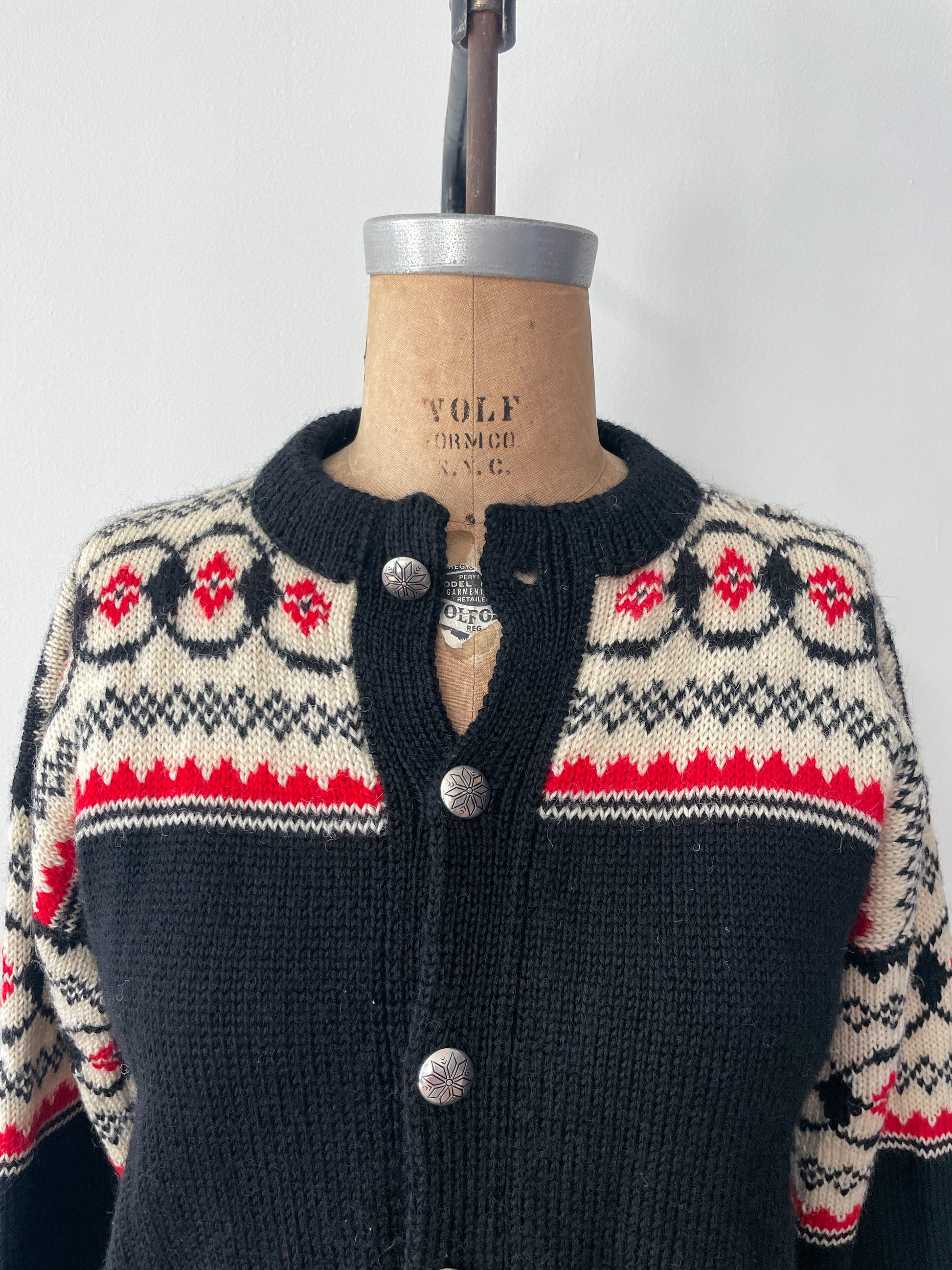 1950s Vintage Black Cream Red 100% Wool Fair Isle Norwegian Knit Cardigan Sweater