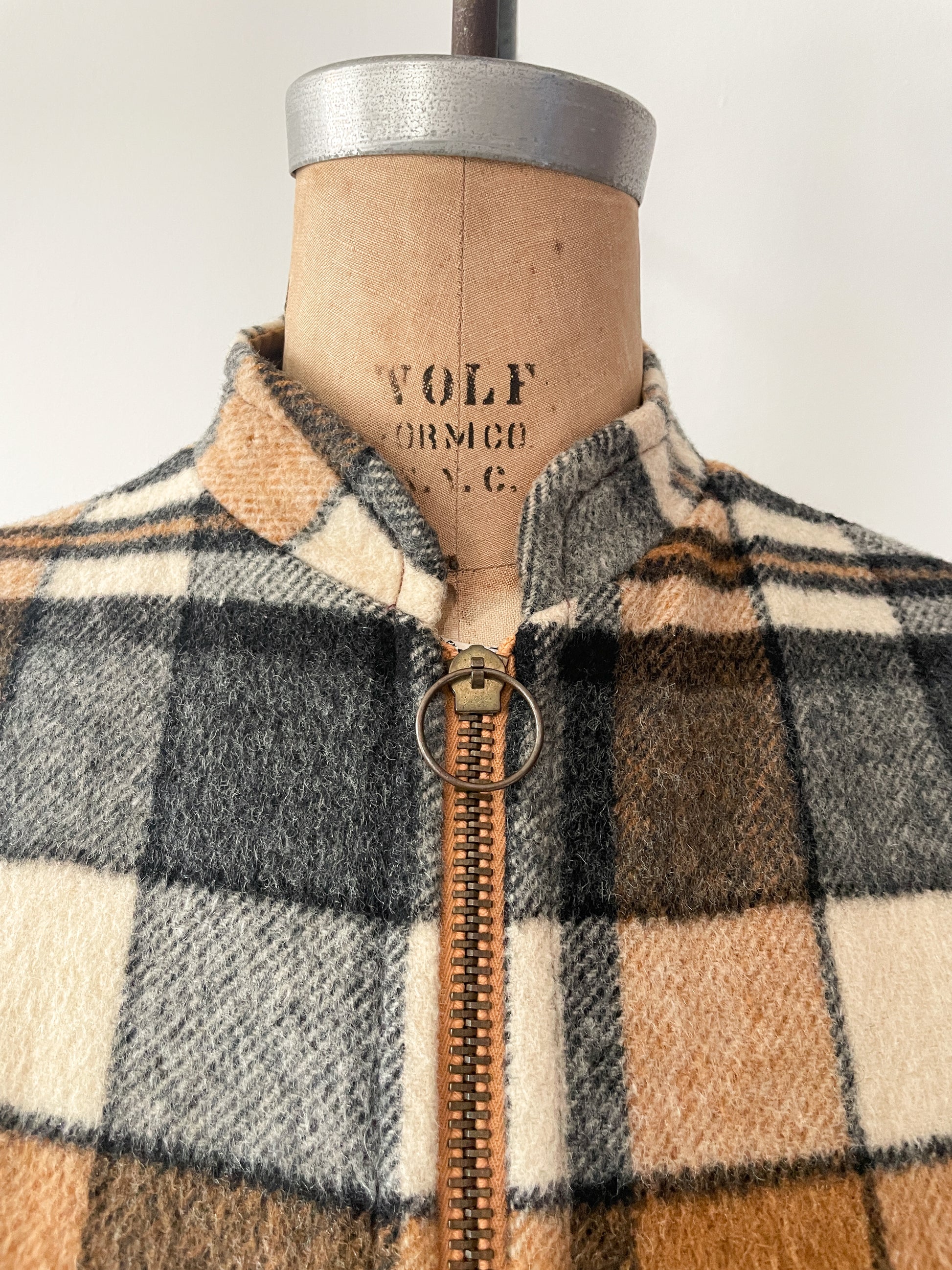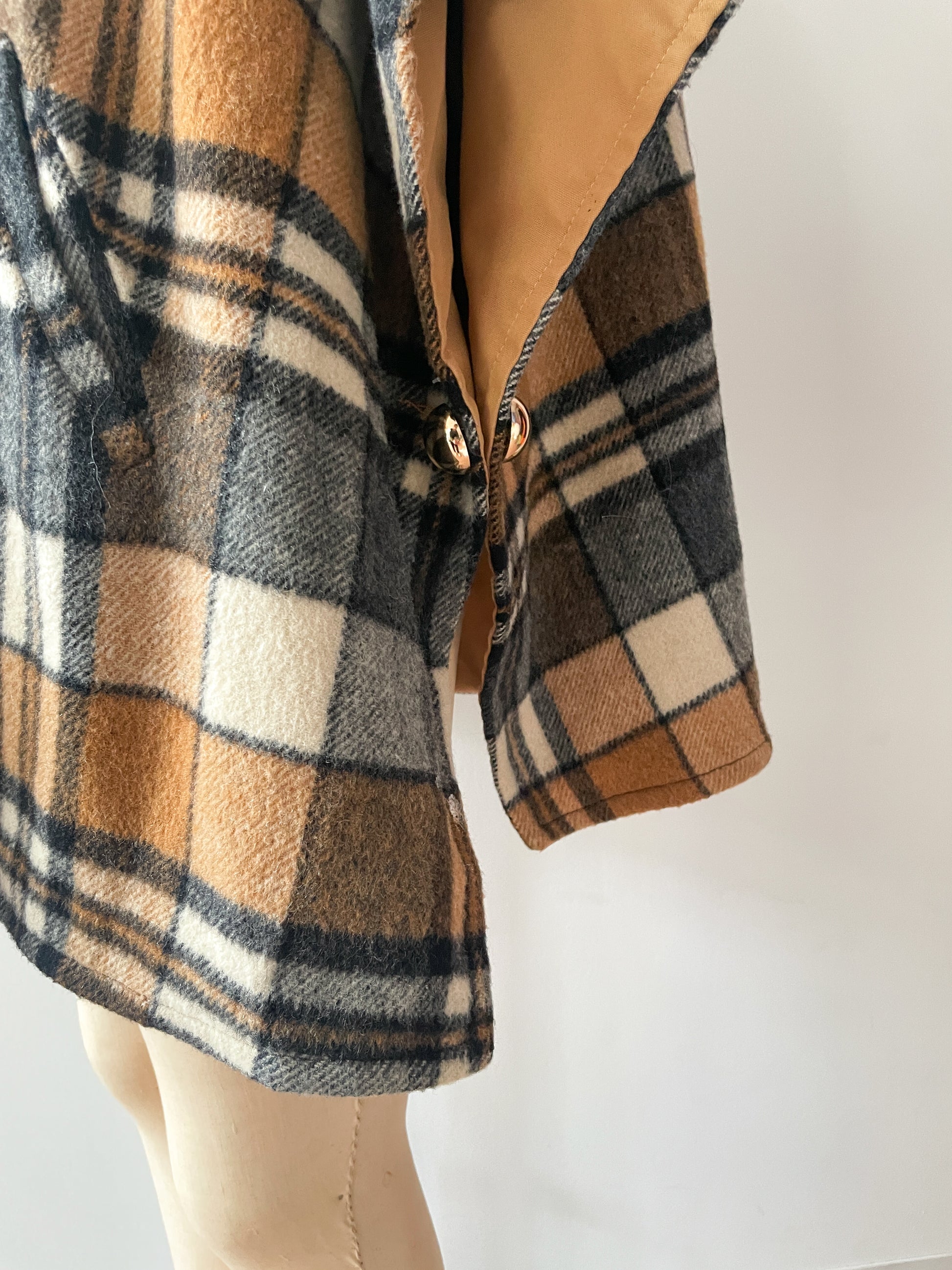 Incredible plaid cape c. 1960s in camel, beige, cream and gray. Mandarin collar with heavy duty zipper and O-ring zipper pull. Two big gold buttons secure the arm closures, and there's pockets at the hips on both sides! Also did we mention it's reversible?! Matching brown canvas on the alternative side.