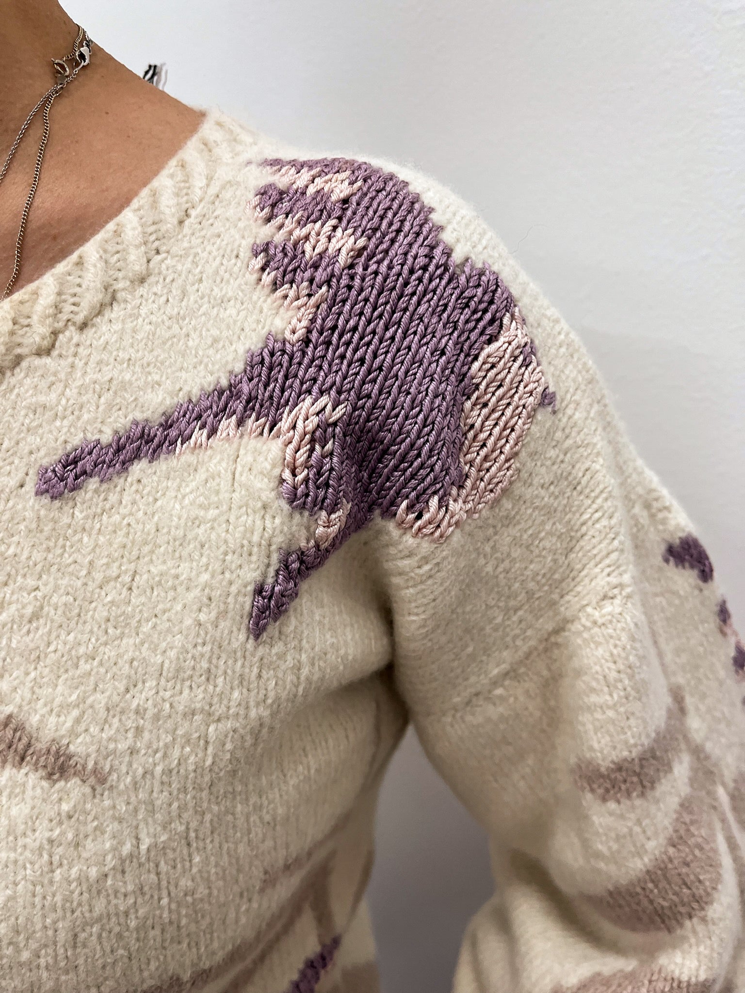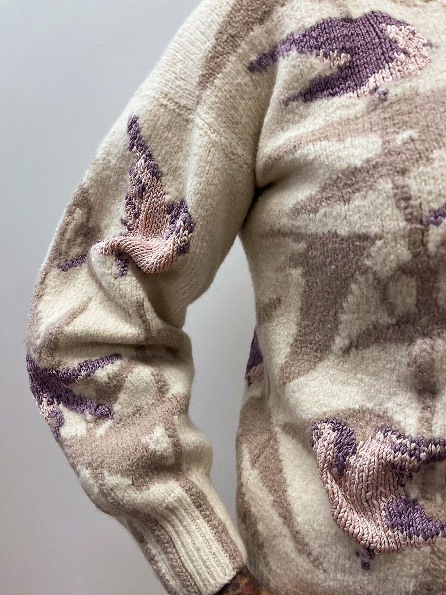 This 1970s/1980s bird motif sweater is the perfect addition to any bird lover's closet. The base color is an off-white cream color. There are accents of taupe in the trees/plants along with pastel pink and purple birds.