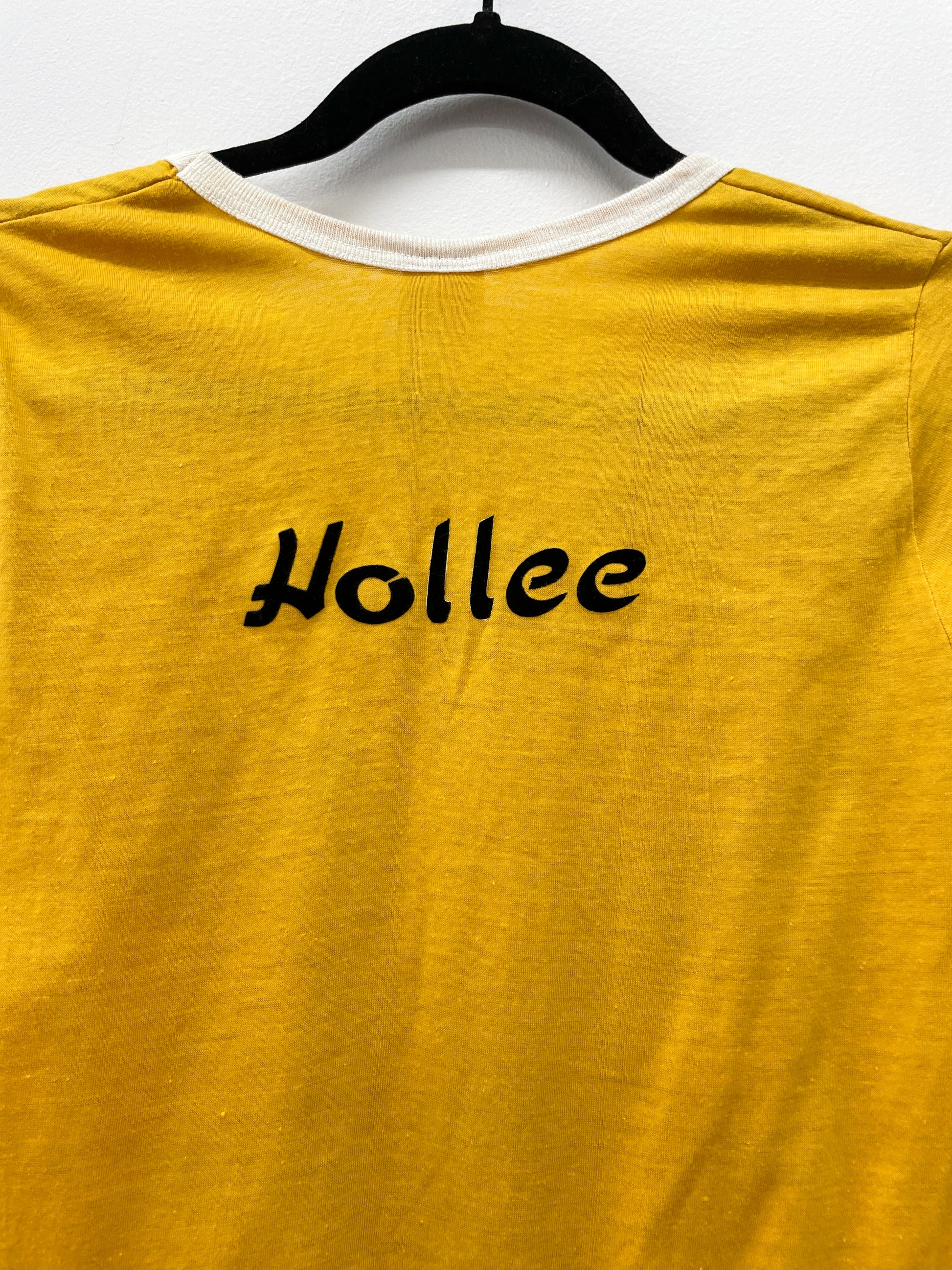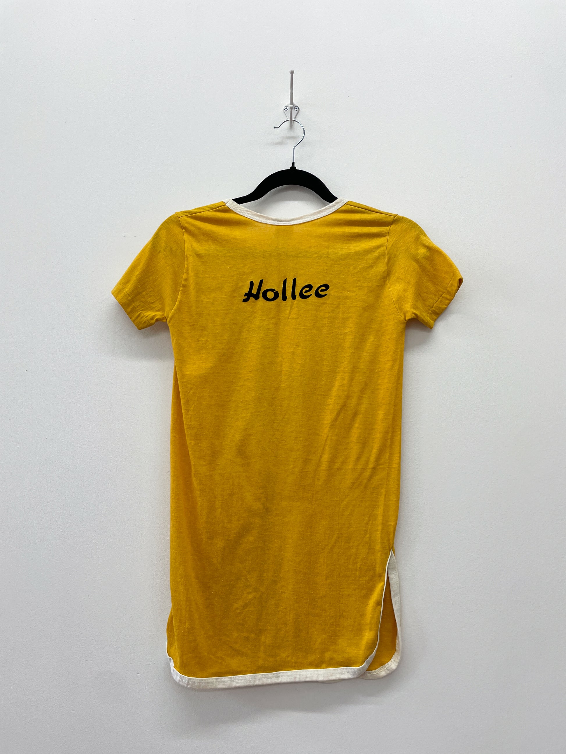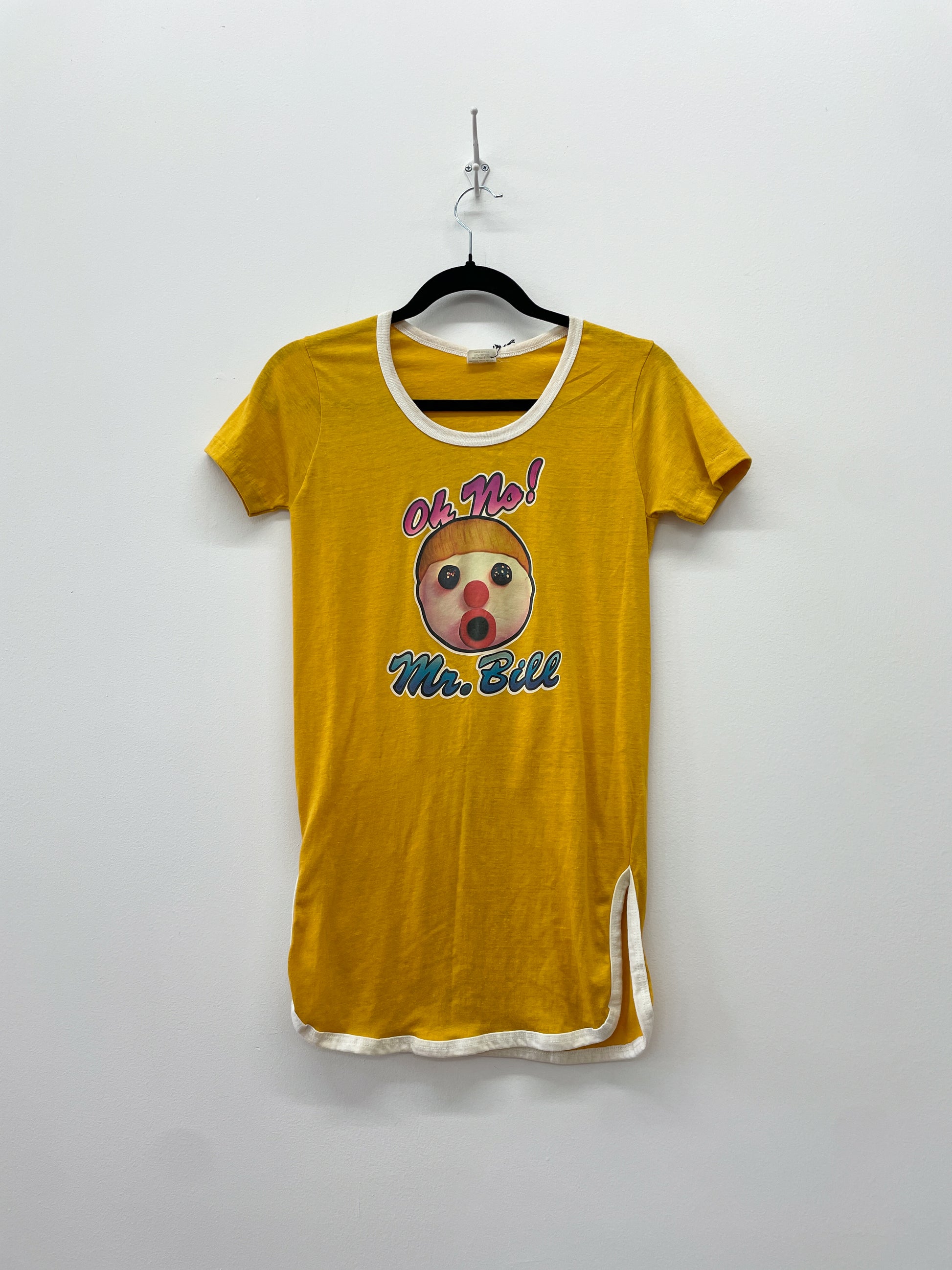 "Oh no! Mr. Bill" iron on with "Hollee" (the original owner's name) in black flocked velvet on the back! Great yellow color with white contrast ringer on the edges. Long length, was originally a child's sleep tee, could be worn by an extra small adult.