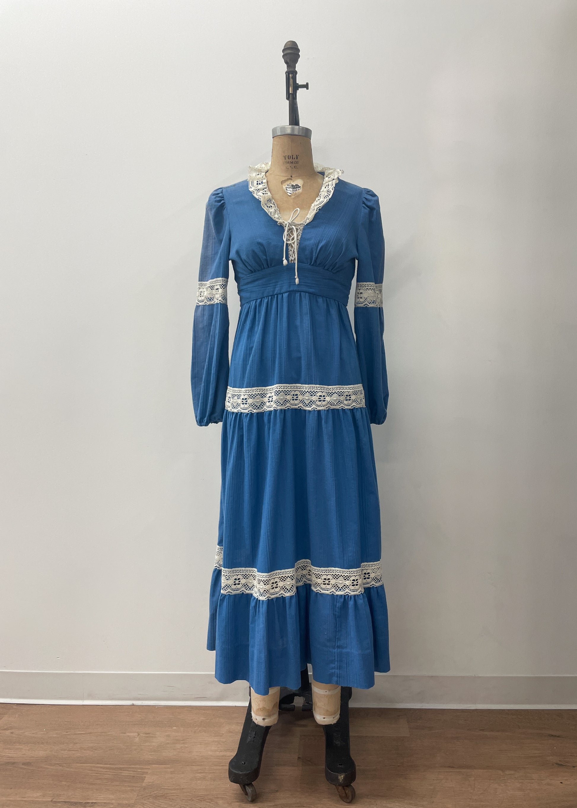 1970s Vintage Romantic Blue Prairie Maxi Dress