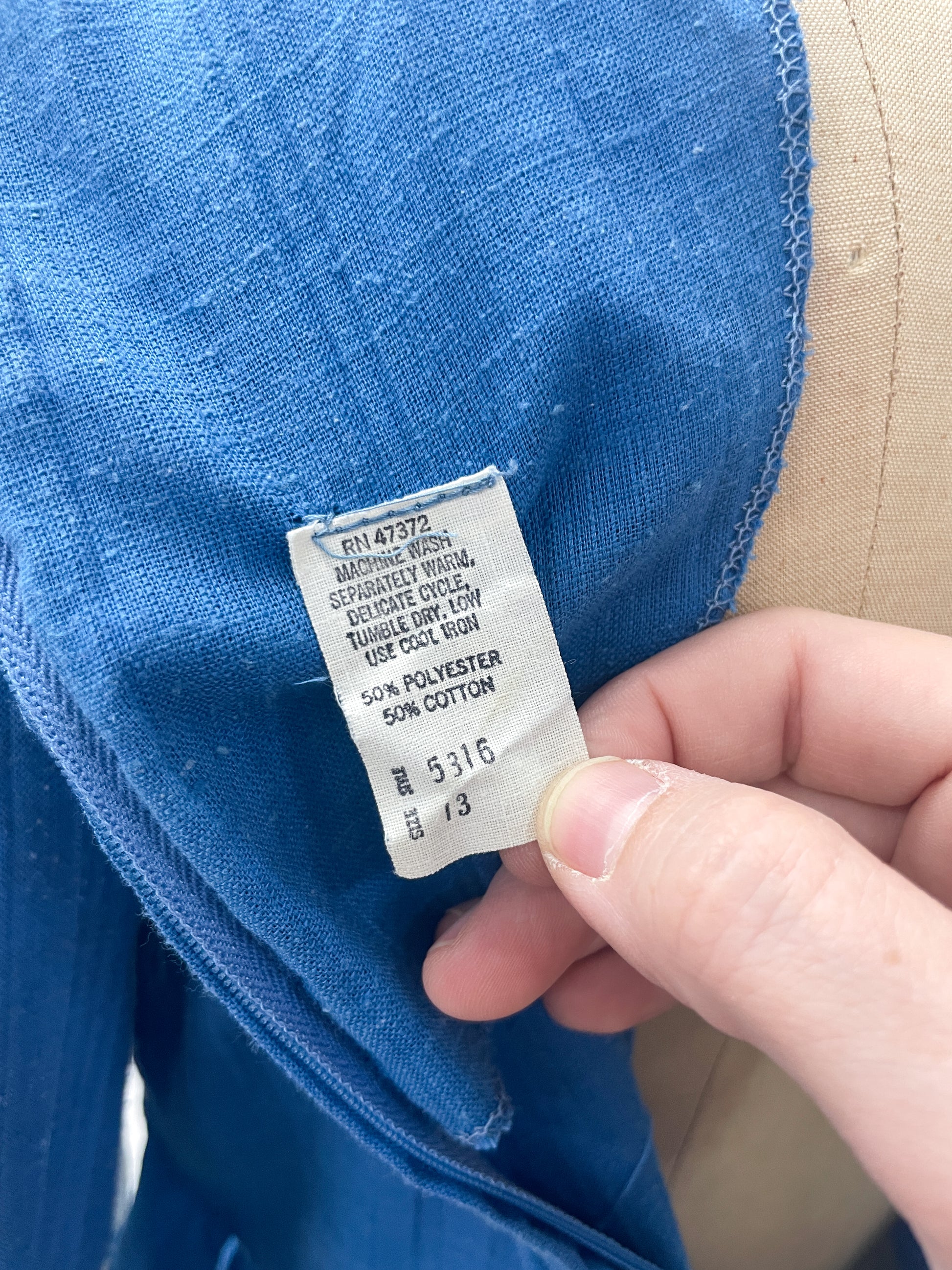 In the style of Gunne Sax when prairie dresses were all the rage, comes this 1970s gorgeous cornflower blue romantic maxi. Long sleeves with tiered lace throughout the sleeves and skirt; gorgeous lace trim around the collar (can be worn either flat or more stand-up as we've shown here); long back zipper, waist cinches with long sash in the back. Perfect for a wedding, perhaps your "something blue"!