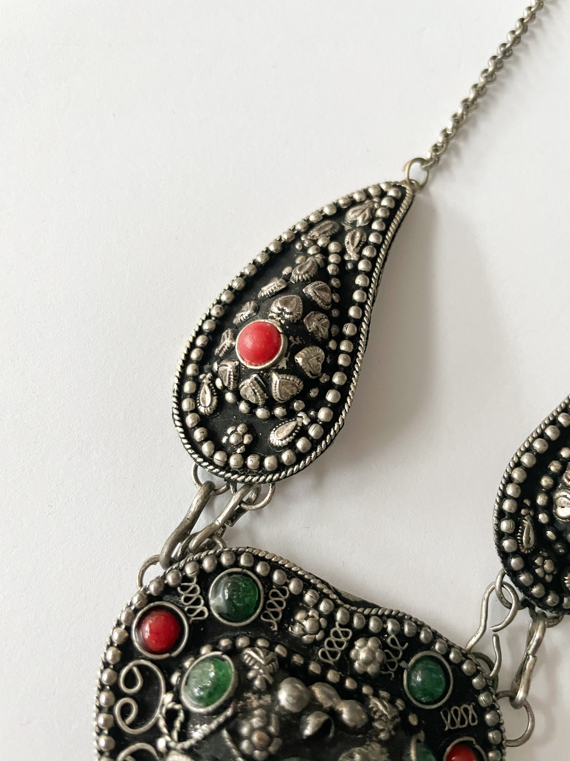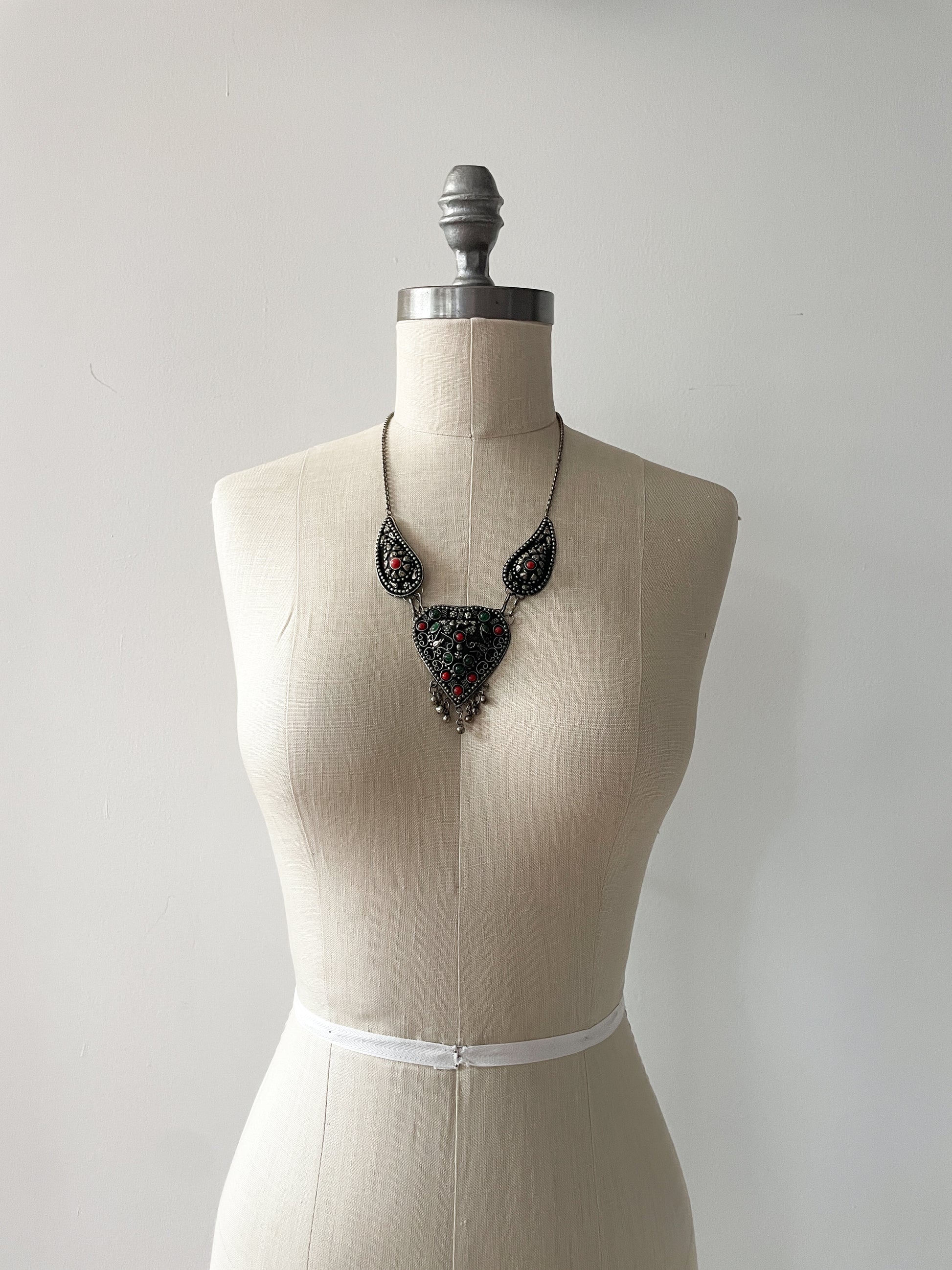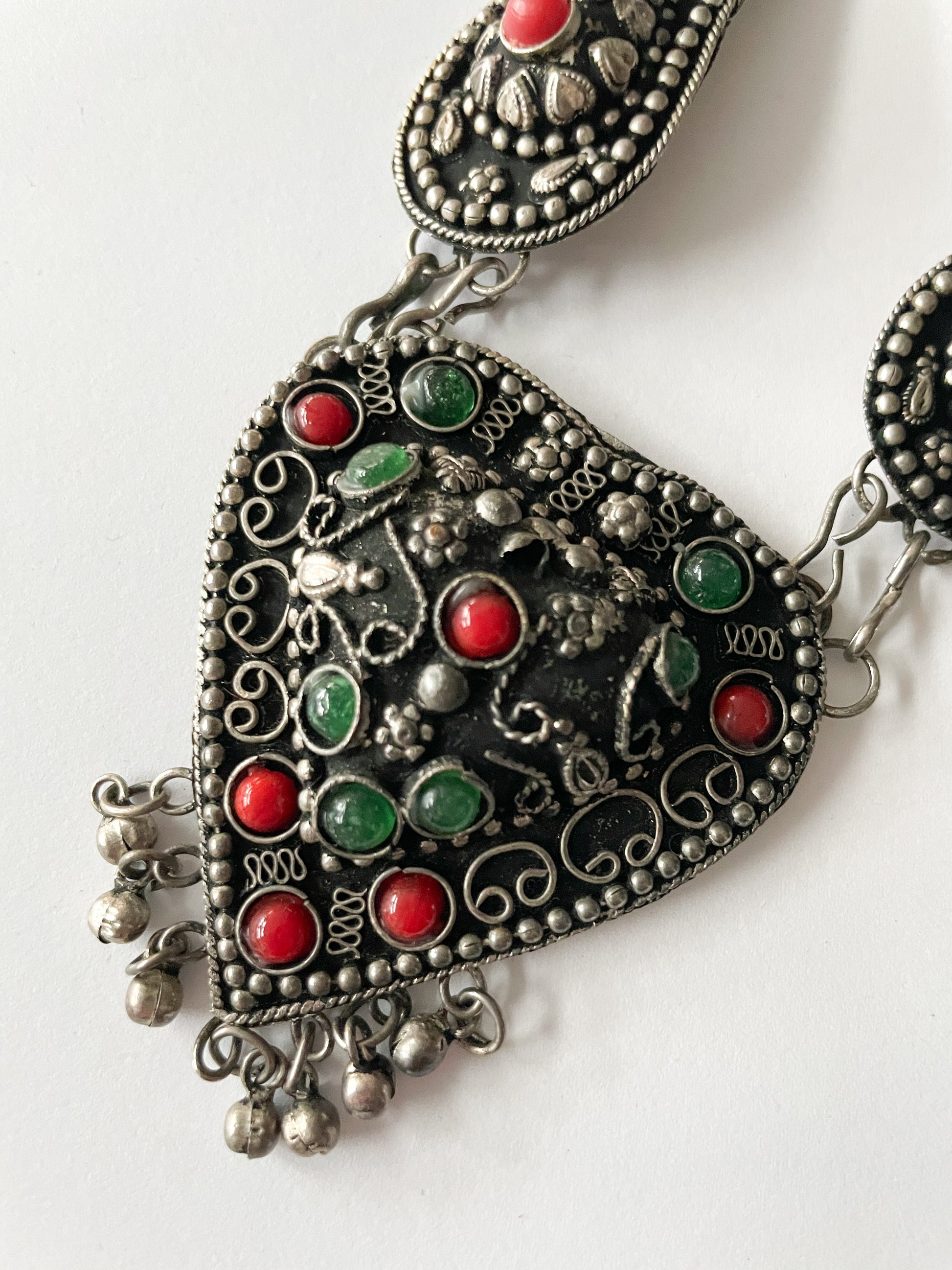 Beautiful large heart pendant attached to two additional tear drop shaped pendants, with faux red and green cabochons, as well as bells at the bottom.