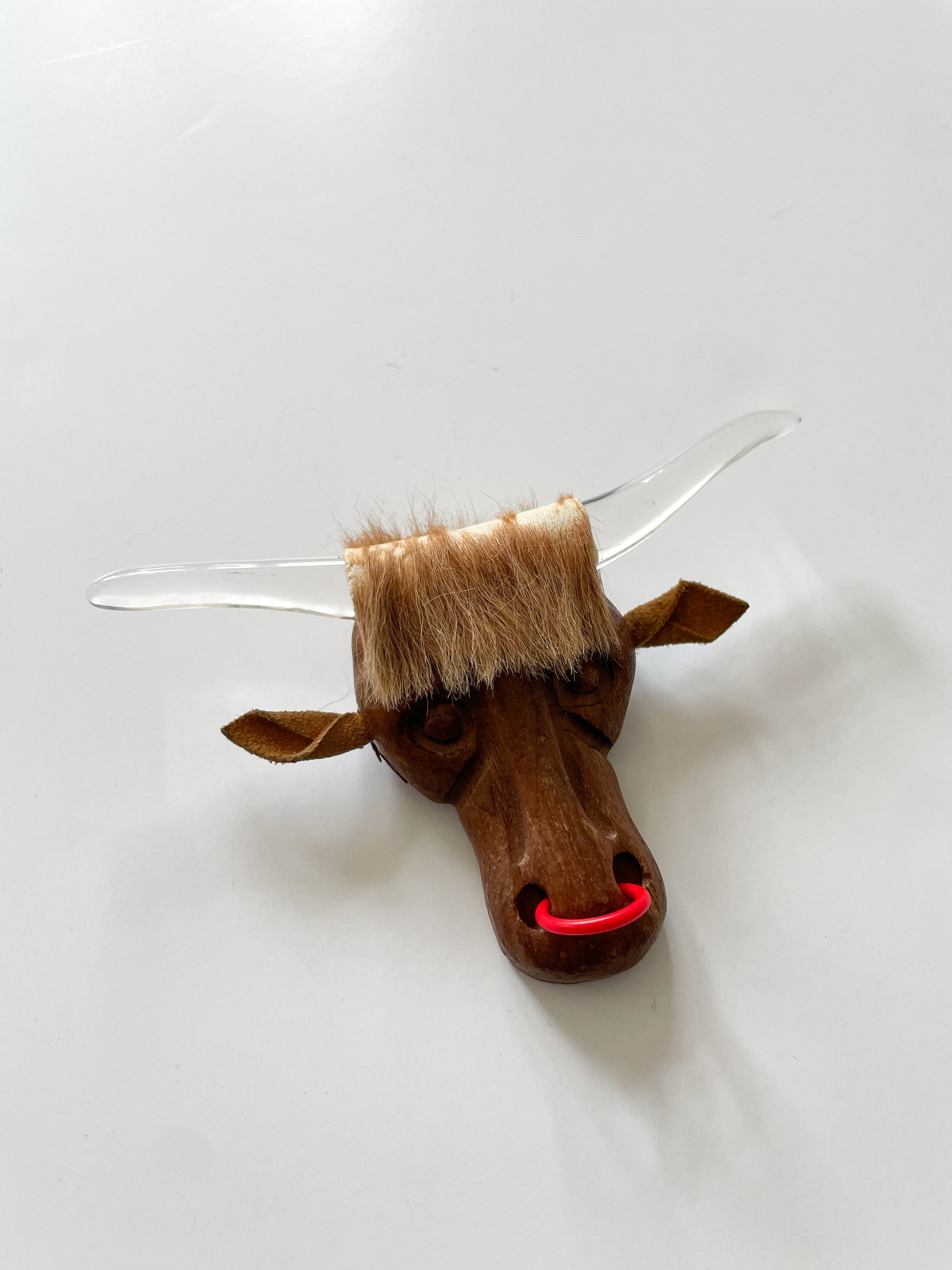 Featuring a wooden carved head with suede ears, a piece of suede "fur" wrapped over the horns, and clear lucite horns with a red lucite nose ring. Brooch clasp at the back.