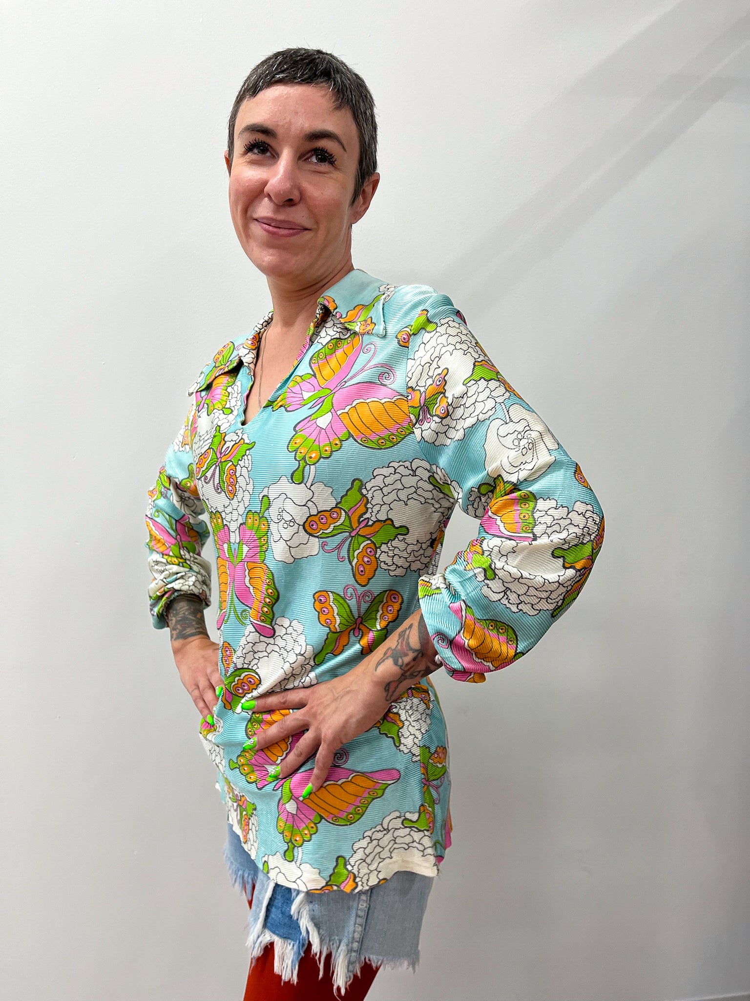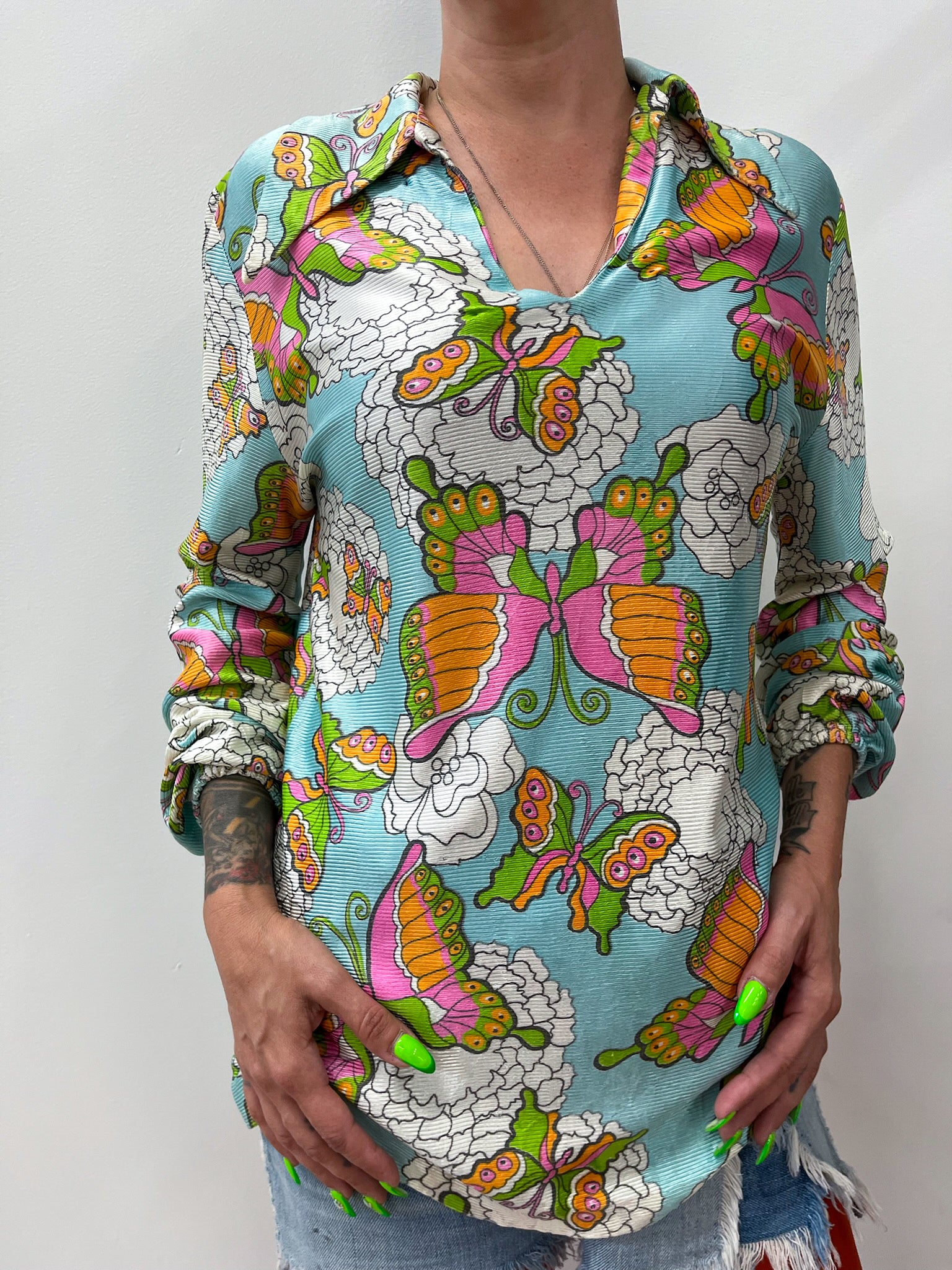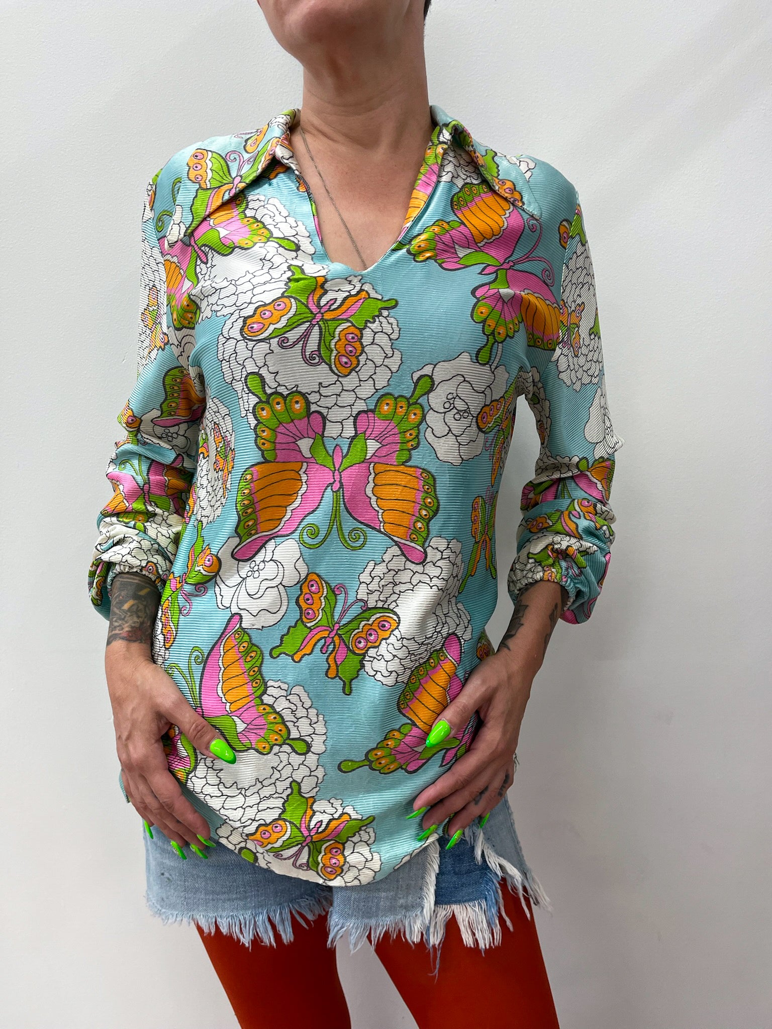 1970s Vintage Psychedelic Butterfly Print Tunic Blouse Top