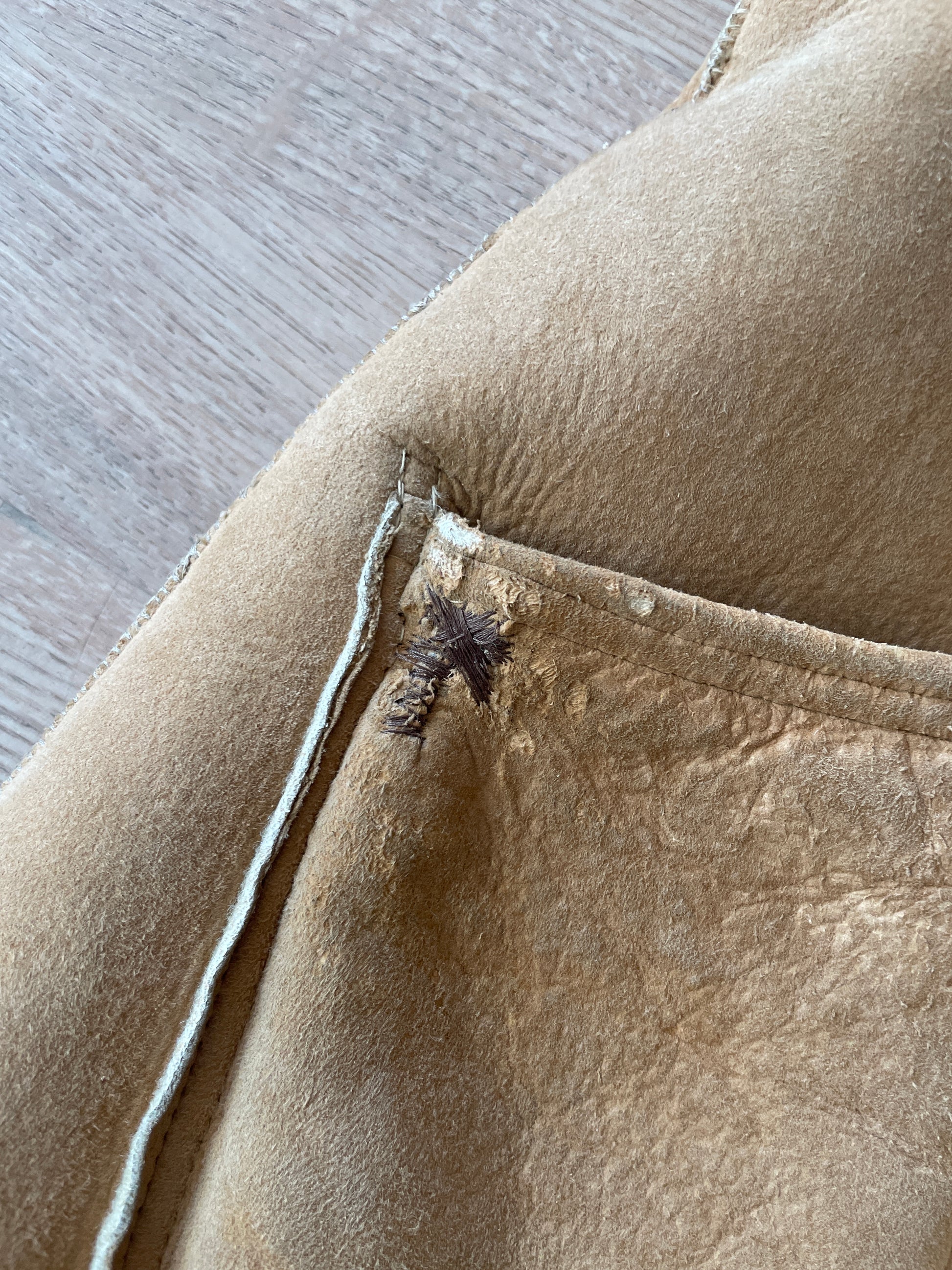 Condition: Good; we have replaced the metal chain / leather connection pieces on one side of the yoke; the suede is slightly dingy near pockets (has been brushed); there was one hole on the pocket that has been stabilized with dark brown thread (see updated photographs). Priced gently considering.