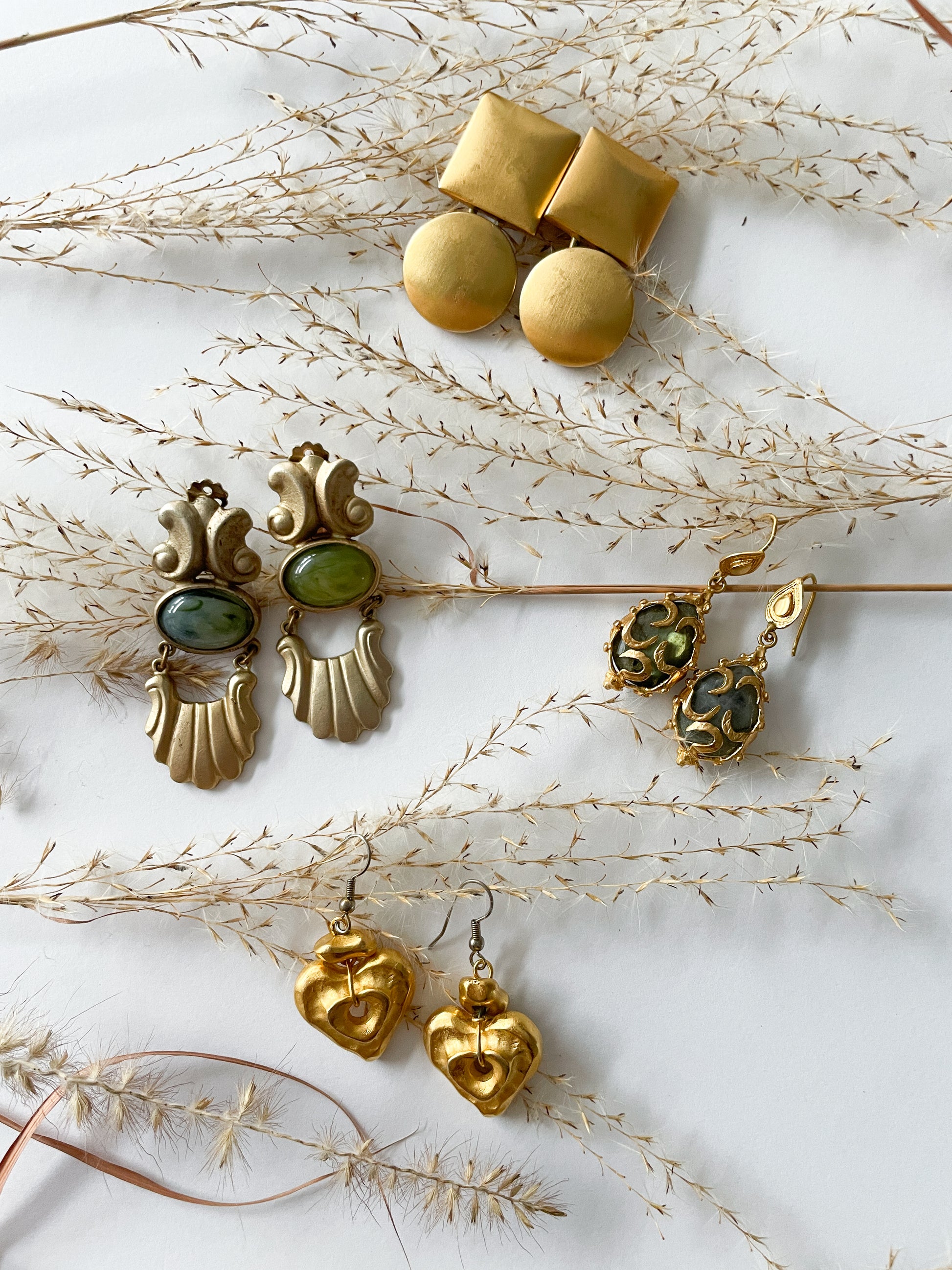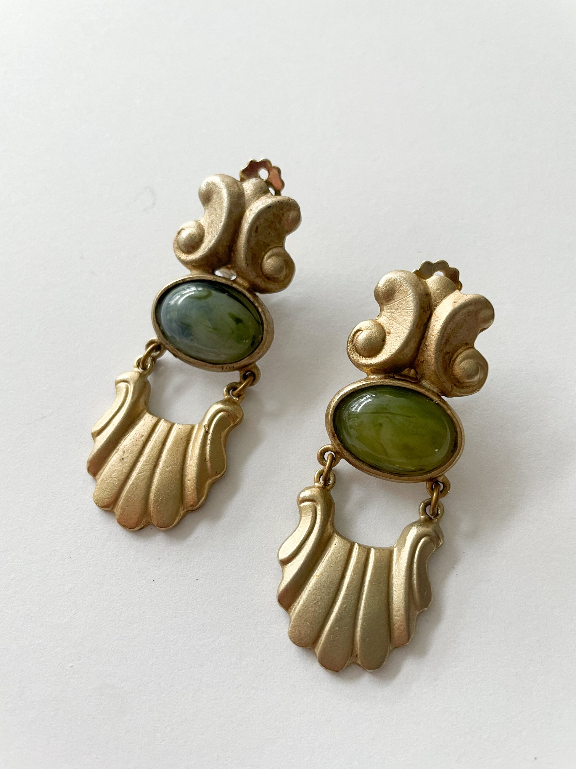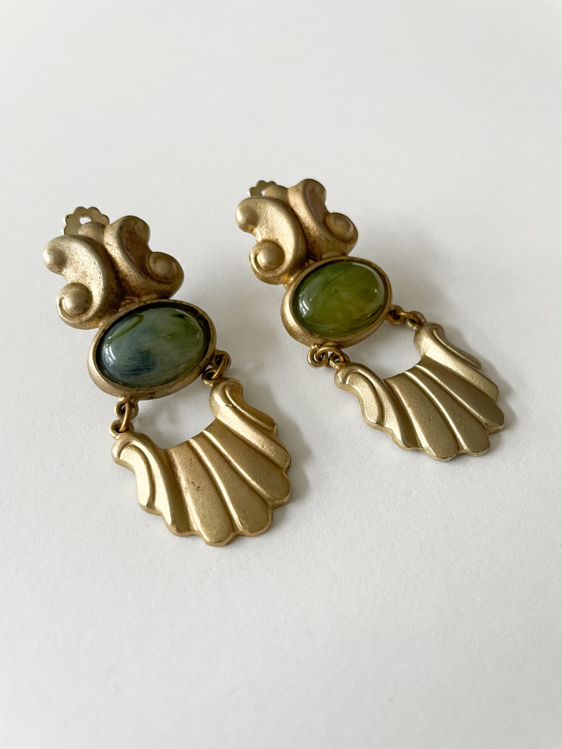 1980s Vintage Scalloped Gold and Green Clip On Earrings