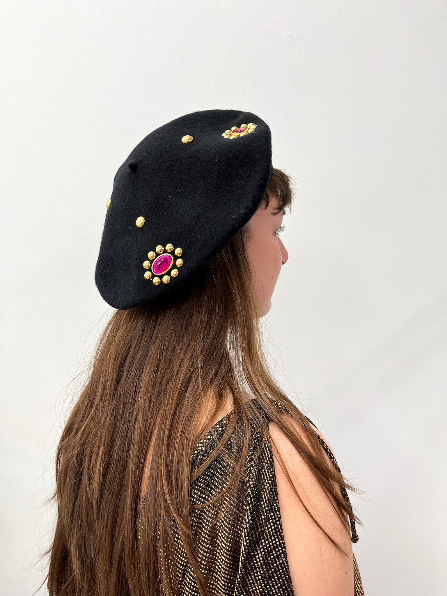 A total classic accessory for any vintage lover's wardrobe, these berets feature big gems & gold metal accents. 10.5" diameter. Never worn / deadstock from the 1980s, so new to you!