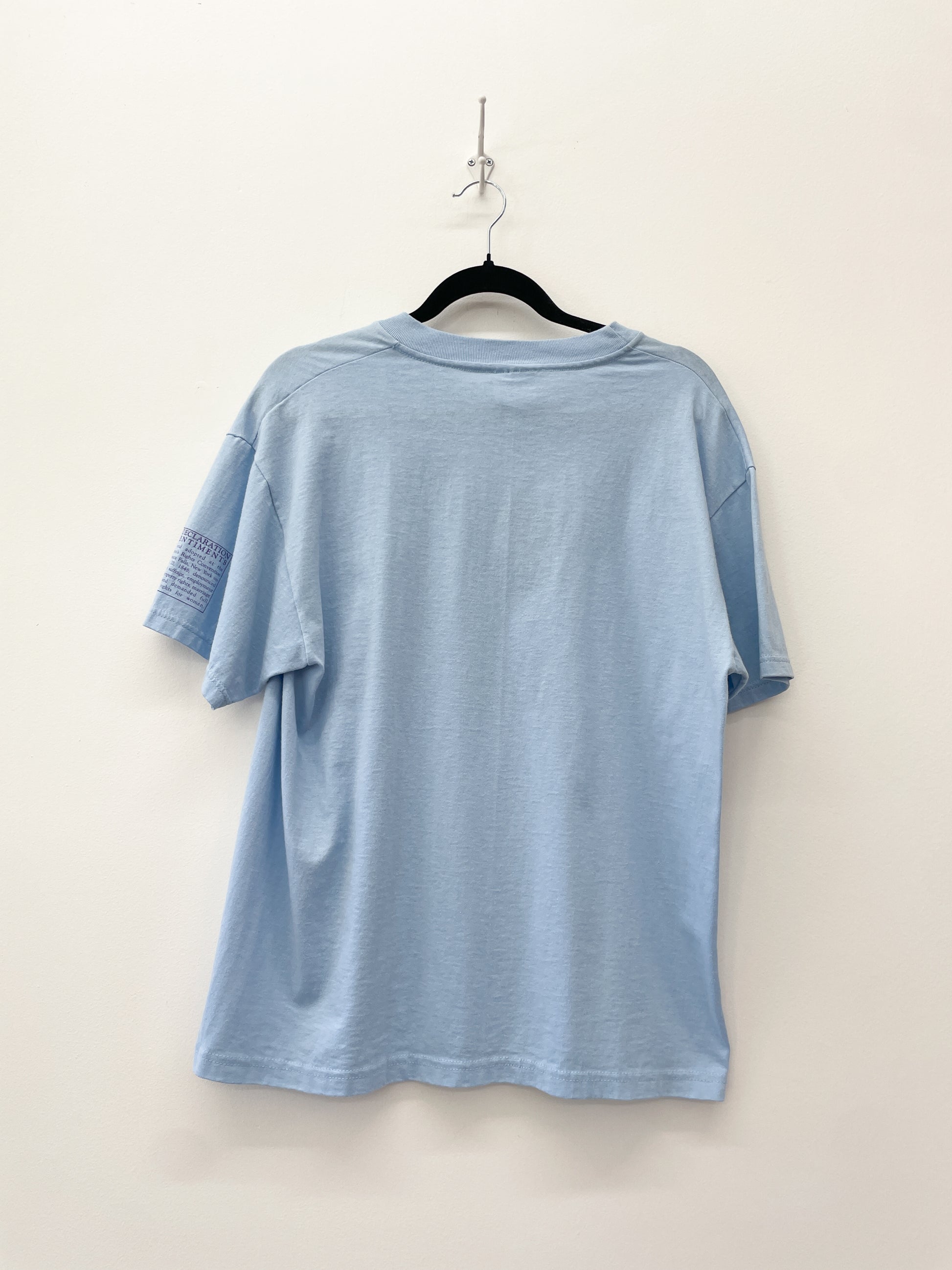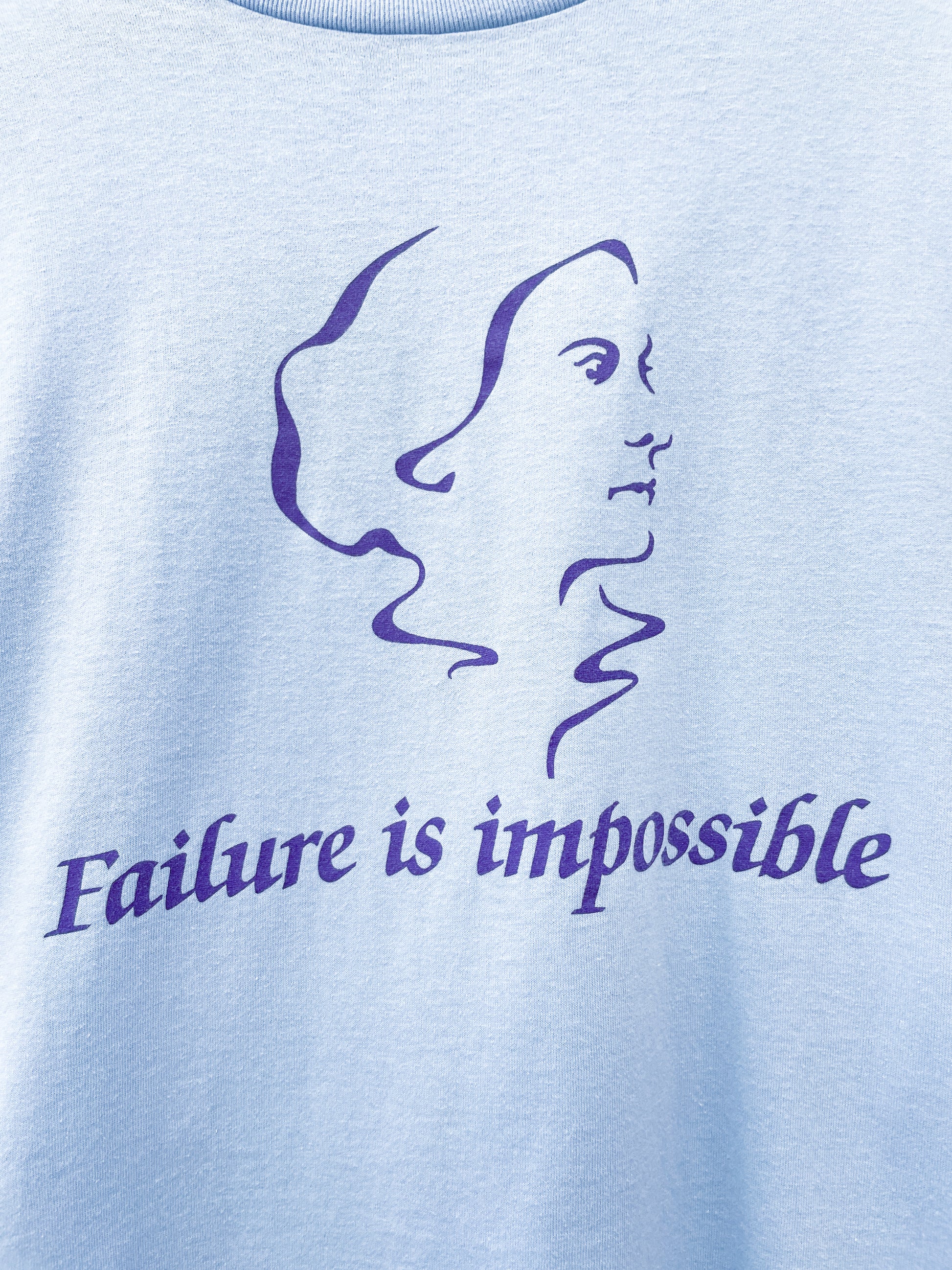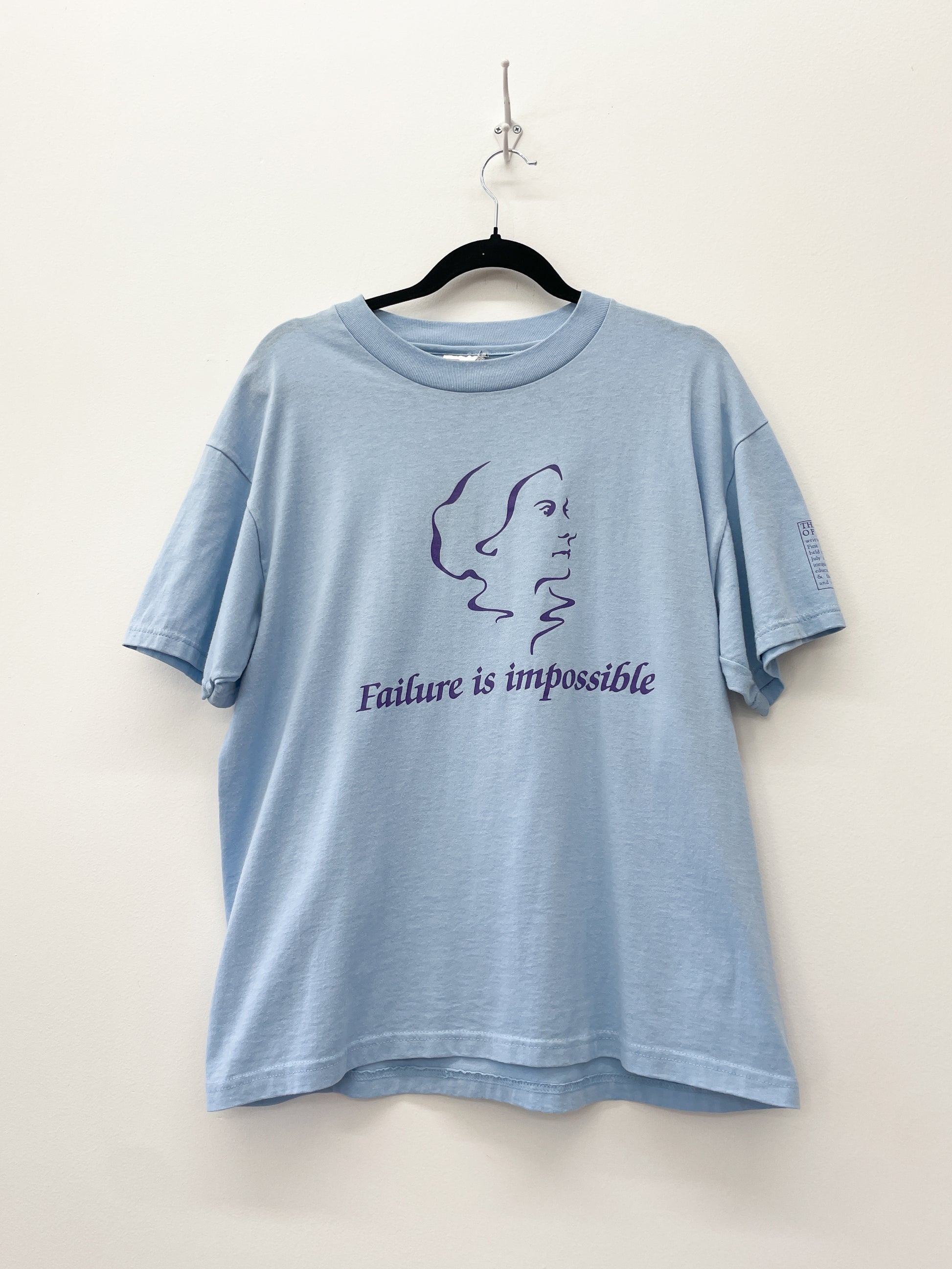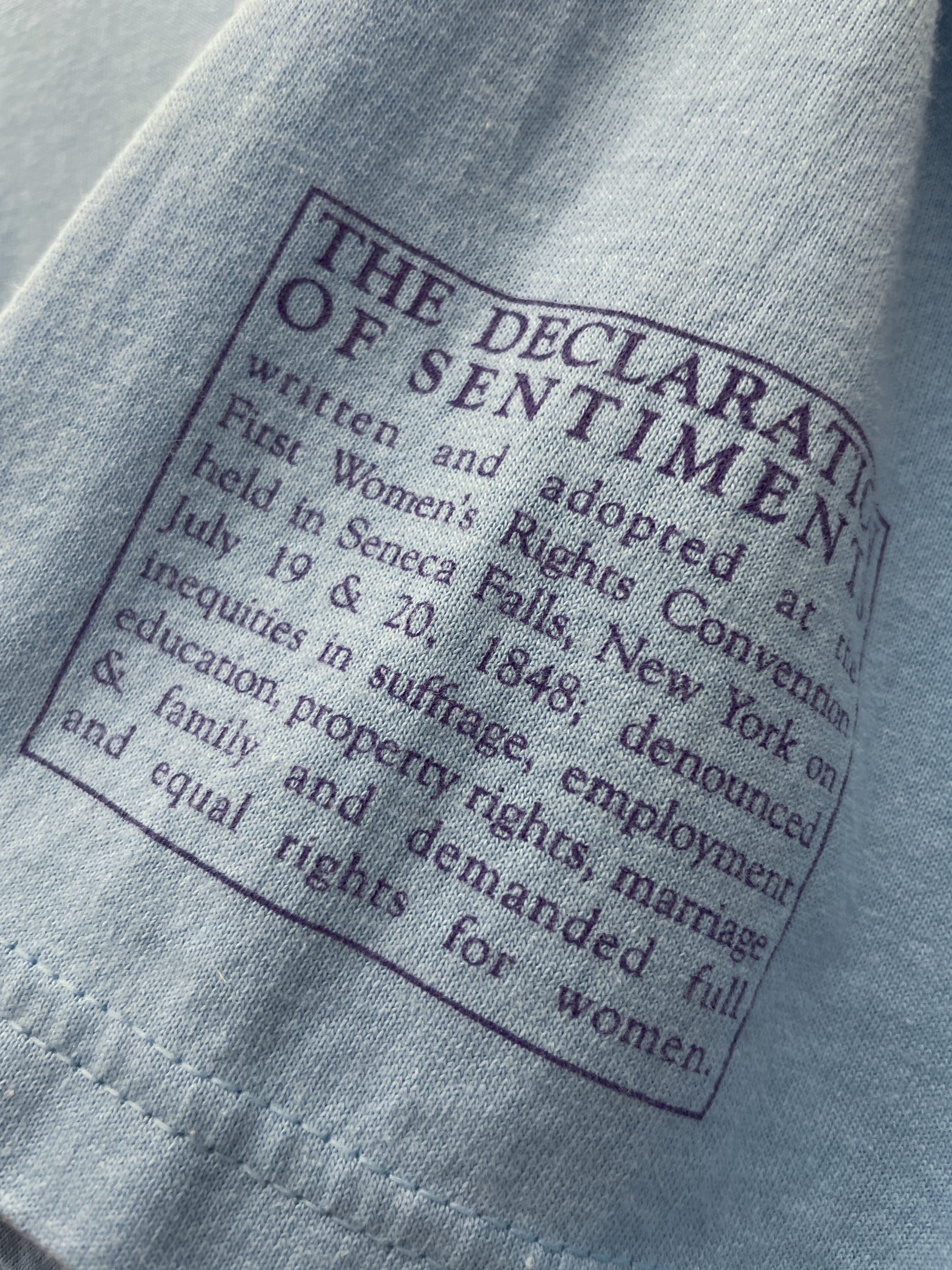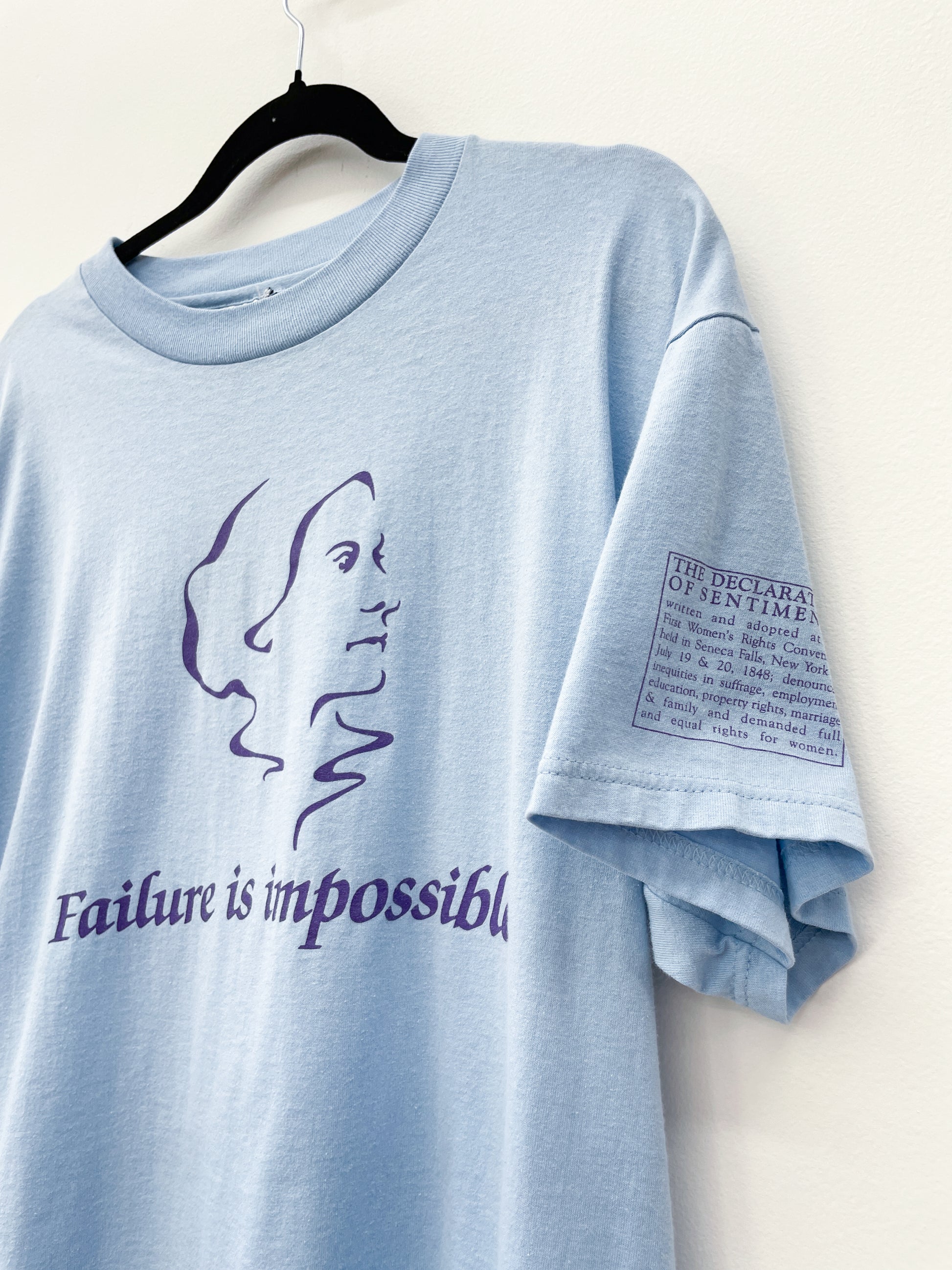 Failure is impossible! Baby blue tee with purple graphics & a copy of the "Declaration of Sentiments" which guaranteed equal rights for women, on sleeve.