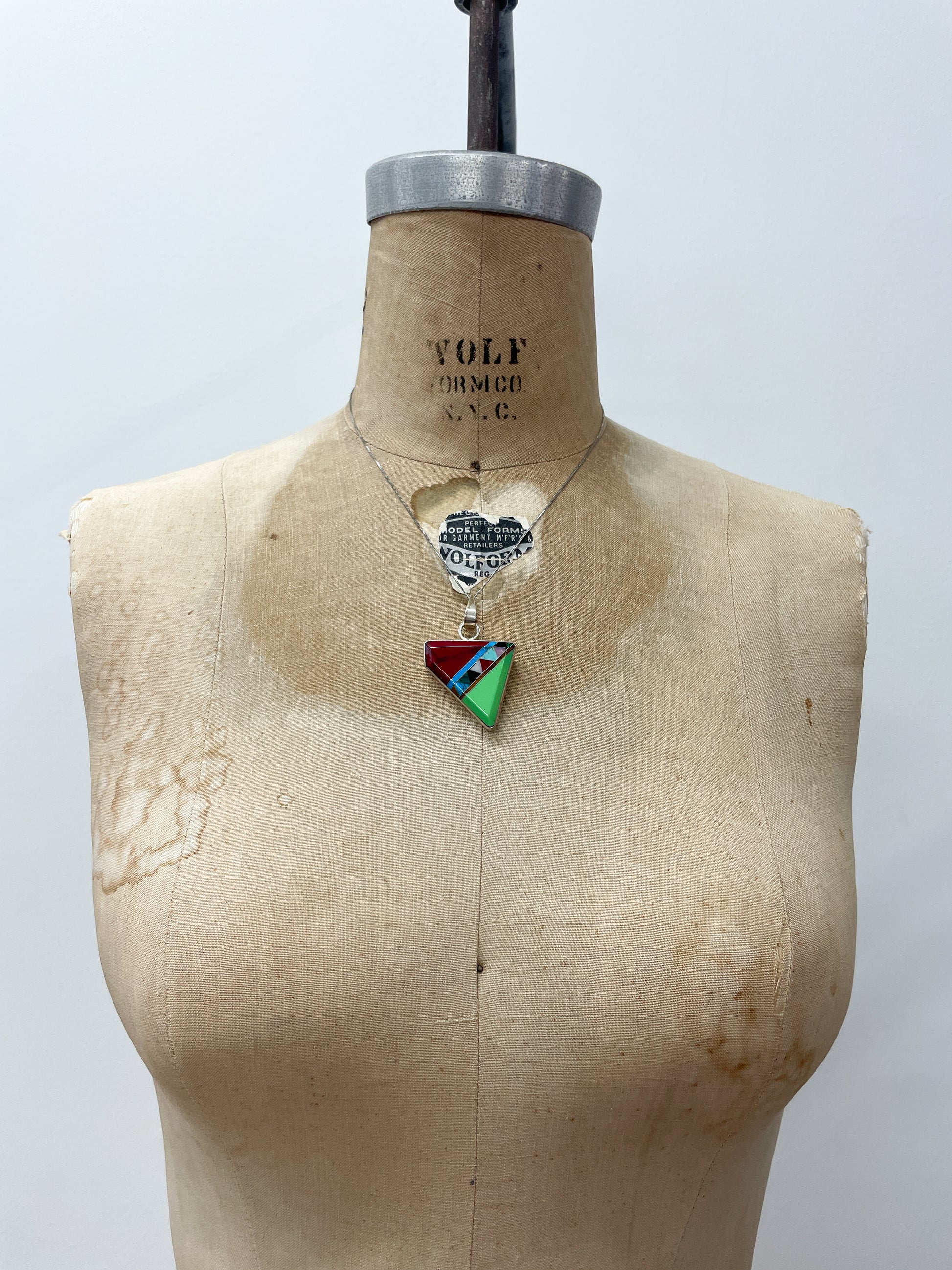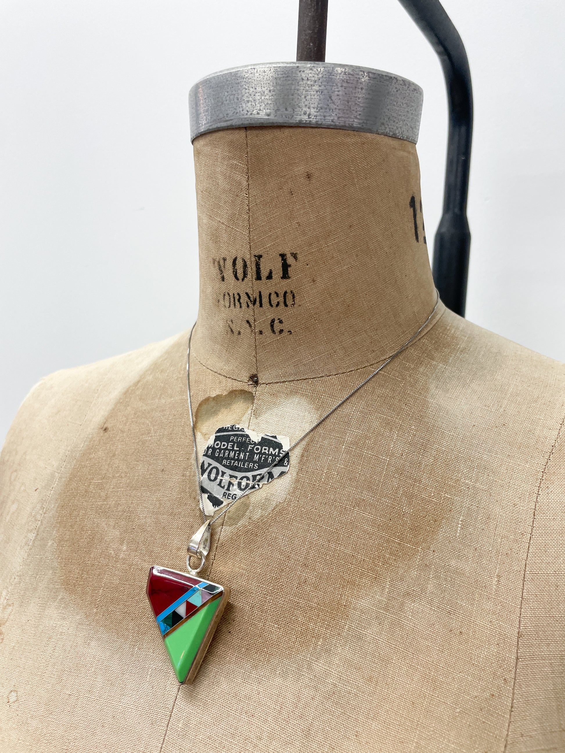 Very cool multi-stone inlay with triangle motif necklace in an asymmetrical sterling silver setting.