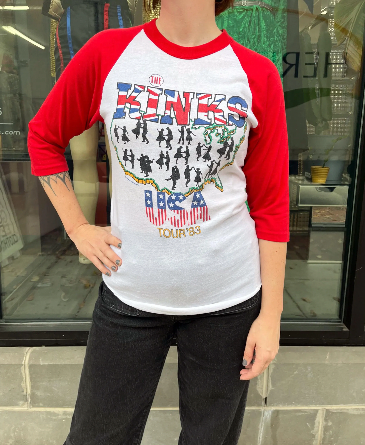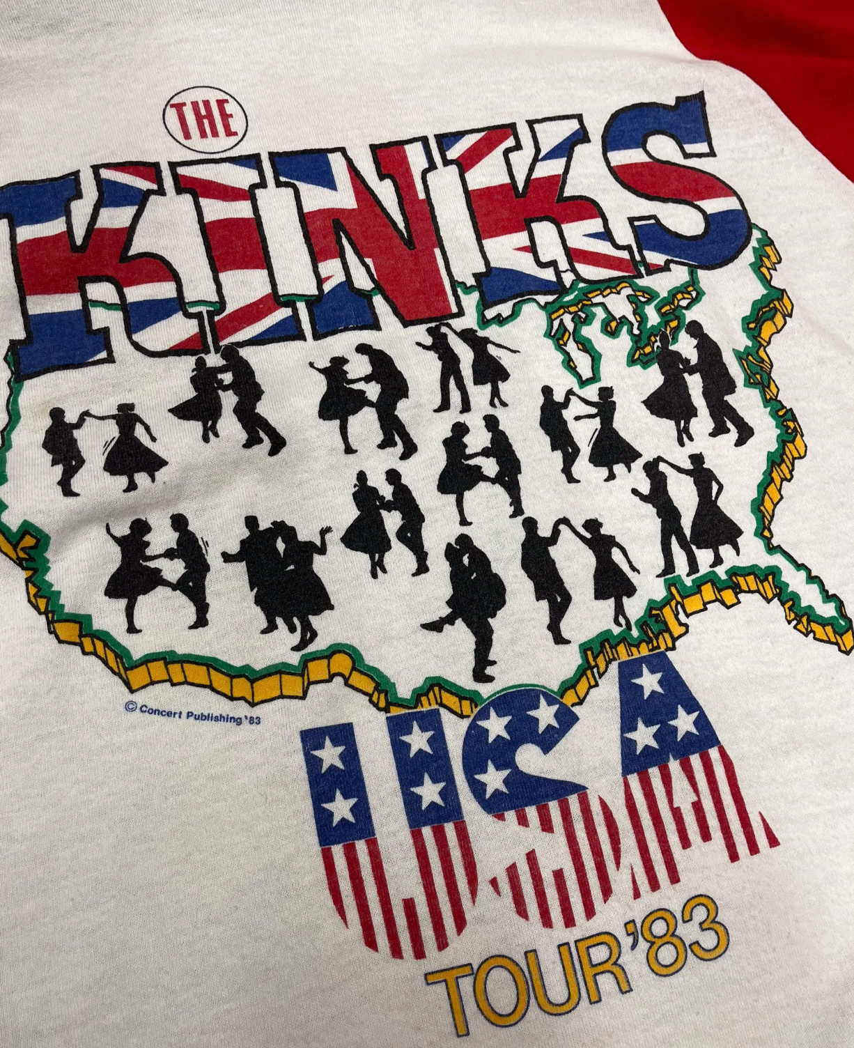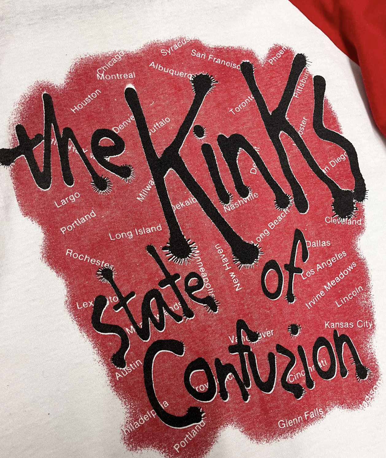 Super sweet The Kinks raglan shirt from the 1983 USA tour for State of Confusion. Super soft and perfectly broken in, bright graphics.