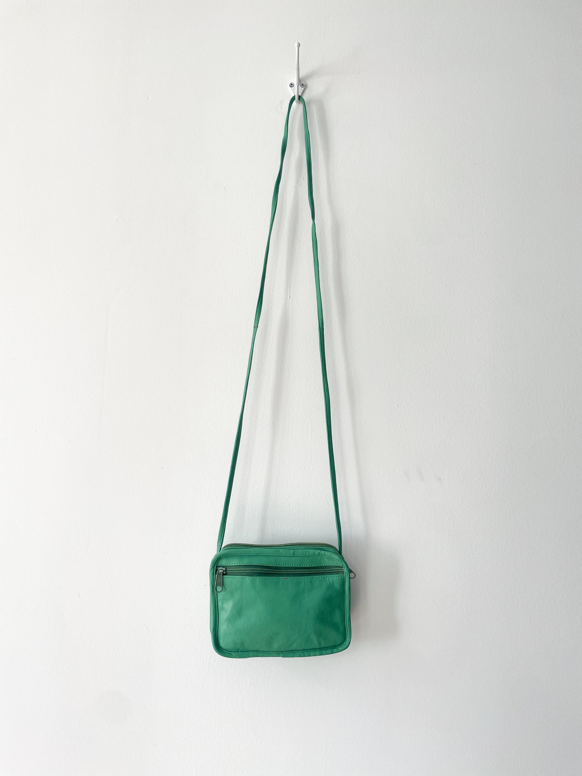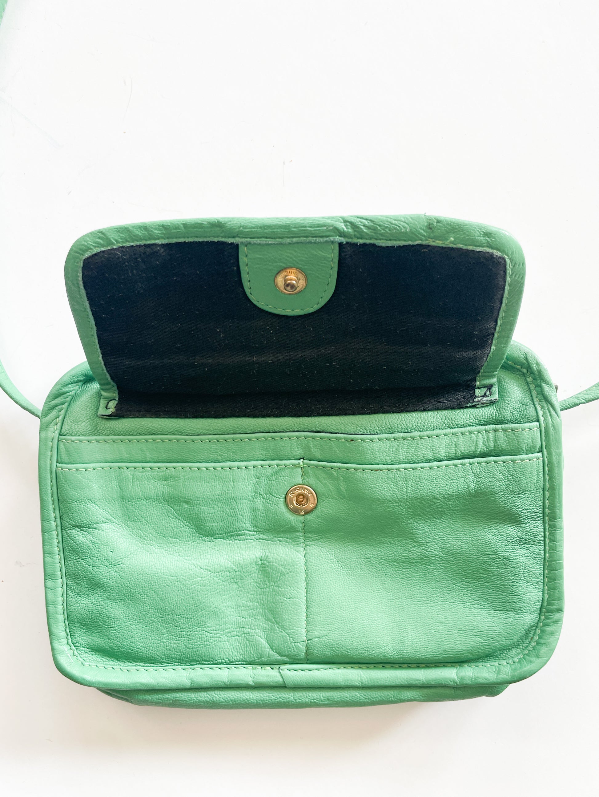 This fun little crossbody has a zip closure with a front pocket that closes via snap button. Inside the front pocket are pockets designed for your cash and cards. There is also a pocket on the back of the bag that zips shut.