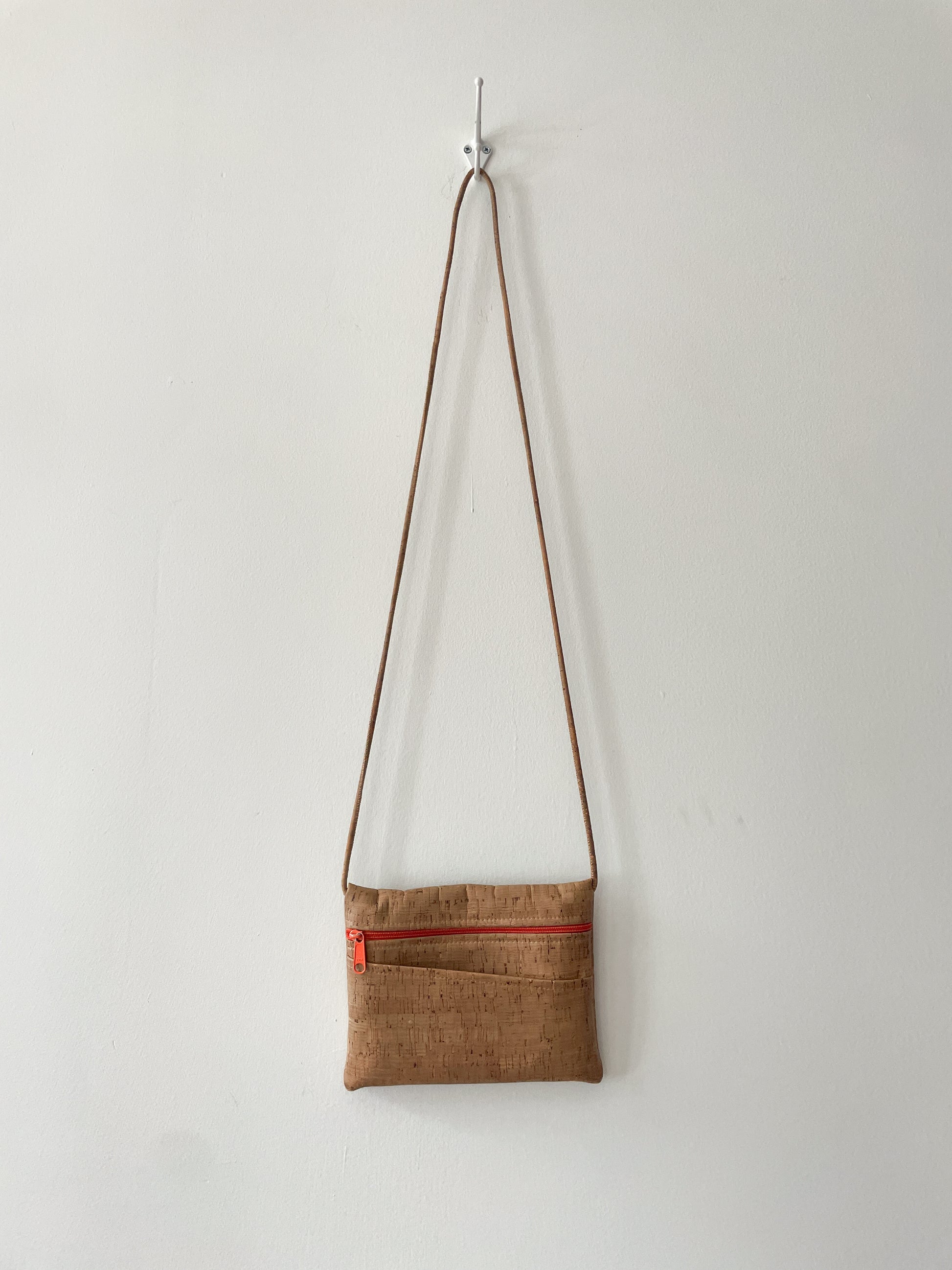This fun crossbody is a unique piece that brings attention to any outfit. The bright orange zipper is a lovely pop of color on the front of the bag. There is one open pocket on the front of the bag.