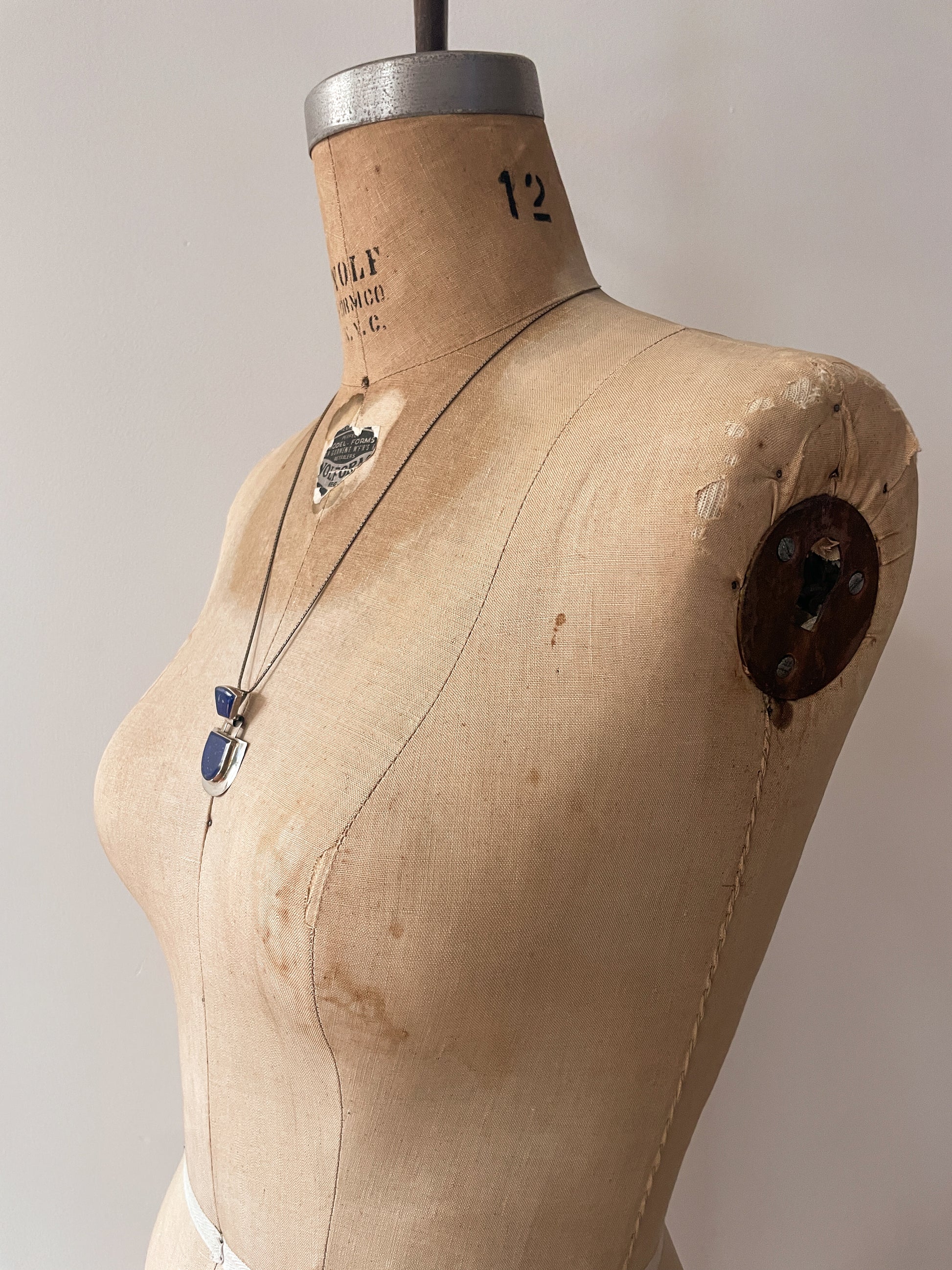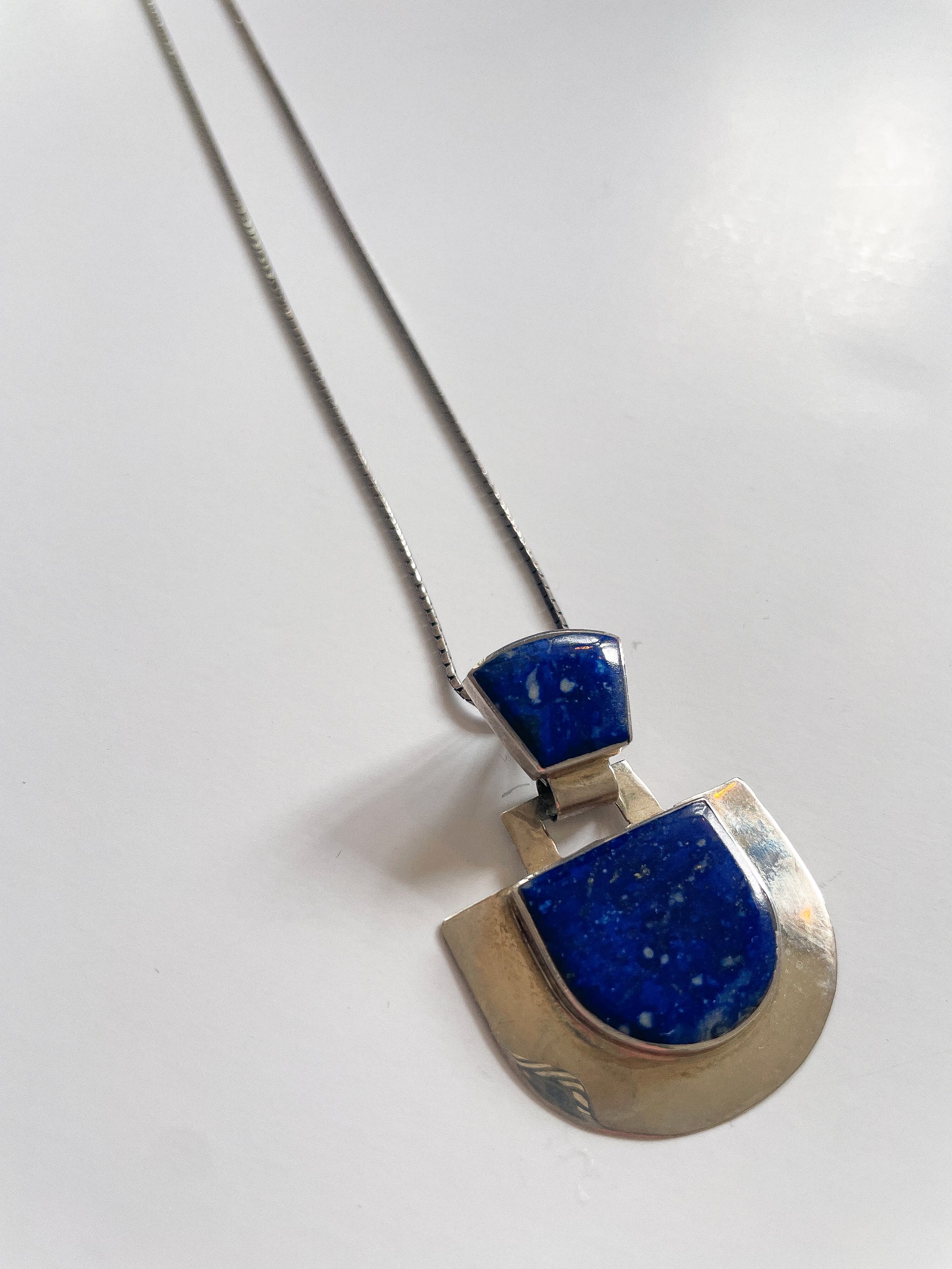 1990s Vintage Sterling Silver & Lapis Lazuli Abstract Statement Modernist Pendant Necklace