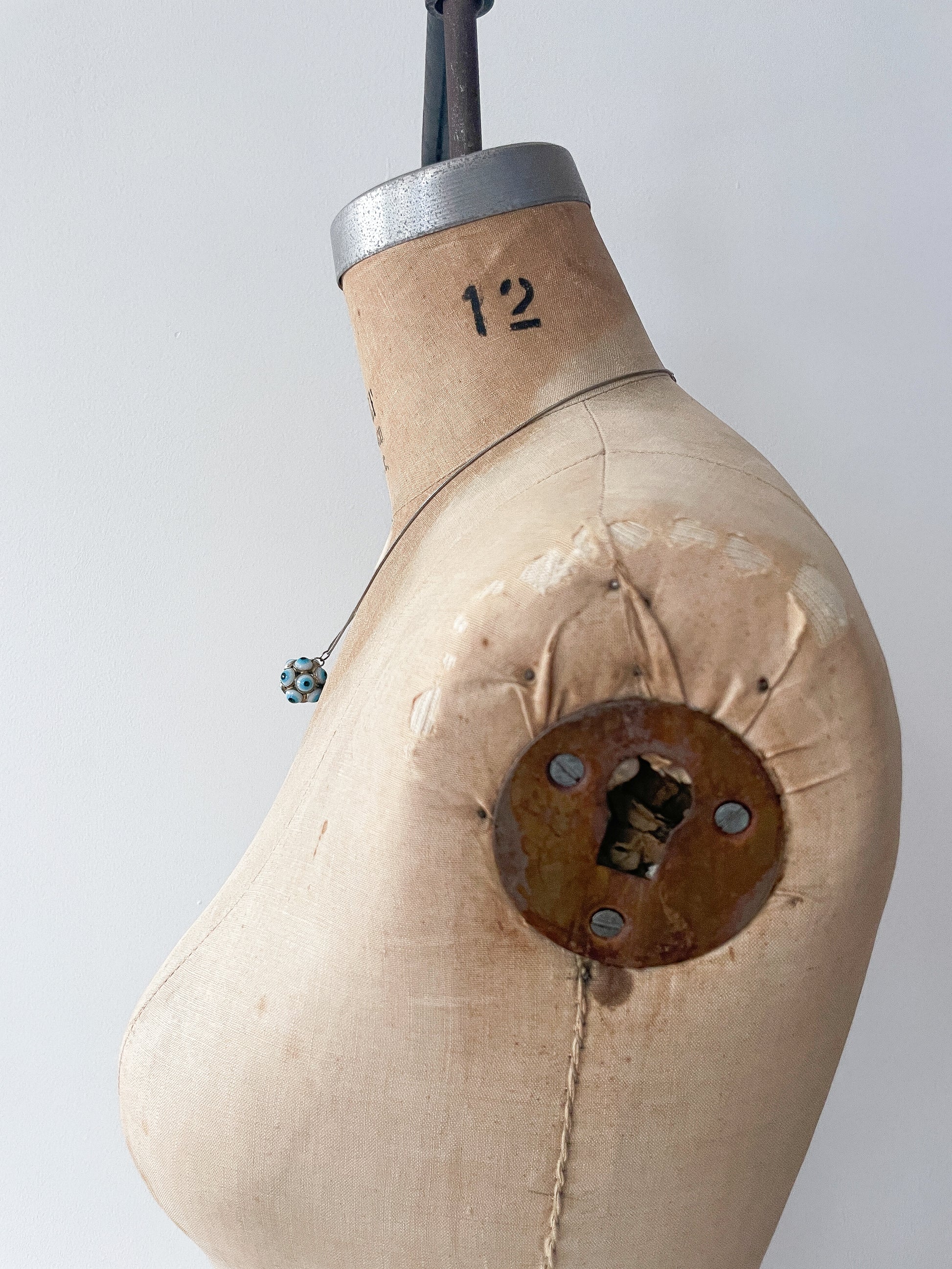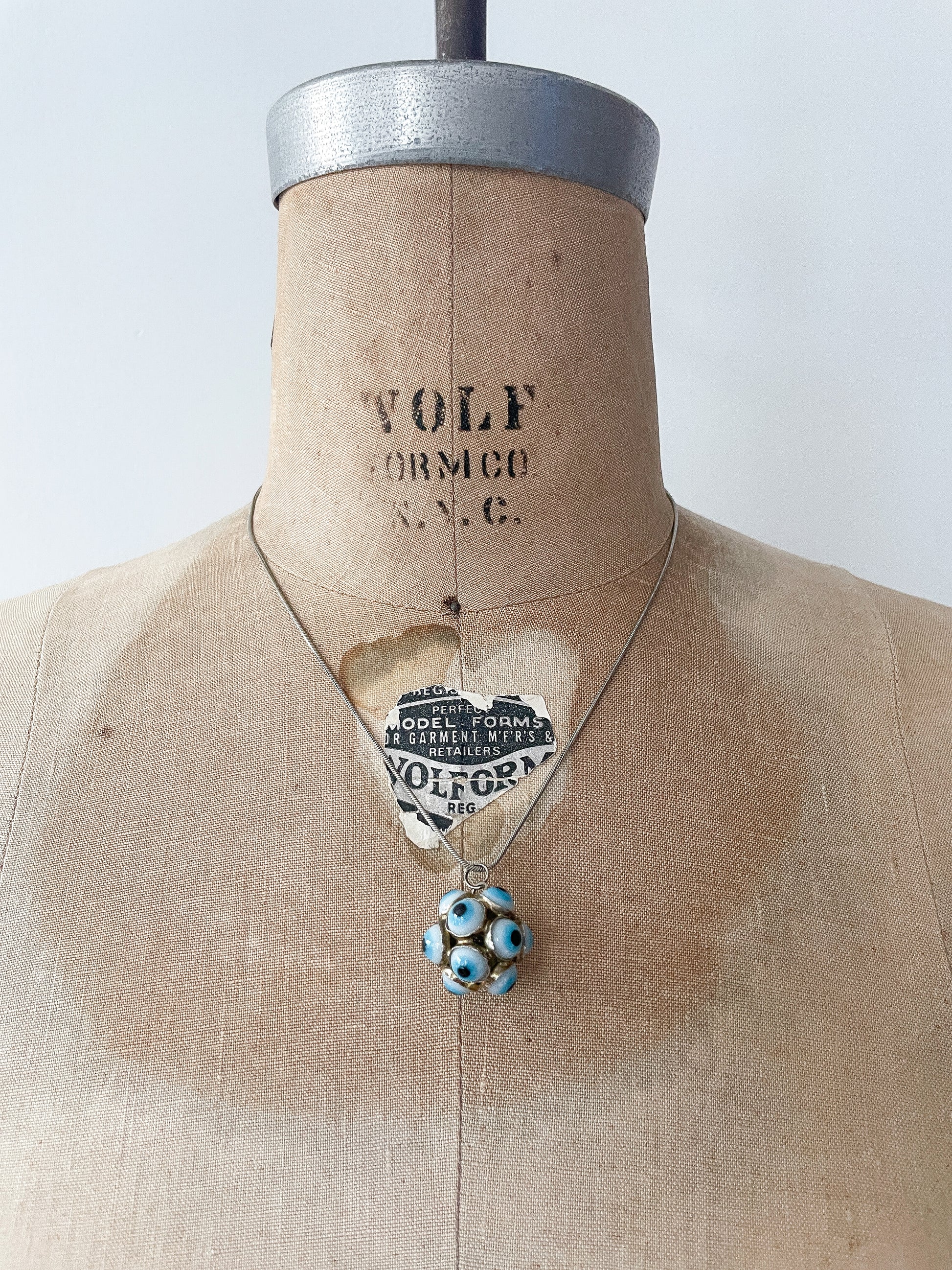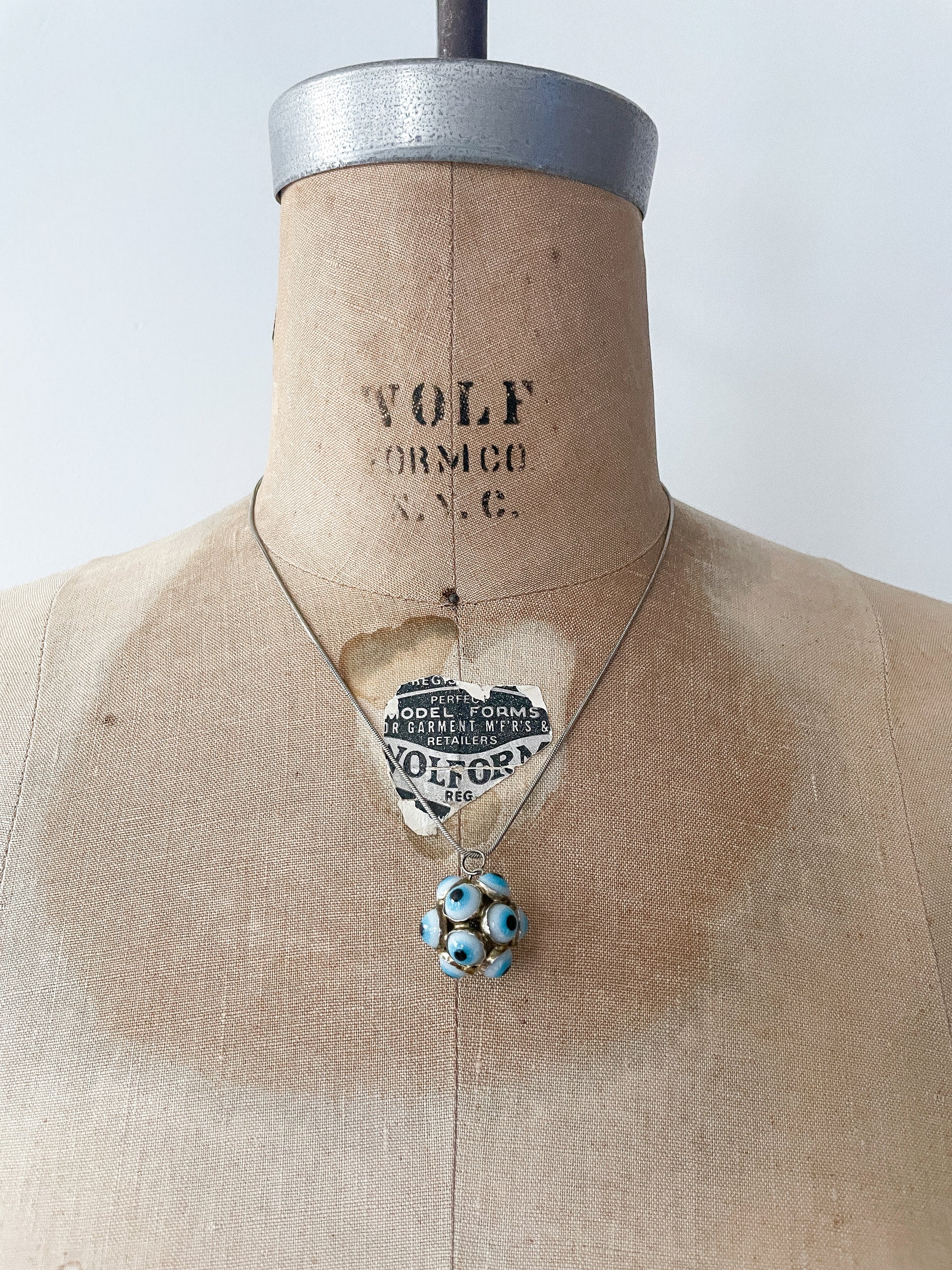 Obsessed with this 1950s "Sputnik" multi evil eye (12 eyes in a globe formation!) to ward off evil spirits! Hand-blown glass on a brass plate, sterling silver chain. Anatolian, from Turkey. A rare find!