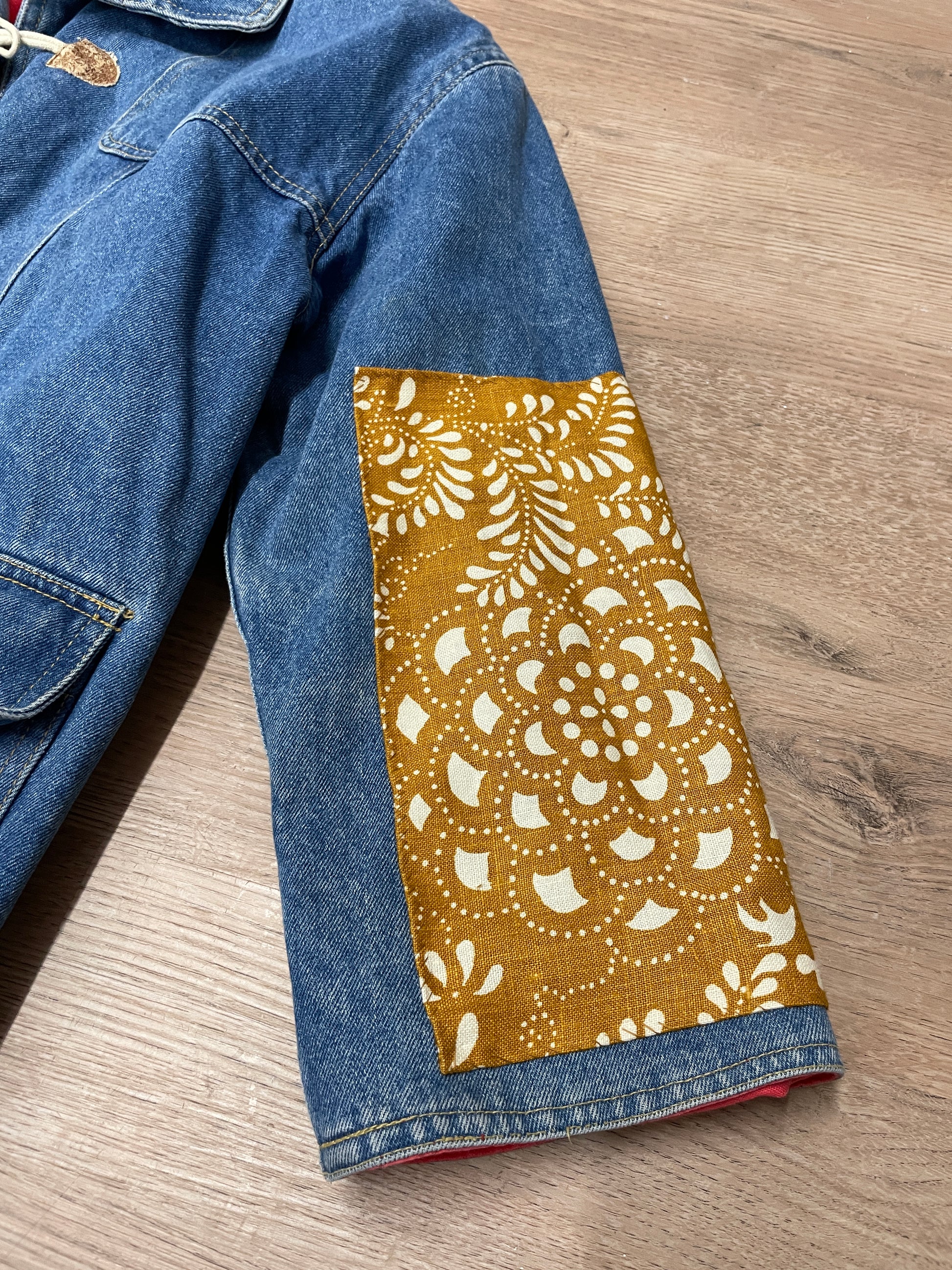 This 1990s denim piece came to us in a dirty, dinged up state; after many soaks she cleaned up except around the elbow areas. So, we got creative! We applied the patches to the sleeves because we believe this great chore coat was worth saving! Patches are from our vintage fabric stash that we've hoarded for years & were voted on by the fine folks of Instagram. Bright red lining, four toggles down the front, two pockets with velcro closures at the waist.