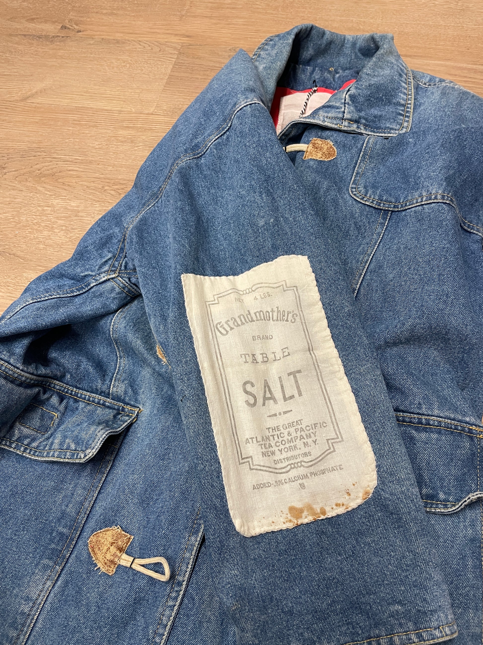 1990s Vintage Wooden Toggle Denim Chore Coat Jacket With Vintage Fabric Patches