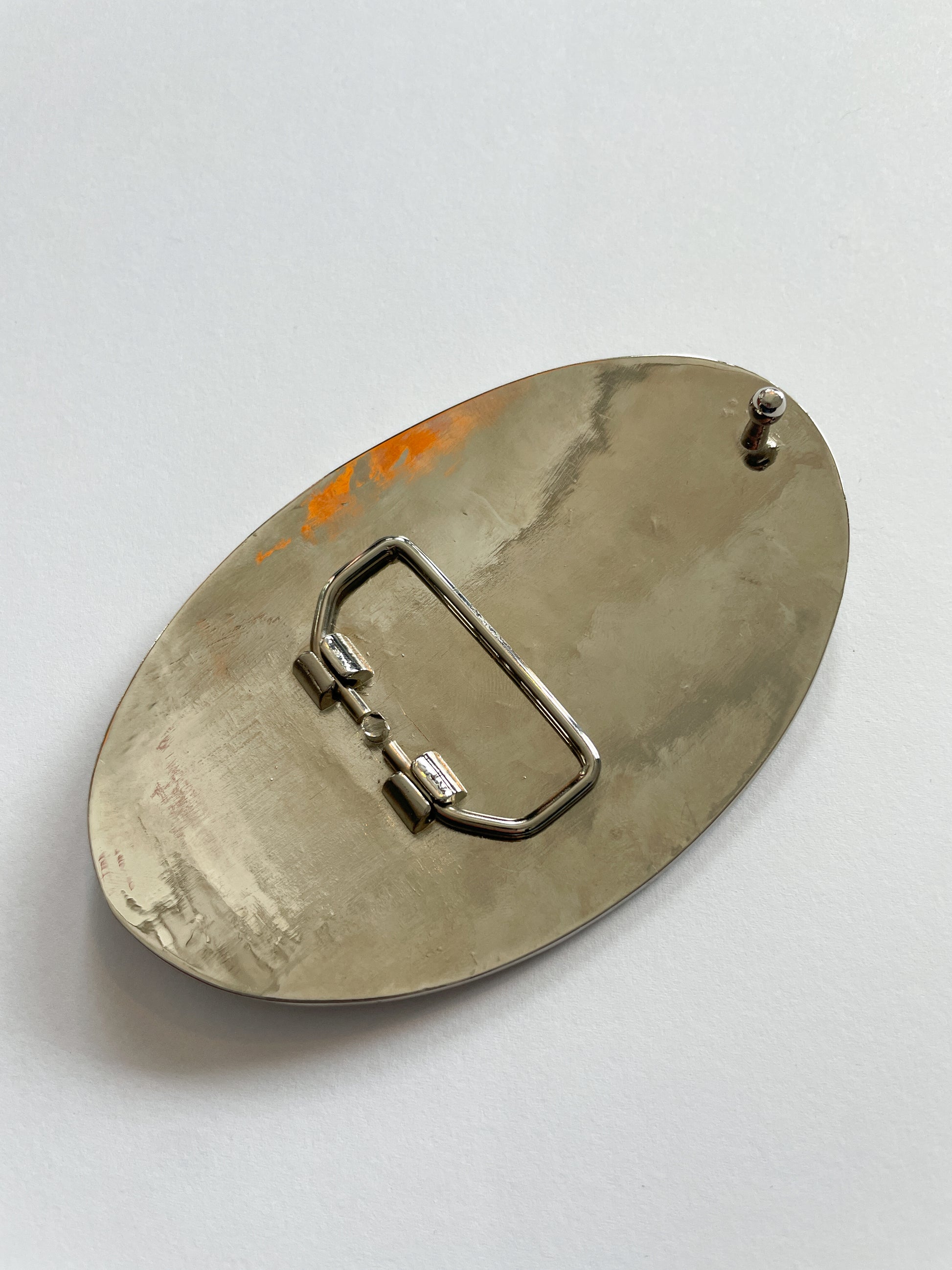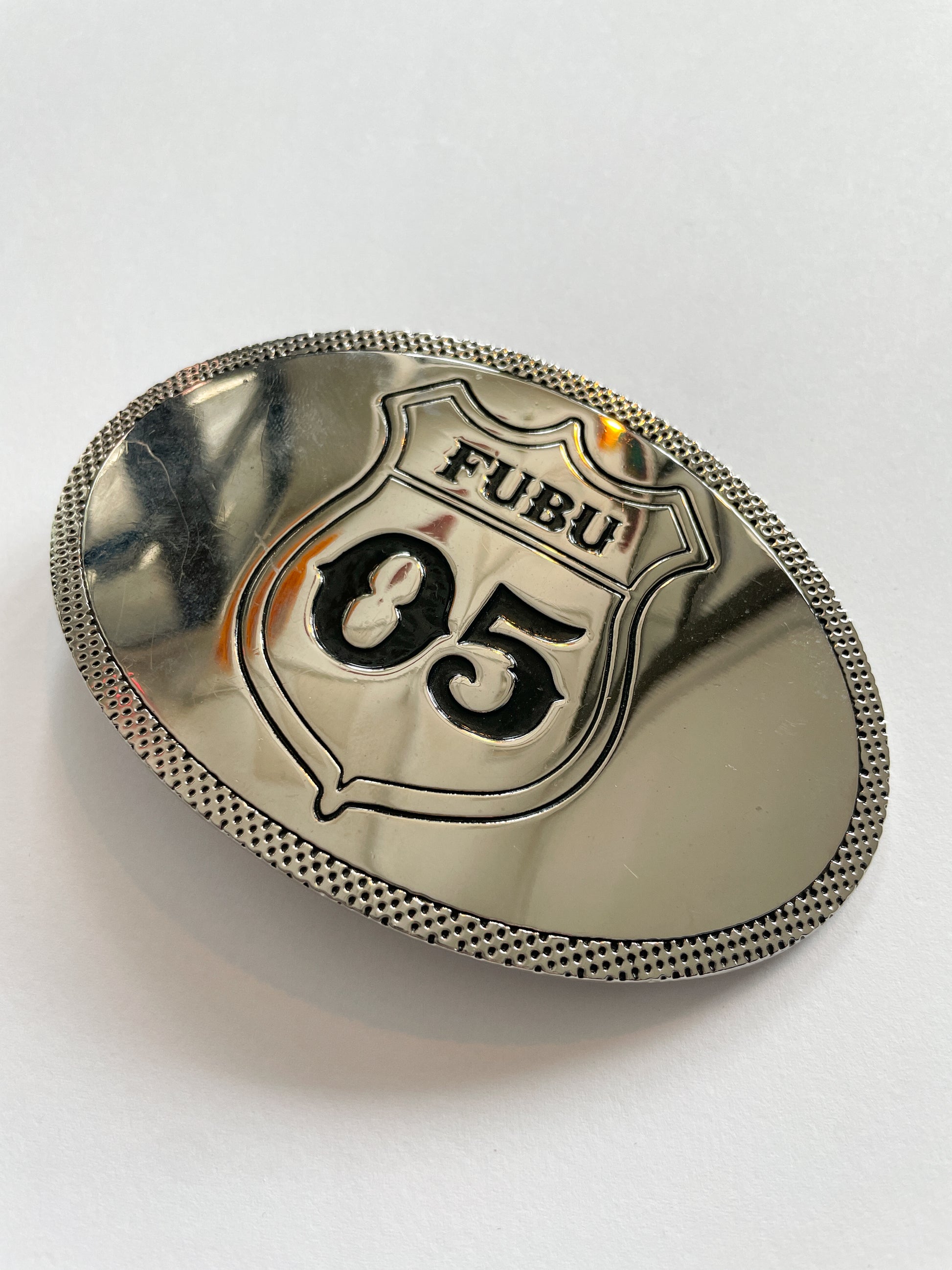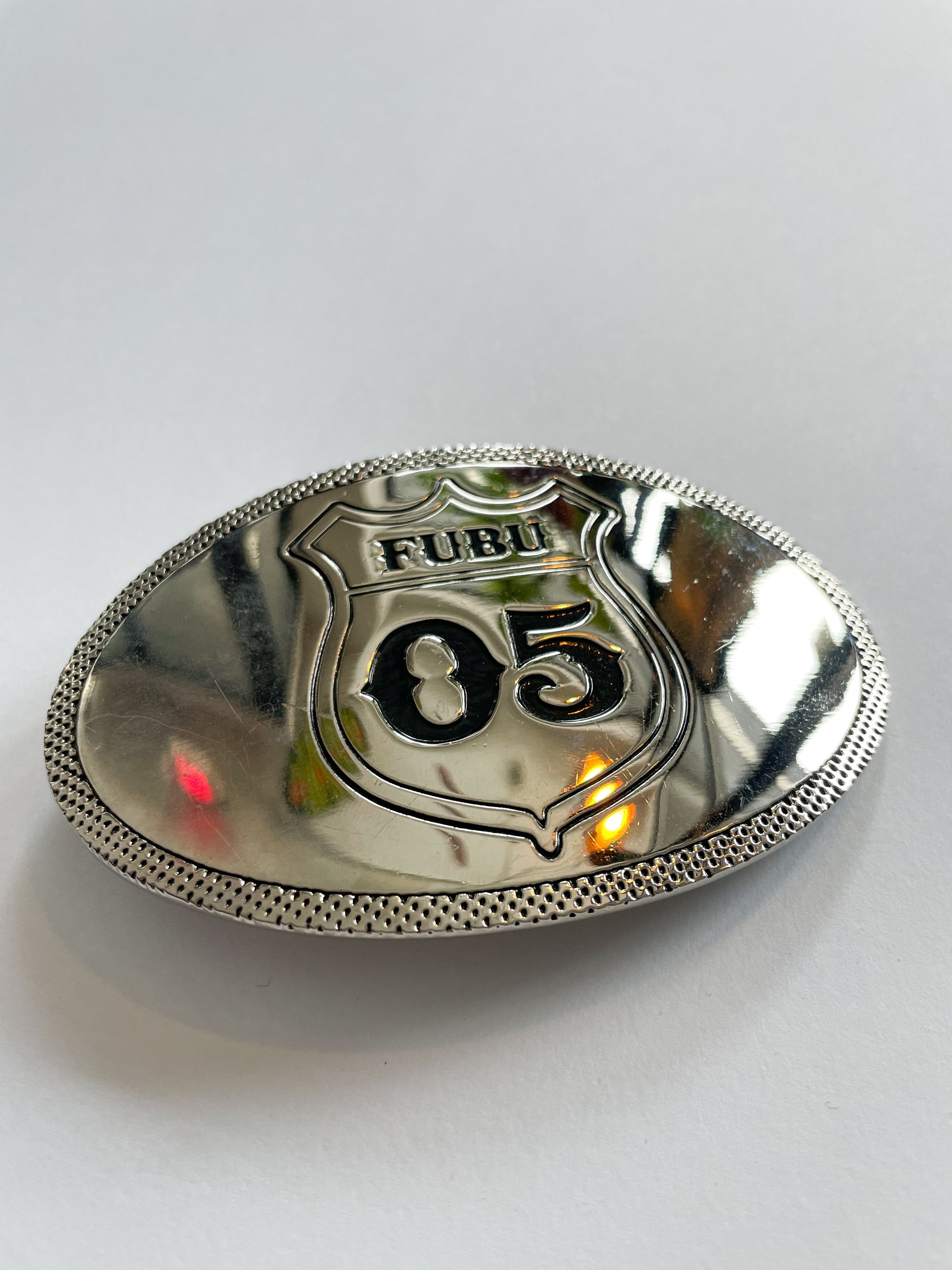 FUBU 05 logo belt buckle on silver toned metal, very mirror-like! 2.25" x 4.5", will fit belts 1.5" or smaller.