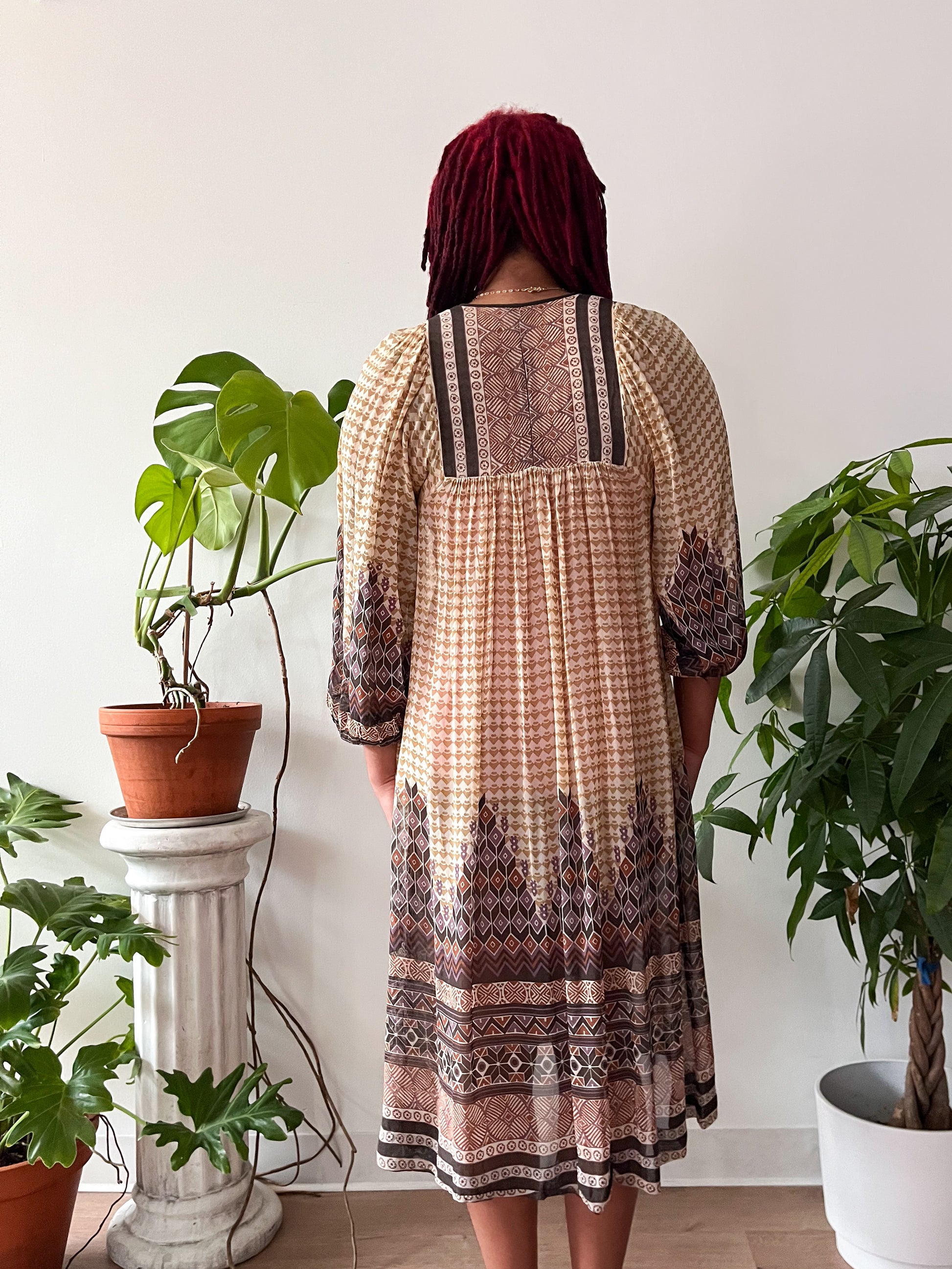 1970s Vintage Patterned Sheer Tunic Hippie Dress with Wood Bead Neck Tie