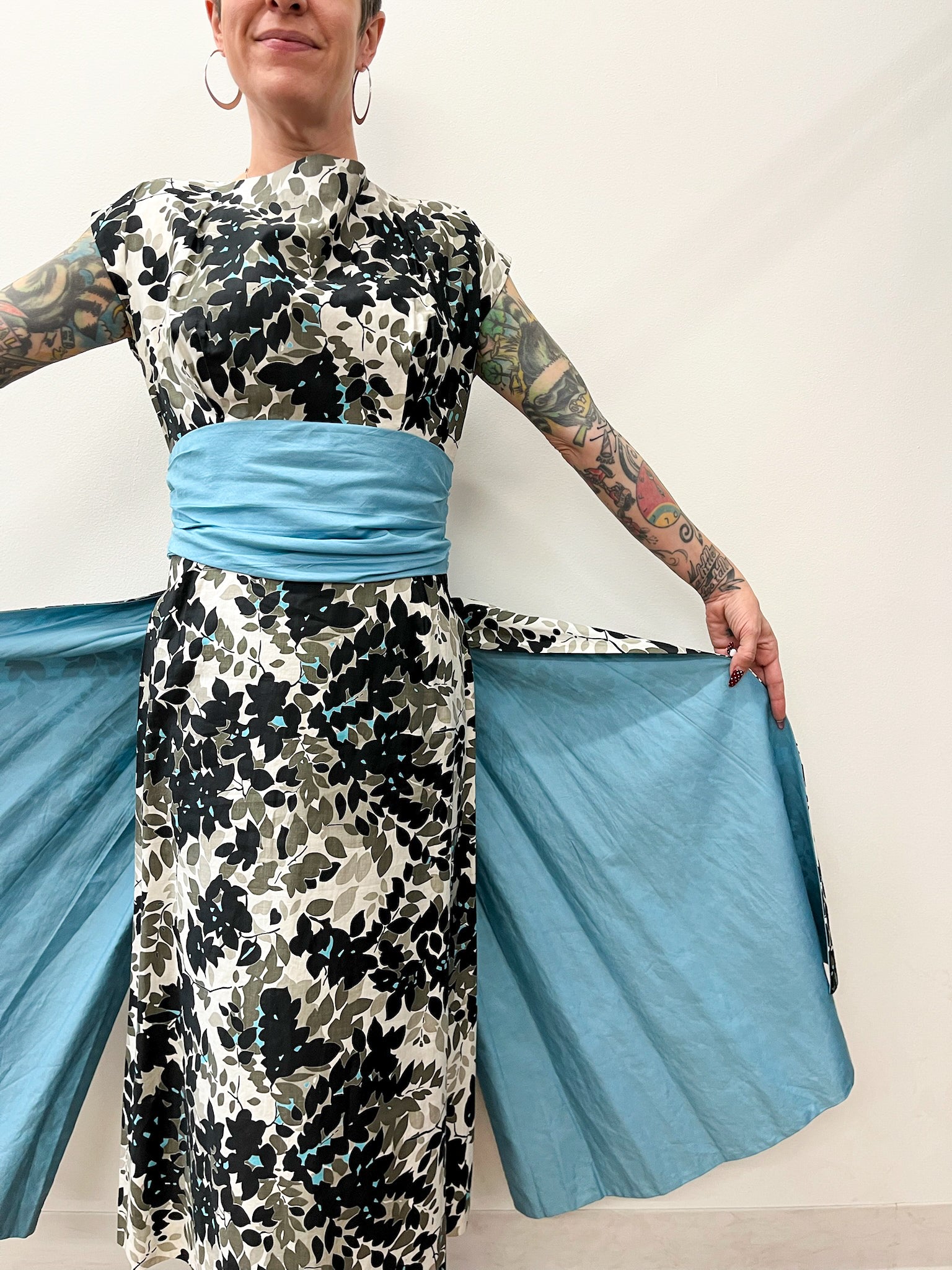 1950s Vintage Formal Cocktail Fern Print Dress with Dramatic Blue Sash and Train