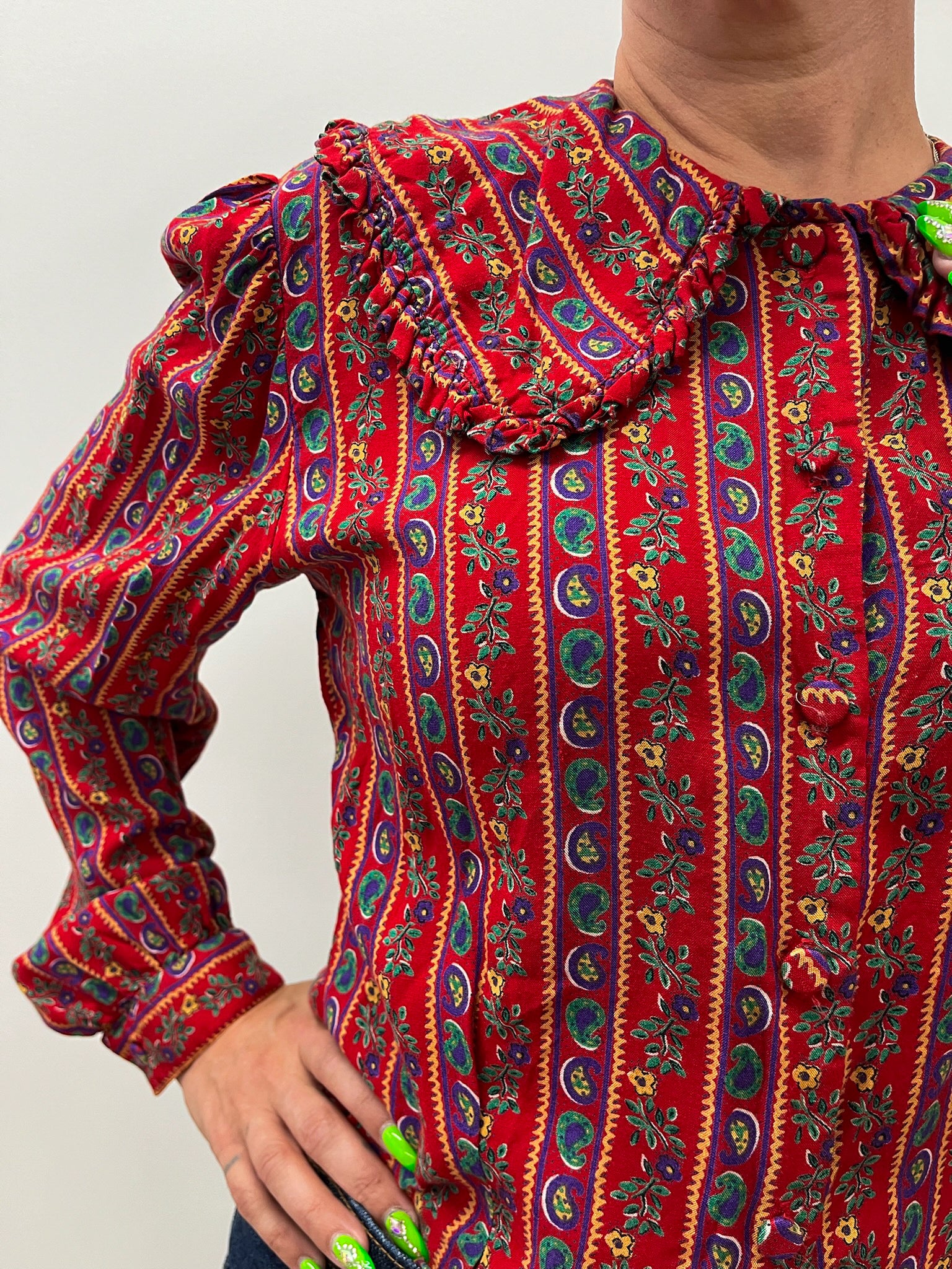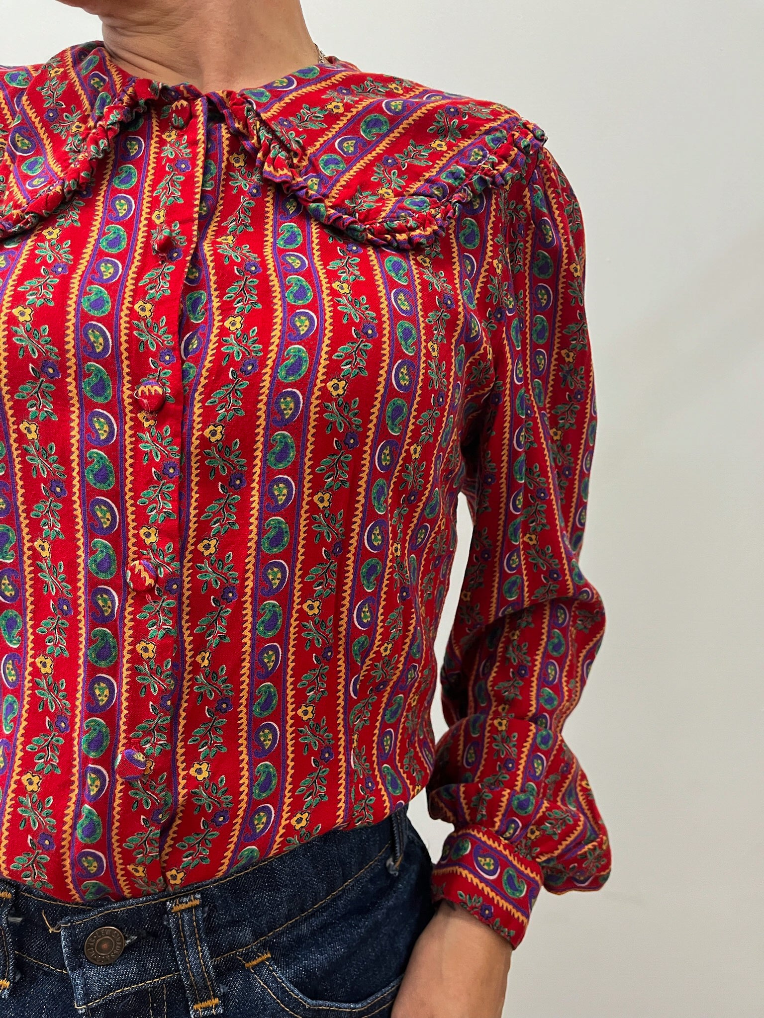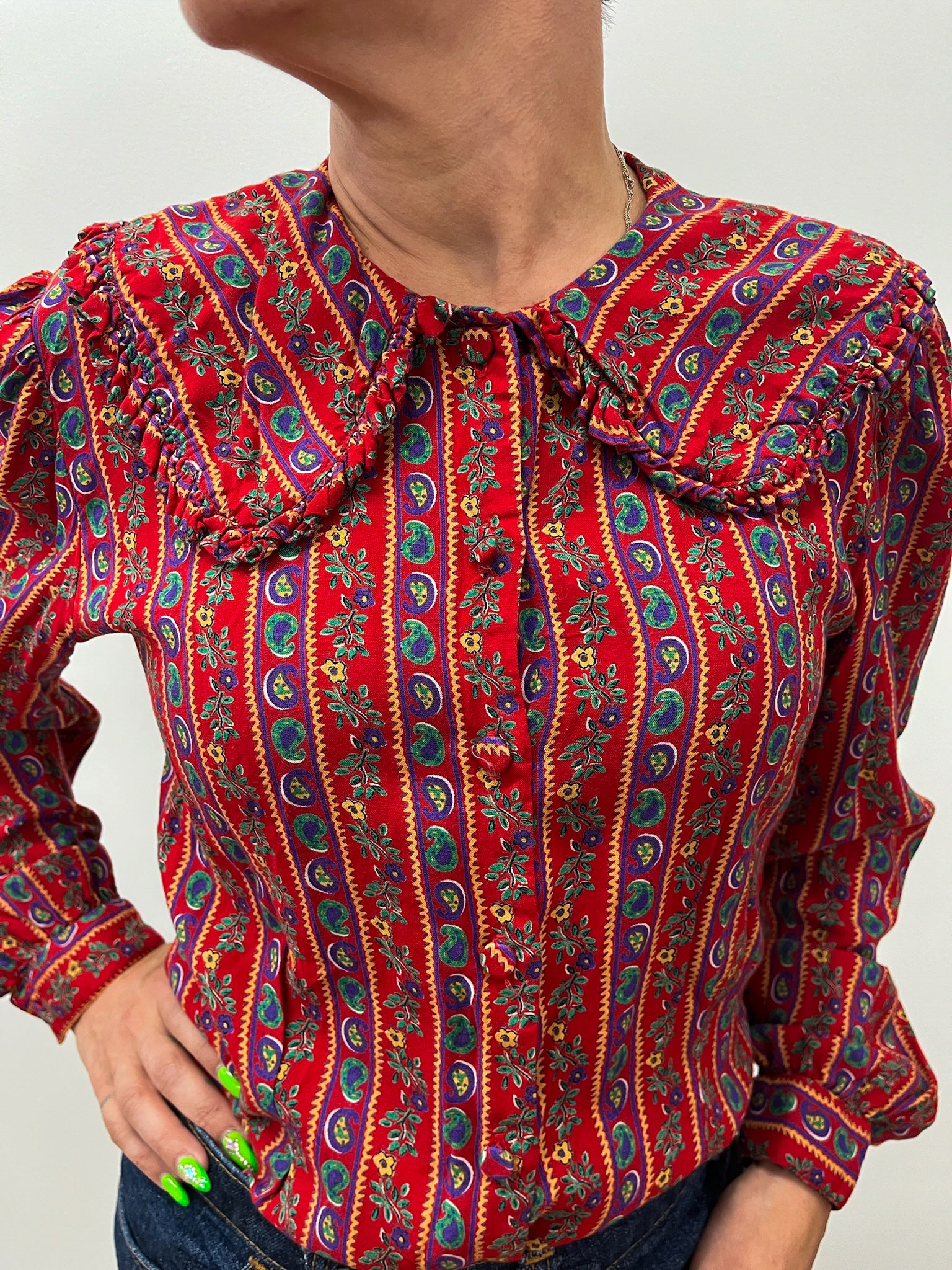 1980s Vintage Big Collared Paisley Floral Button Up Blouse