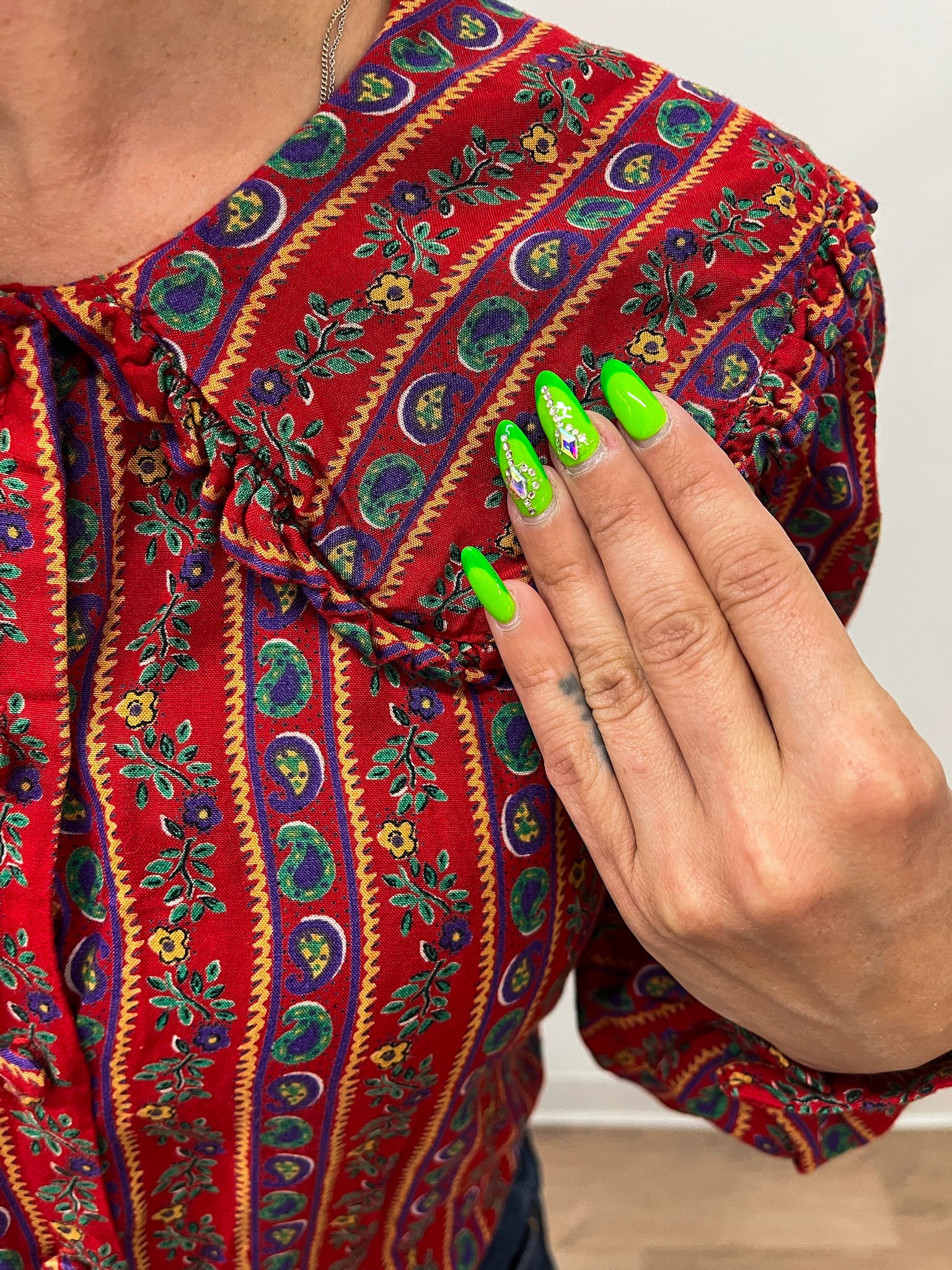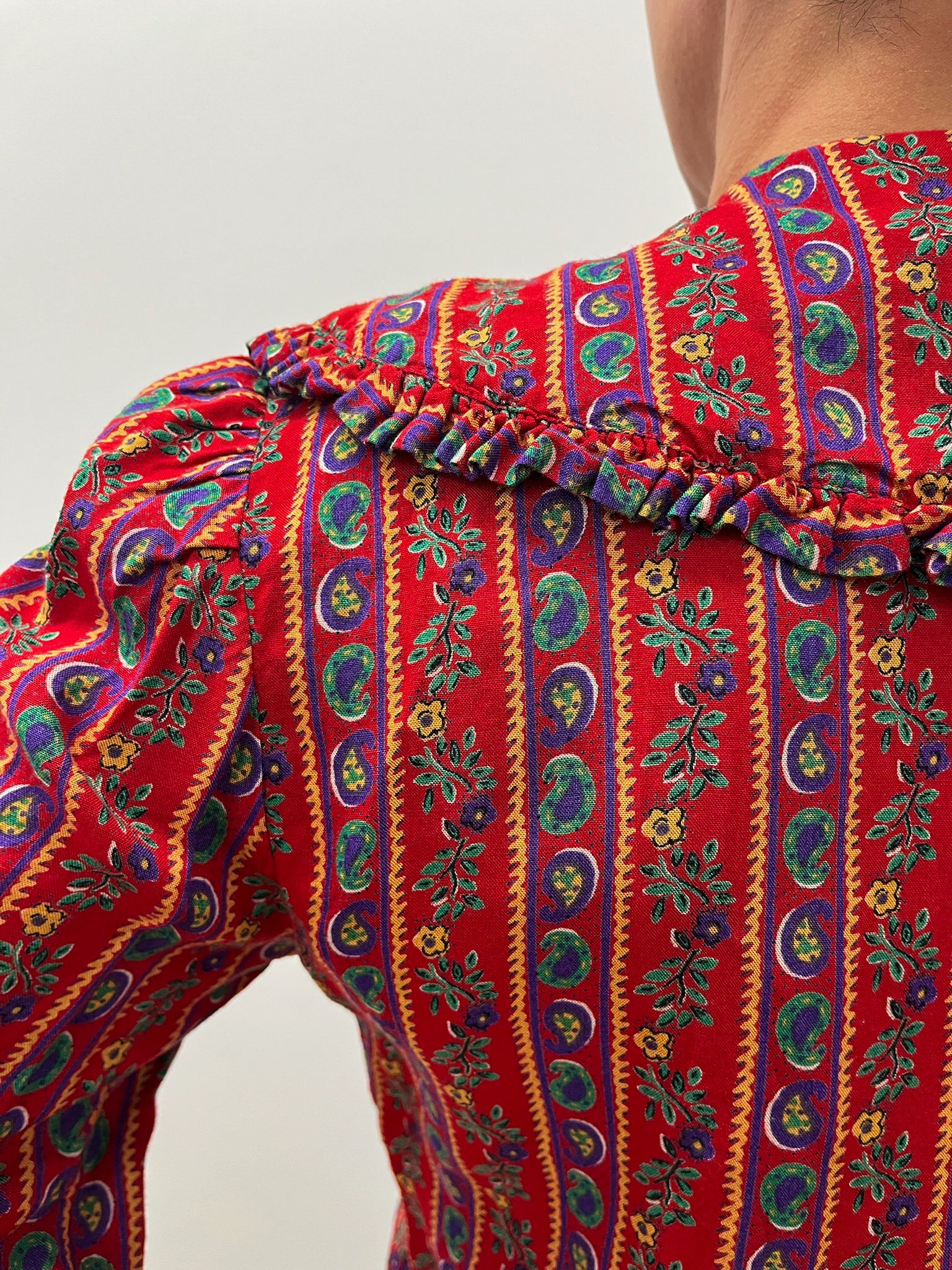 Lovely vibrant paisley and floral striped blouse with an awesome big ol collar, circa 1980s.