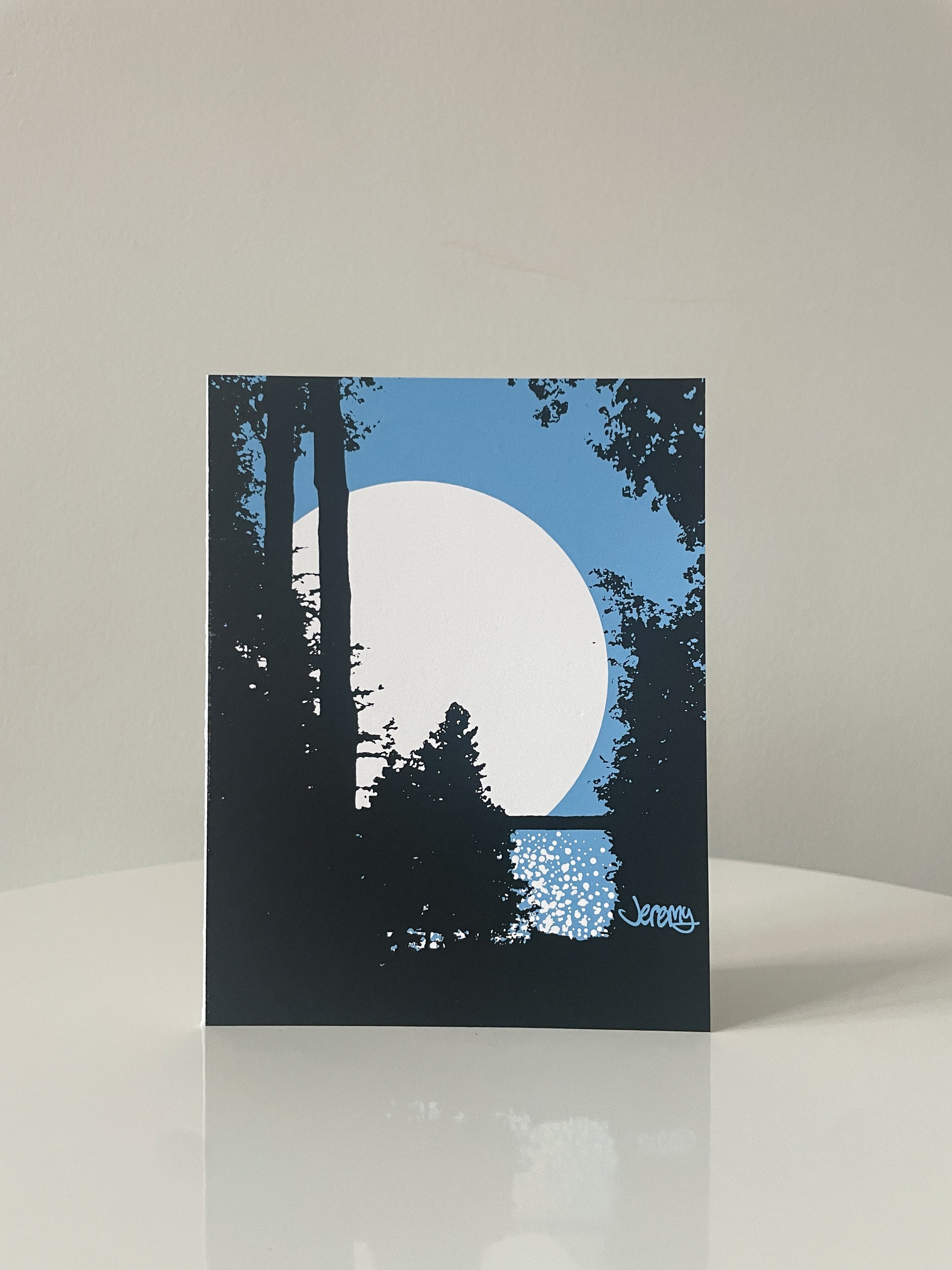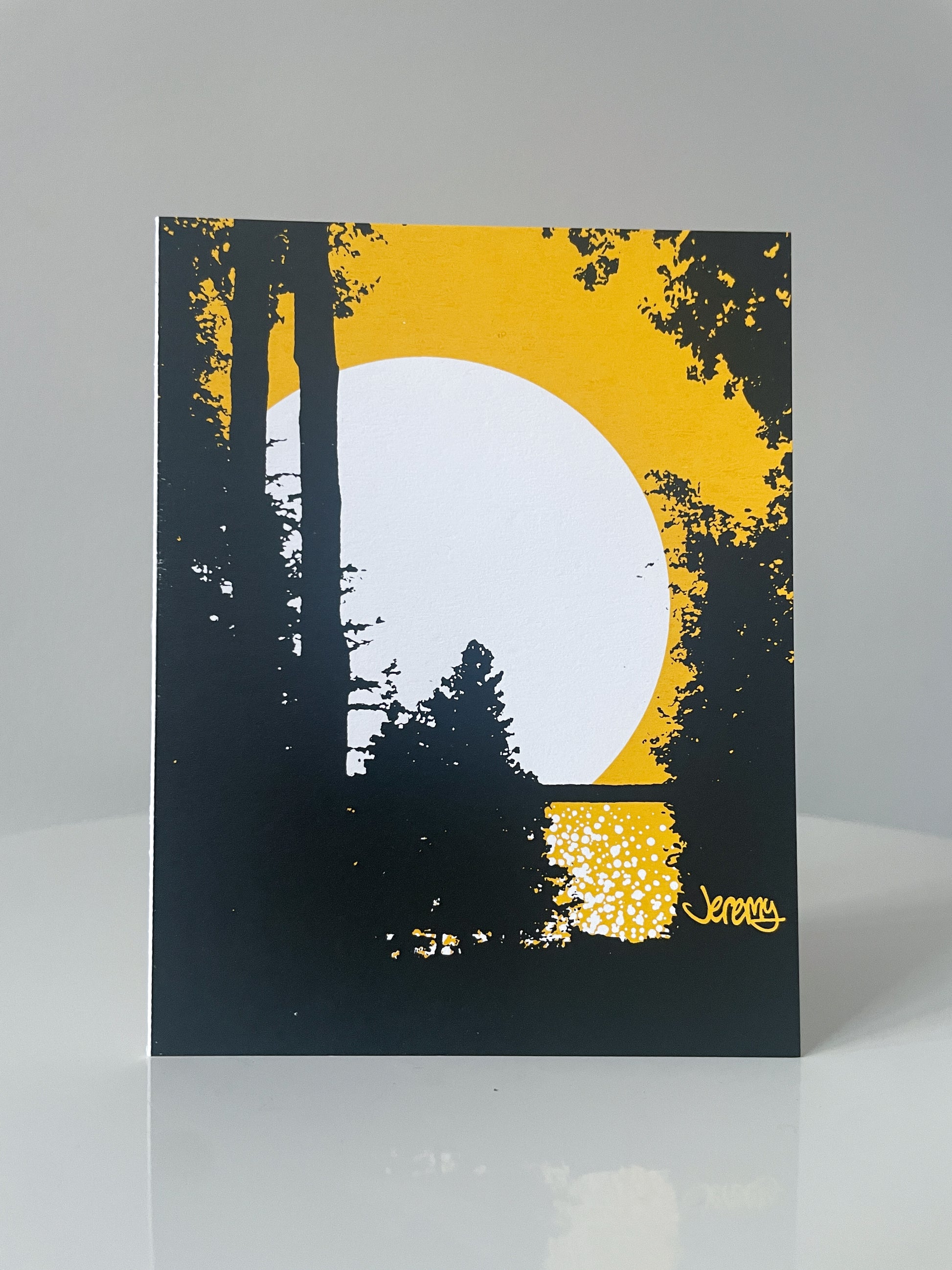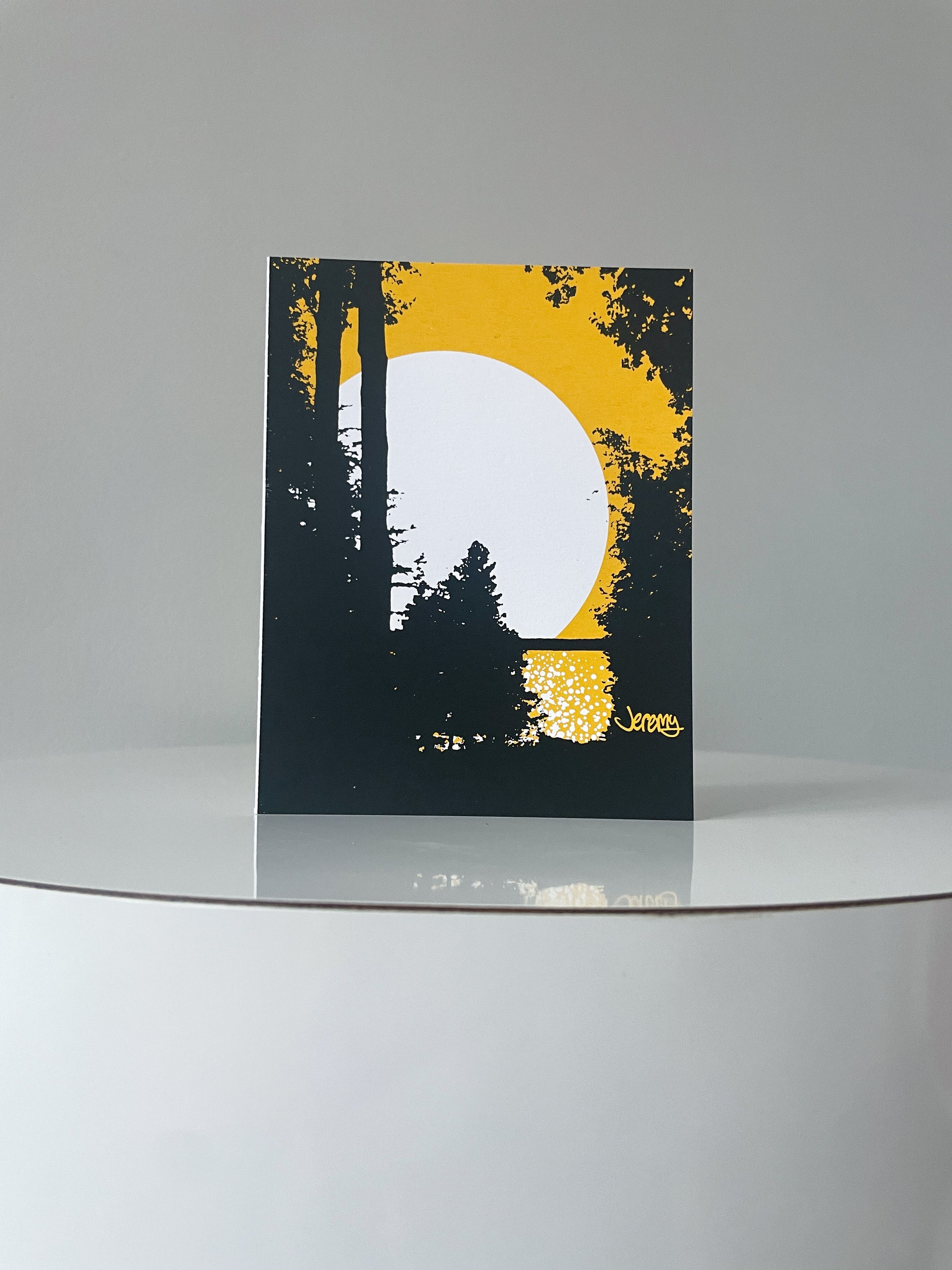 Screenprinted card of a lovely lakeside scene with large sunset over trees & a shimmering lake, by local Ann Arbor legendary poster artist Jeremy Wheeler. 4" x 5.5", choose from blue or yellow. Individually packaged, blank inside for your message.