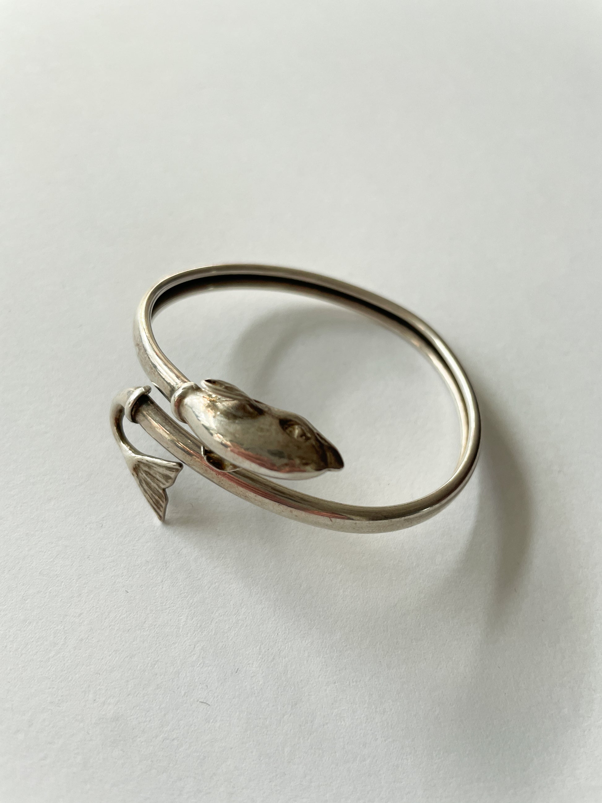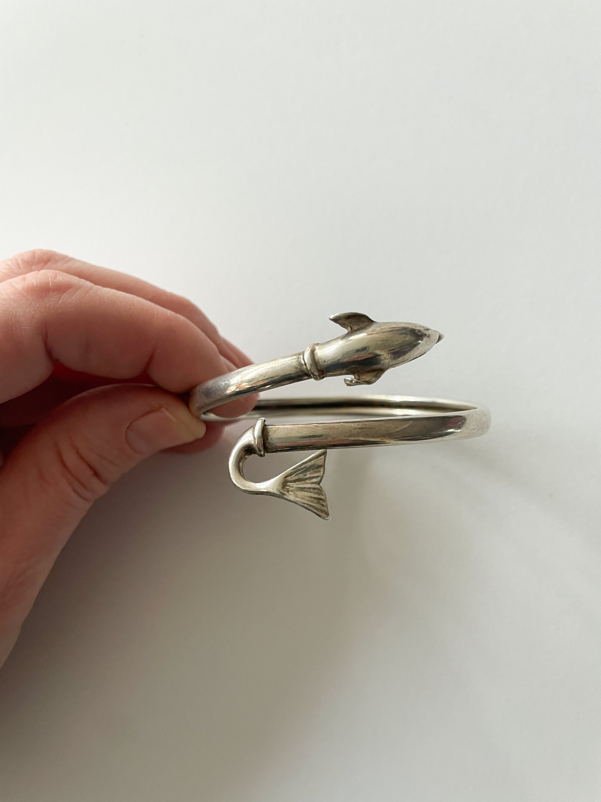 1990s Vintage Sterling Silver Dolphin Wrap Around Cuff Bracelet